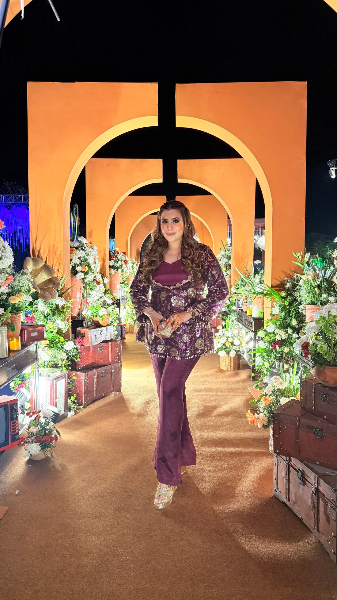 Description Stylish Violet Banarasi Set with a beautifully Banarasi Blazer 🌟. The ruffled dhoti and...