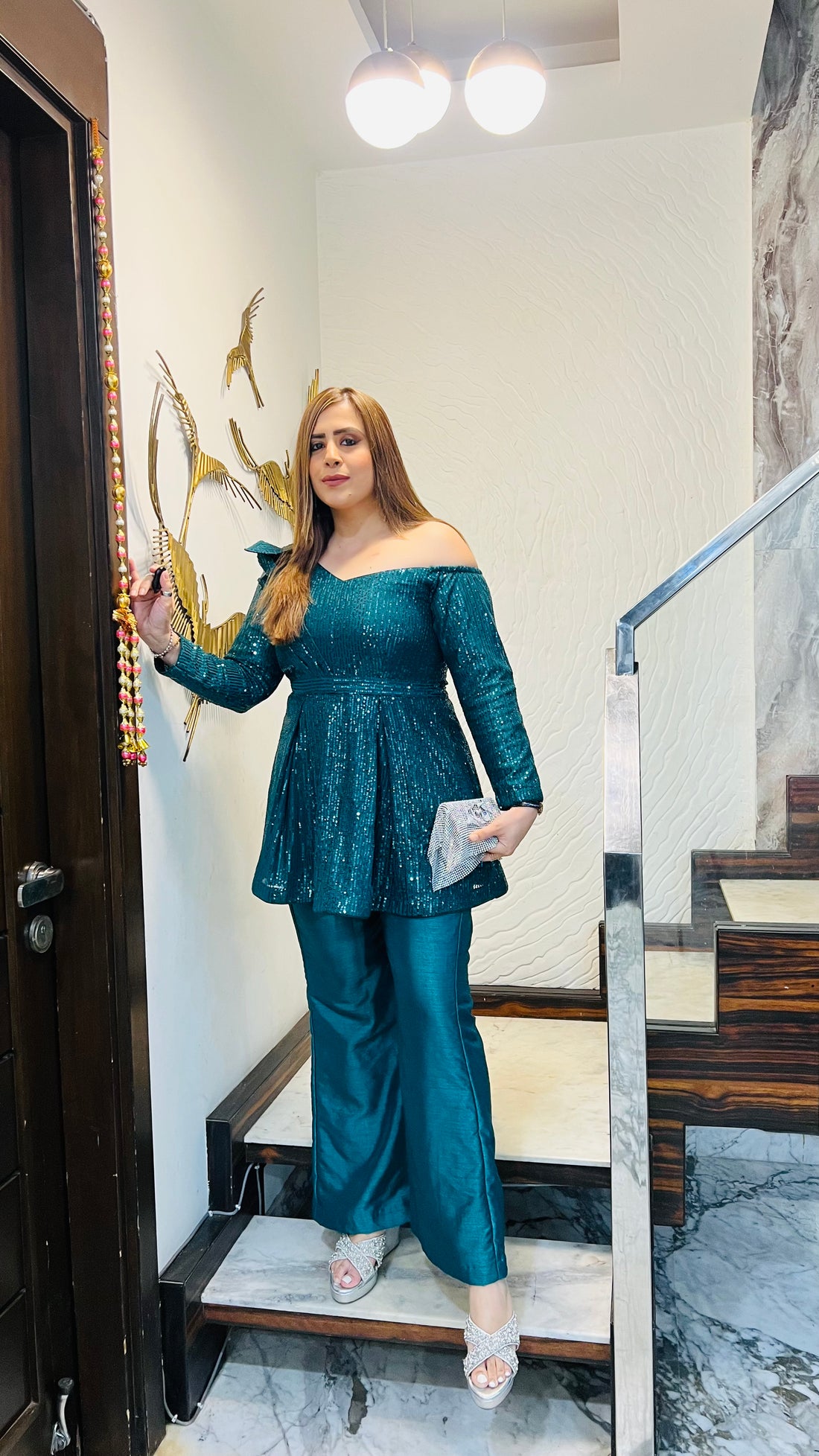 Description A glamorous Forest Green sequin co-ord with an off-shoulder top and flared pants 🌟✨....