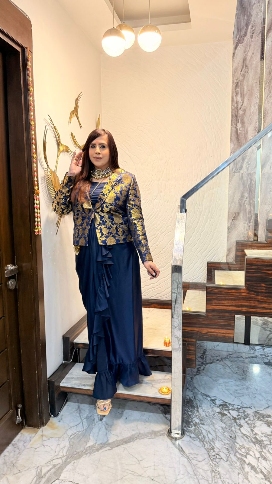 Description Stylish navy blue Banarasi dhoti set with a beautifully Banarasi Blazer 🌟. The ruffled...