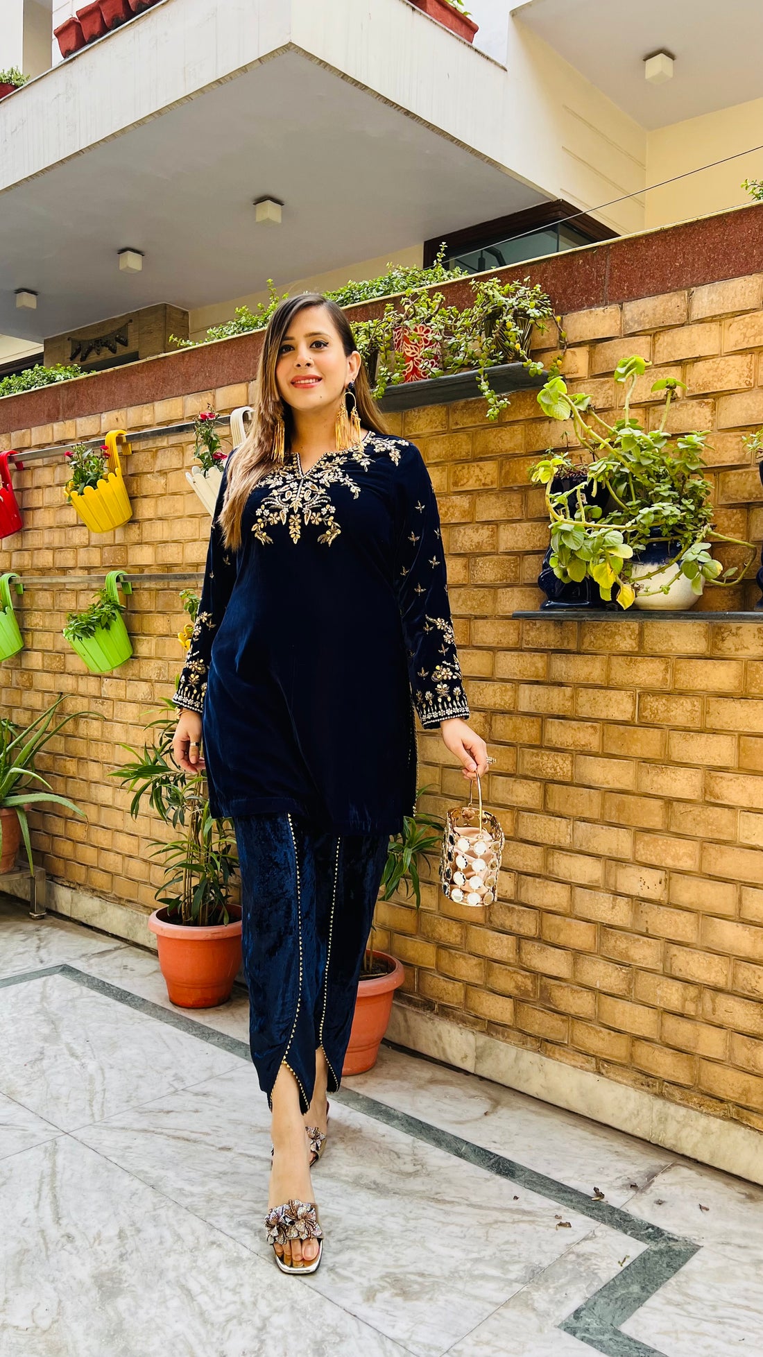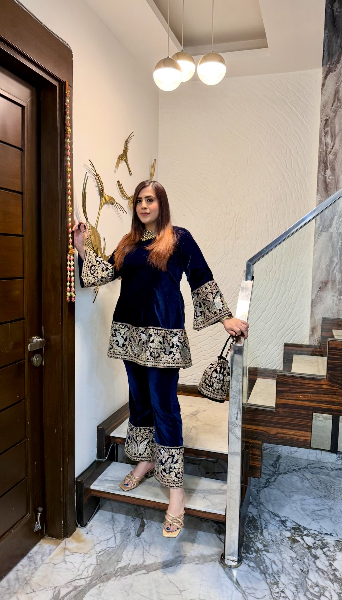 Description This elegant Navy Blue velvet co-ord set 🖤 features intricate golden embroidery ✨ paired...