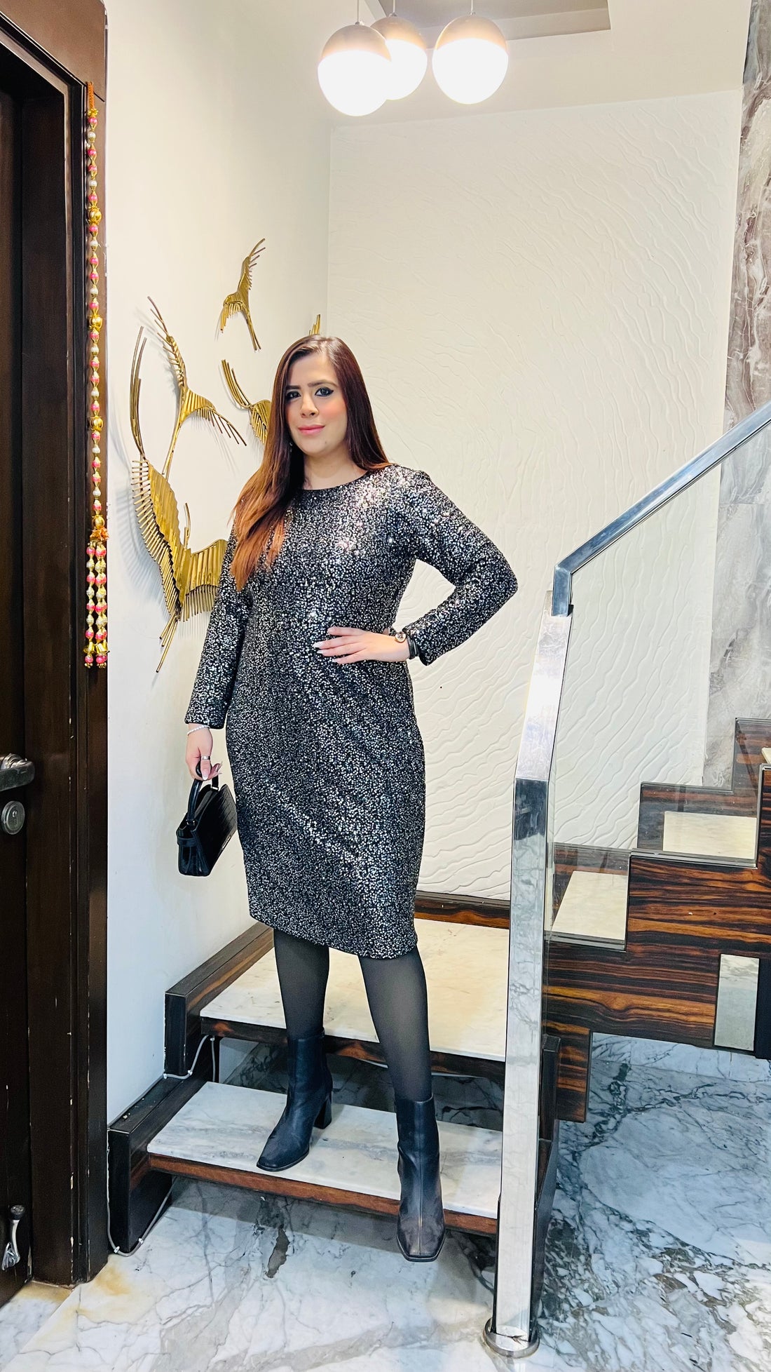 Description Radiant midnight sequin midi dress with full sleeves and a crew neckline. Paired with...