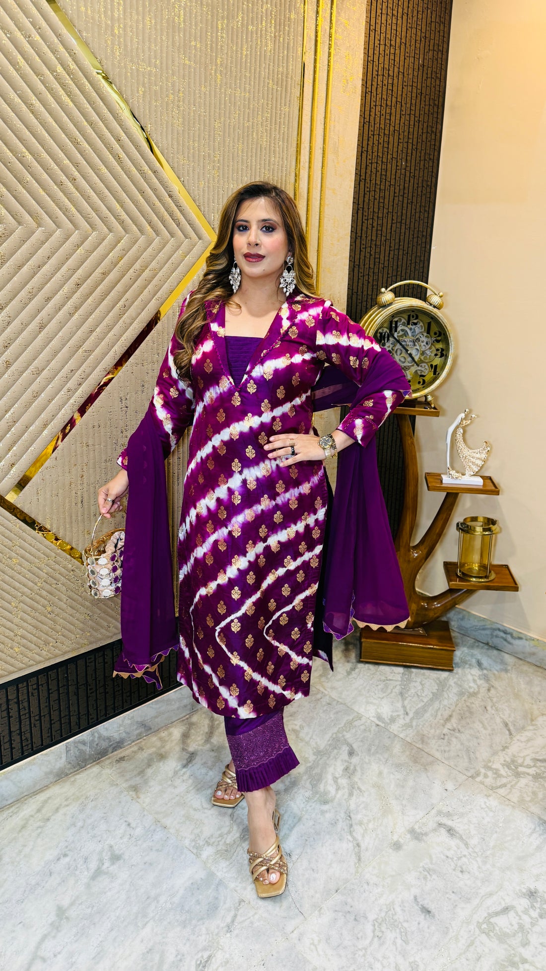 Description  This graceful ethnic ensemble features a rich purple kurta adorned with elegant gold...