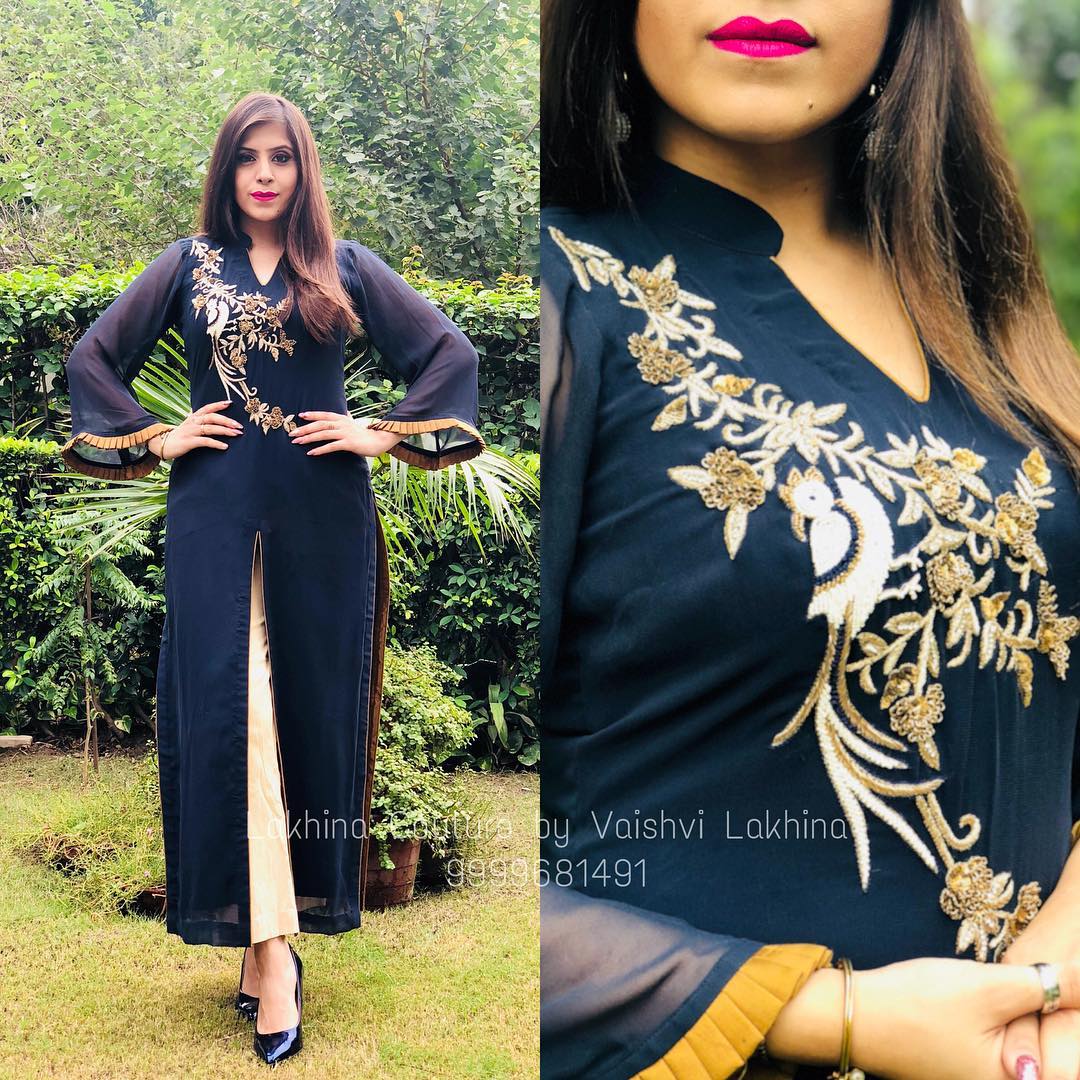 Collar neck to avoid dupatta and slits for a chicer look. .