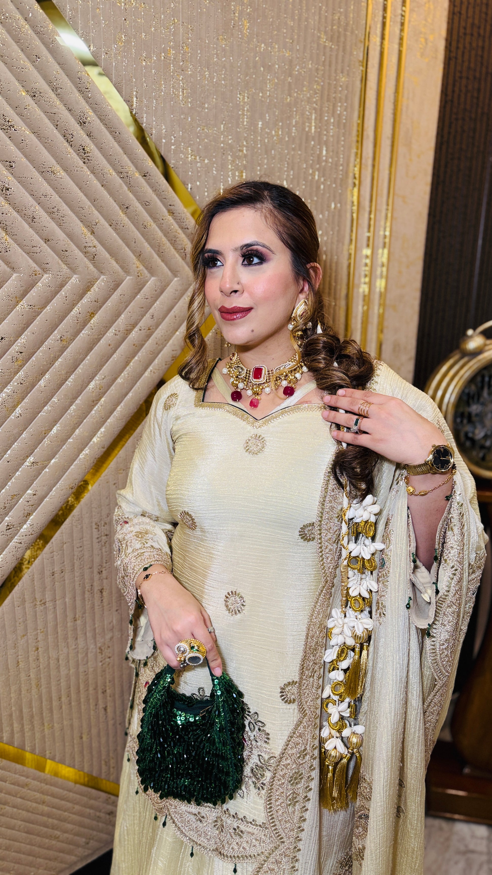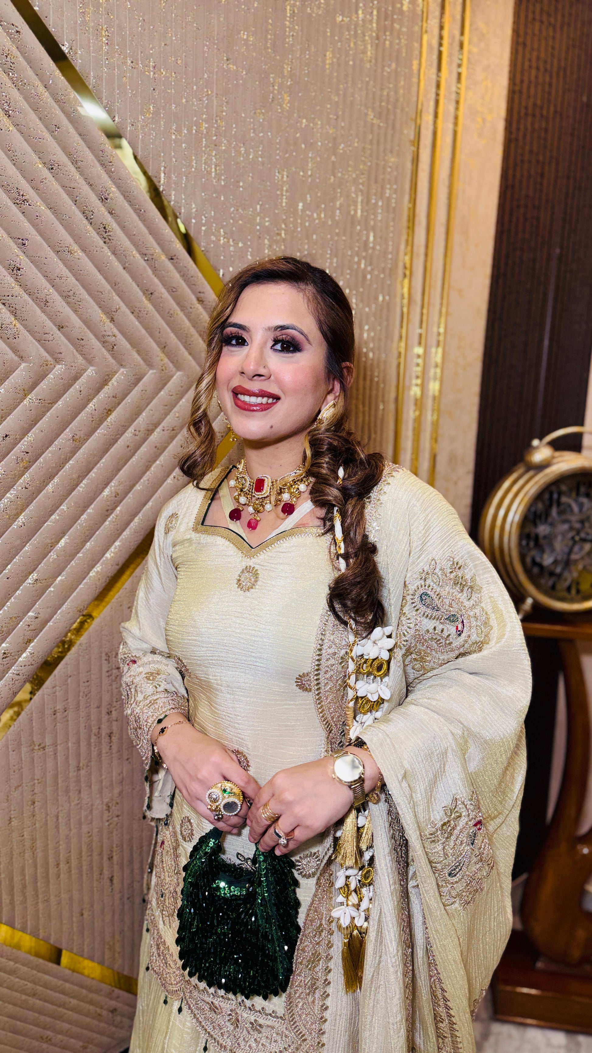 | Description | This elegant Off-white Lehanga set is crafted in a finely textured fabrics offering comfort with refined luxury. Detailed with delicate and traditional the silhouette feels timeless yet contemporary. The ensemble is paired with a scalloped dupatta featuring intricate borders and tassel accents, adding movement and charm. Complemented by coordinated flared bottoms, this outfit is ideal for festive gatherings, wedding functions, and special celebrations. A perfect choice for those who appreciate understated glamour, artisanal detailing, and effortless sophistication in ethnic wear |