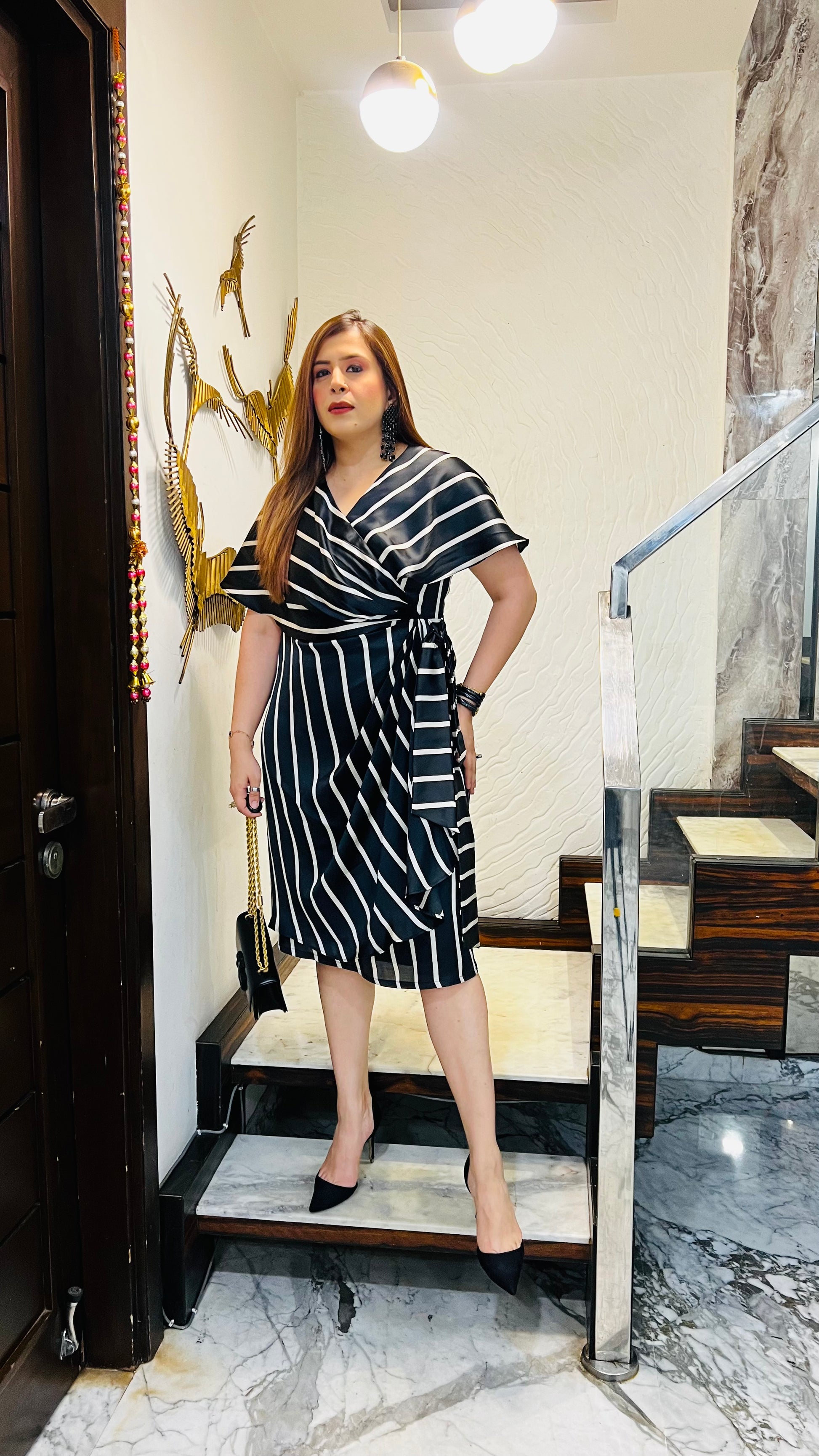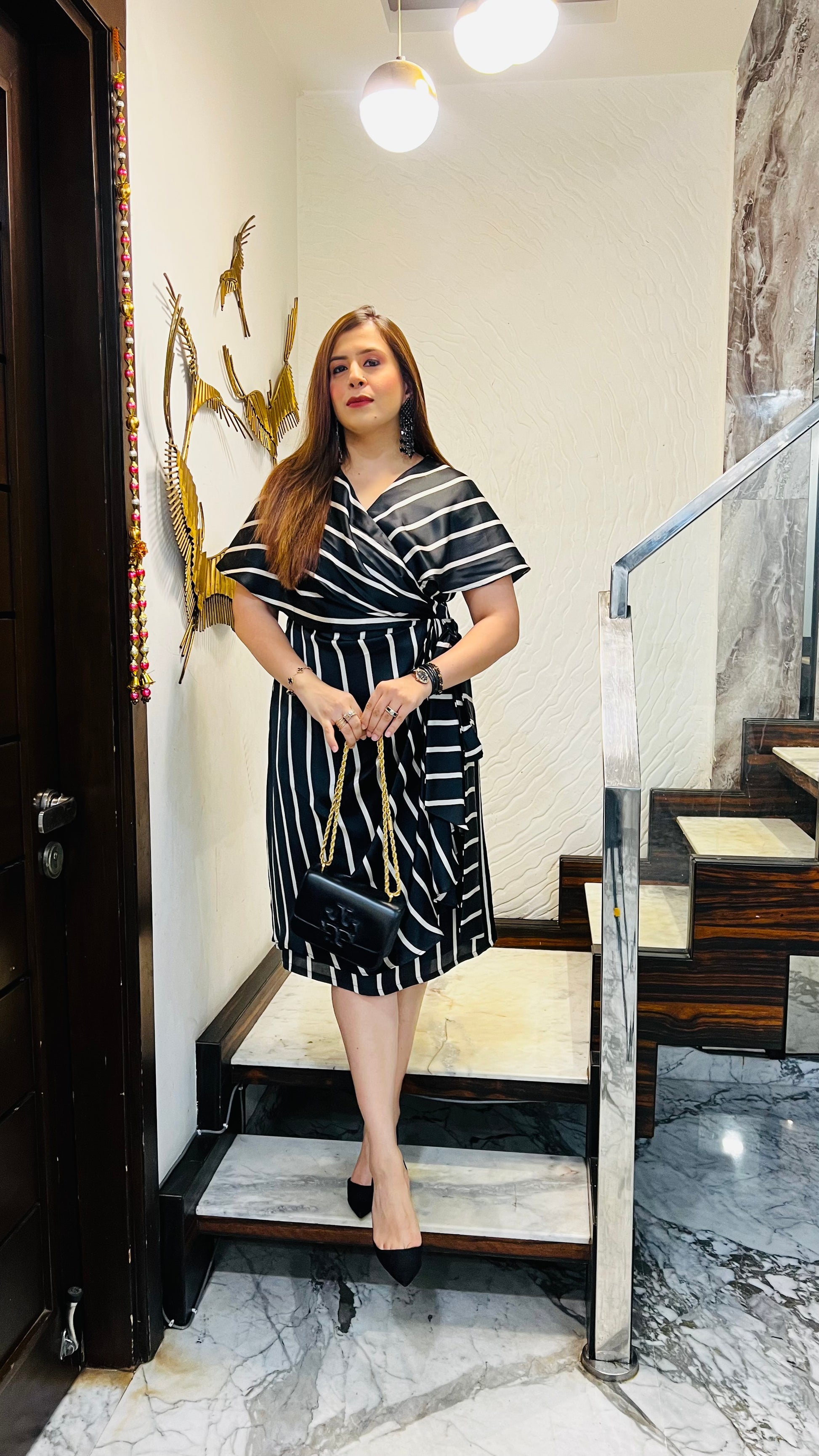 The Black Drape Midi 🖤 is a chic V-neck dress with bold white stripes ➖, asymmetric draped overlay 🤍, side waist tie 🎀, short flowy sleeves, and a sleek midi length 👠—perfect for elegant evenings! ✨ |