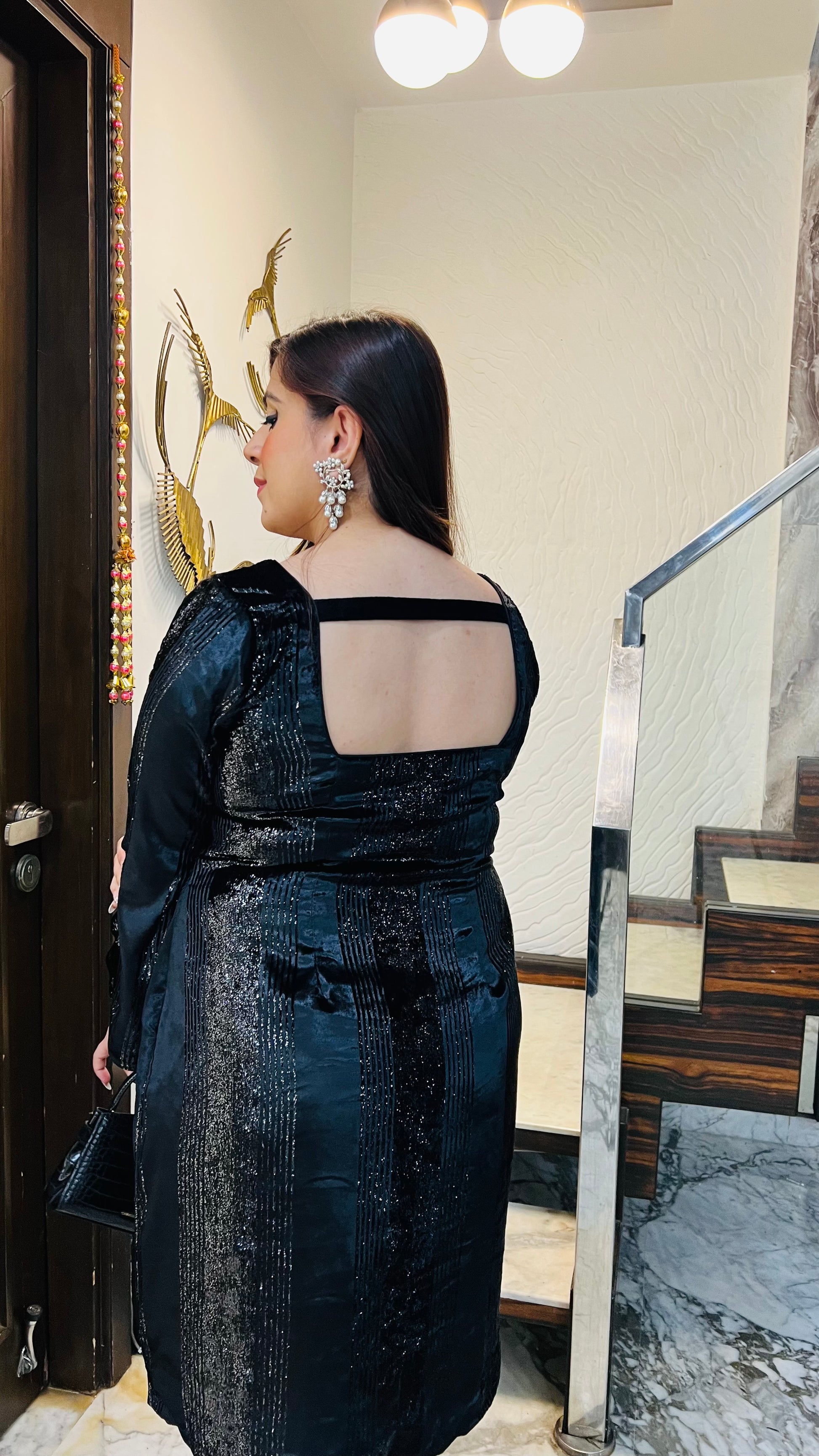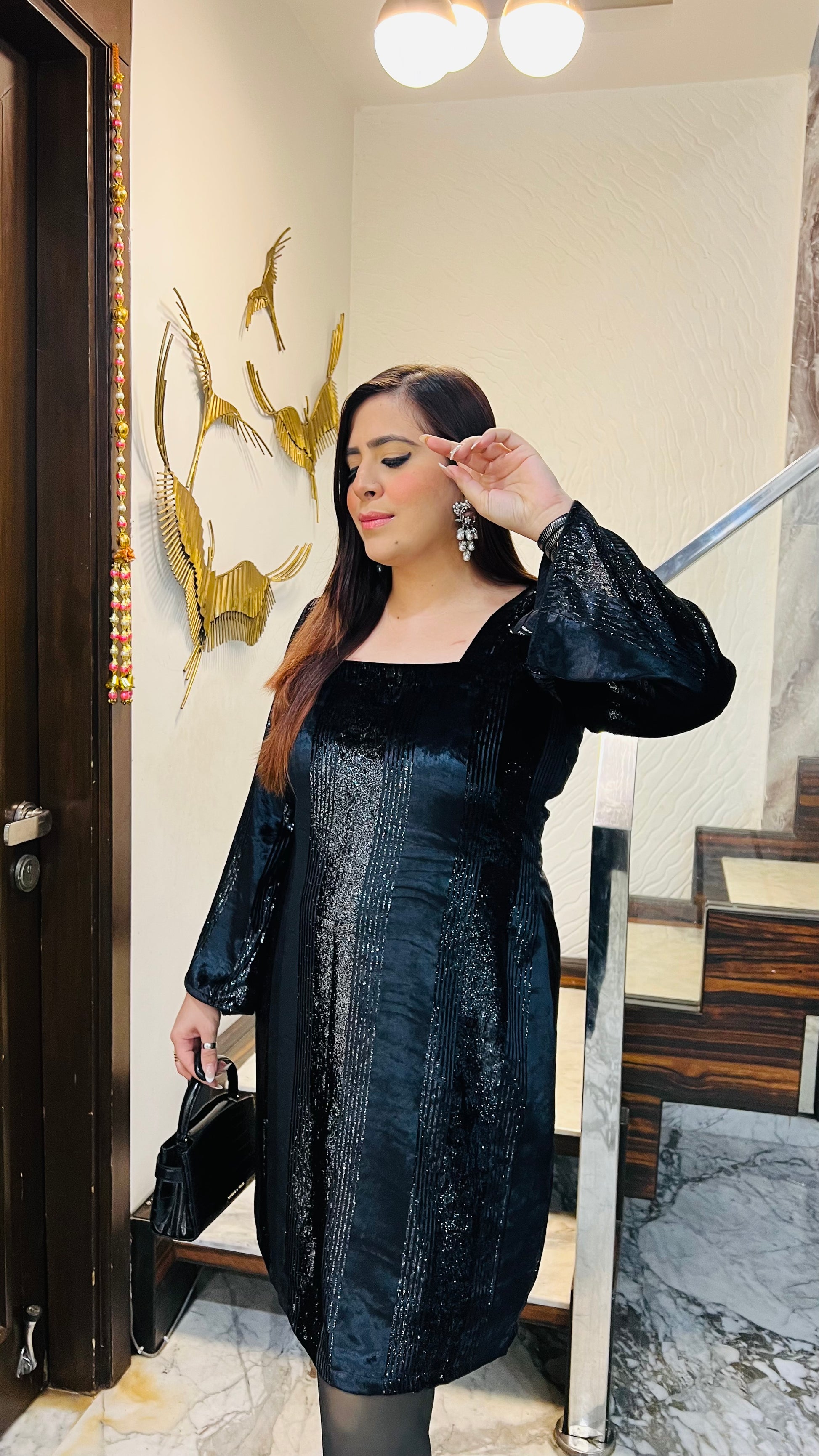 Elegant black foil velvet dress with a square neckline, long flared sleeves, and shimmering patterns. Styled with black tights, boots, and a mini bag for a chic look. ✨🖤 |