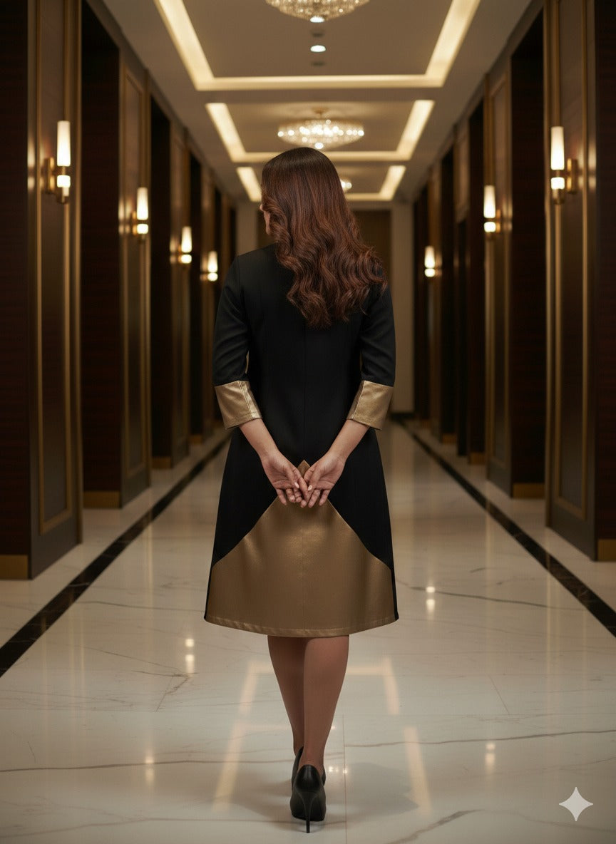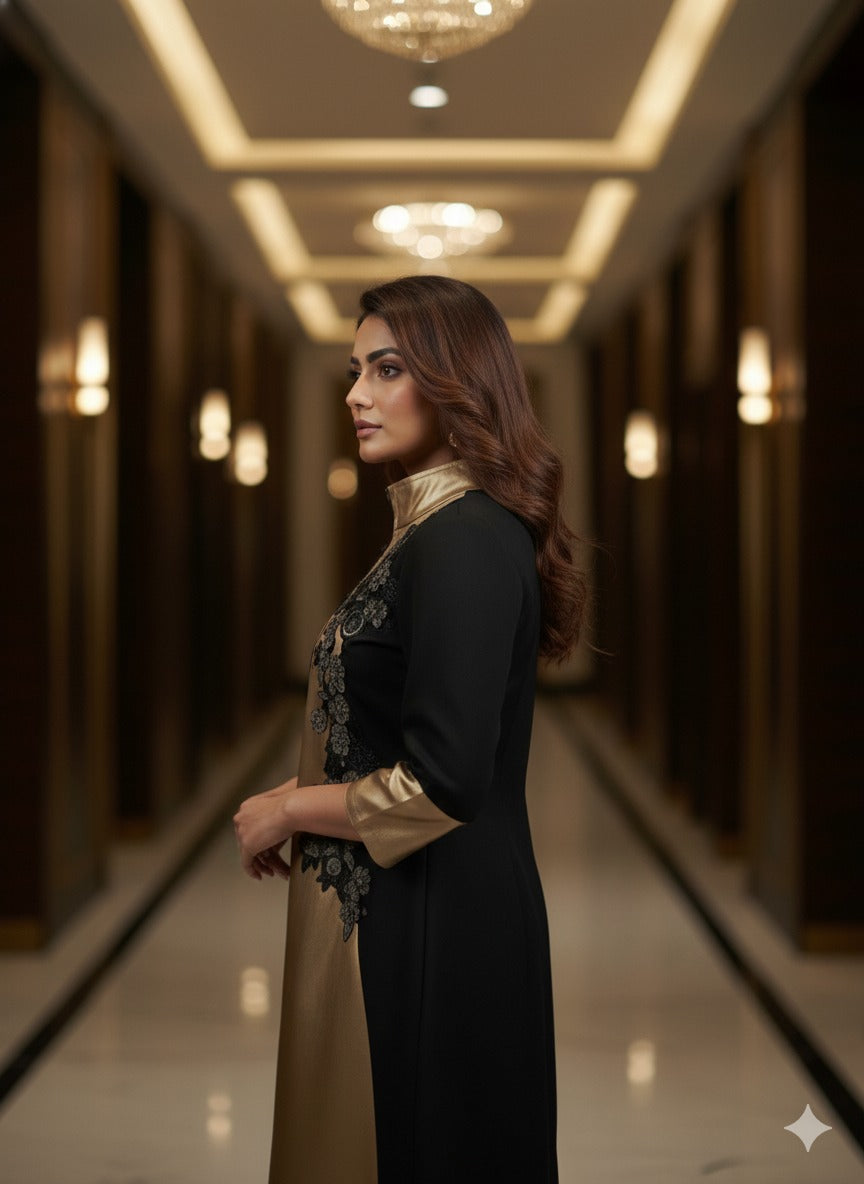 | Description | Step into elegance with this black and gold party dress, crafted in premium leather-look fabric blended with banana lycra for comfort and stretch. Featuring hand-embroidered detailing, a full band collar, front zip closure, and 3/4th sleeves, it offers a structured silhouette—perfect for evening parties and special occasions. |