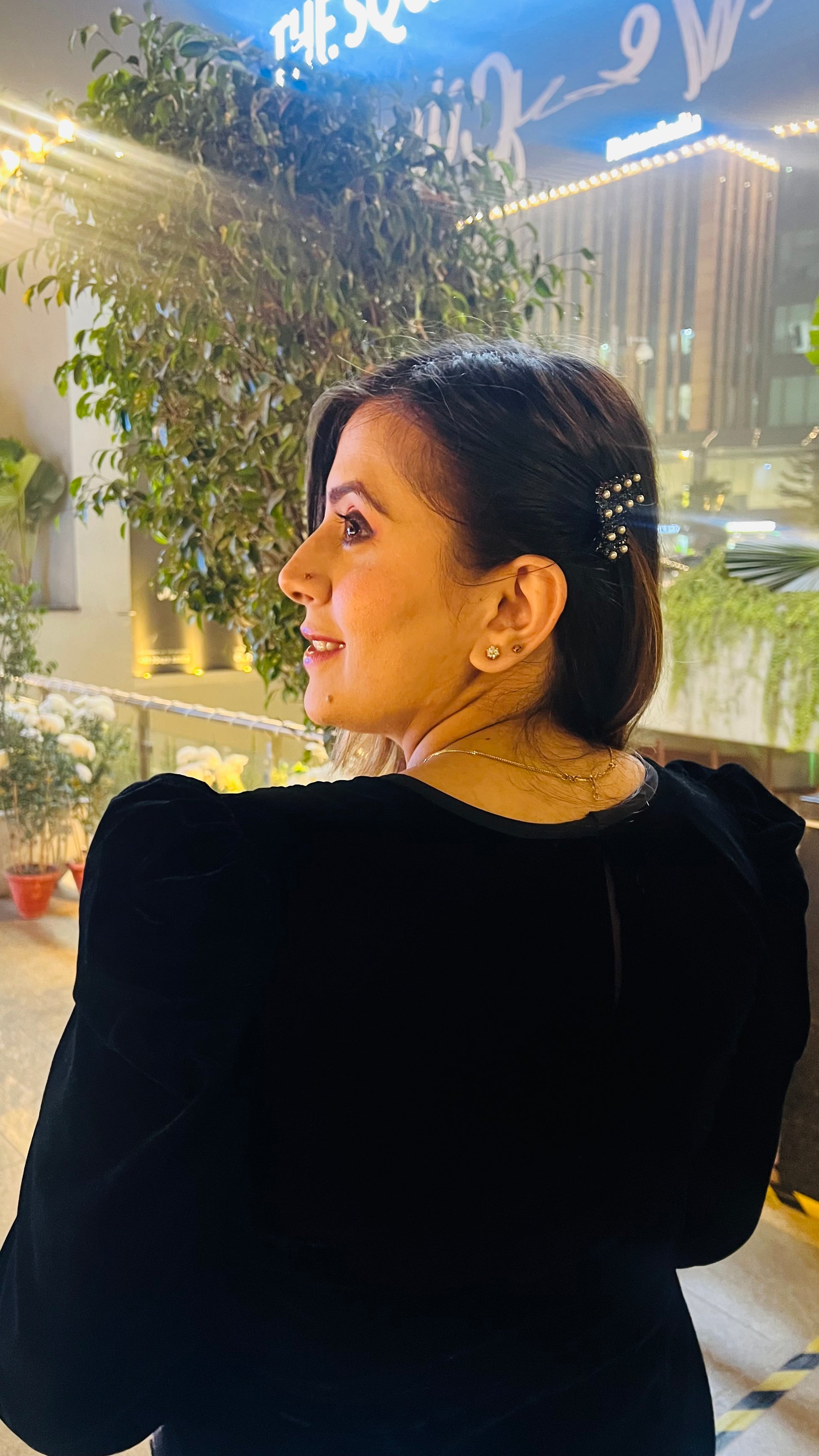 Elegance personified in every detail. Adorned in black velvet with intricate chain and net detailing on the neckline—a timeless statement of sophistication. ✨🖤 #VelvetChic #NecklineElegance |