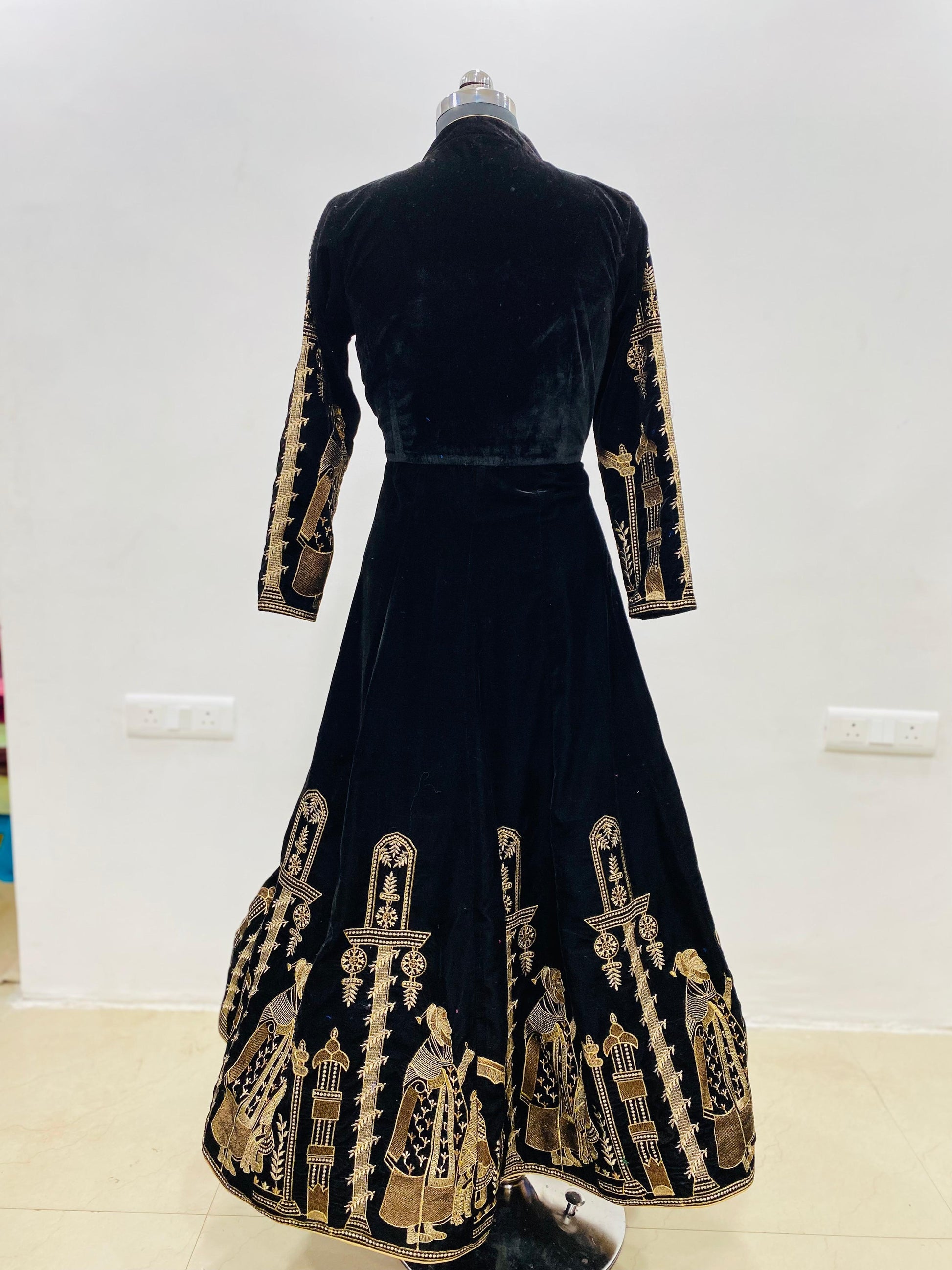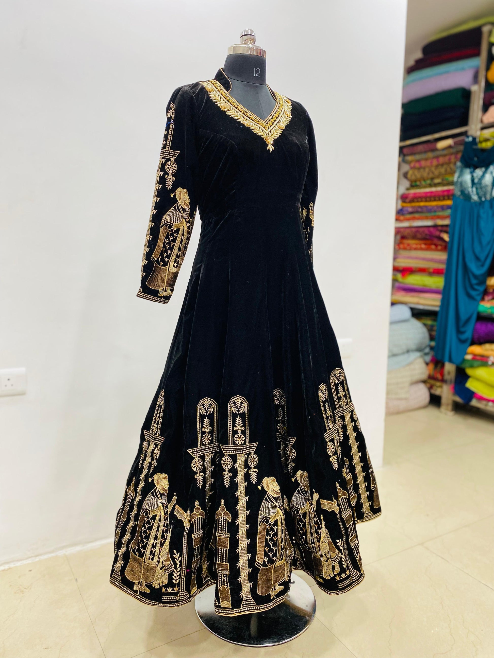 This black velvet Anarkali gown dazzles with golden embroidery✨, a regal V-neckline, and intricate cultural motifs on its flared hemline🎭. Perfect for weddings and celebrations🎉! |