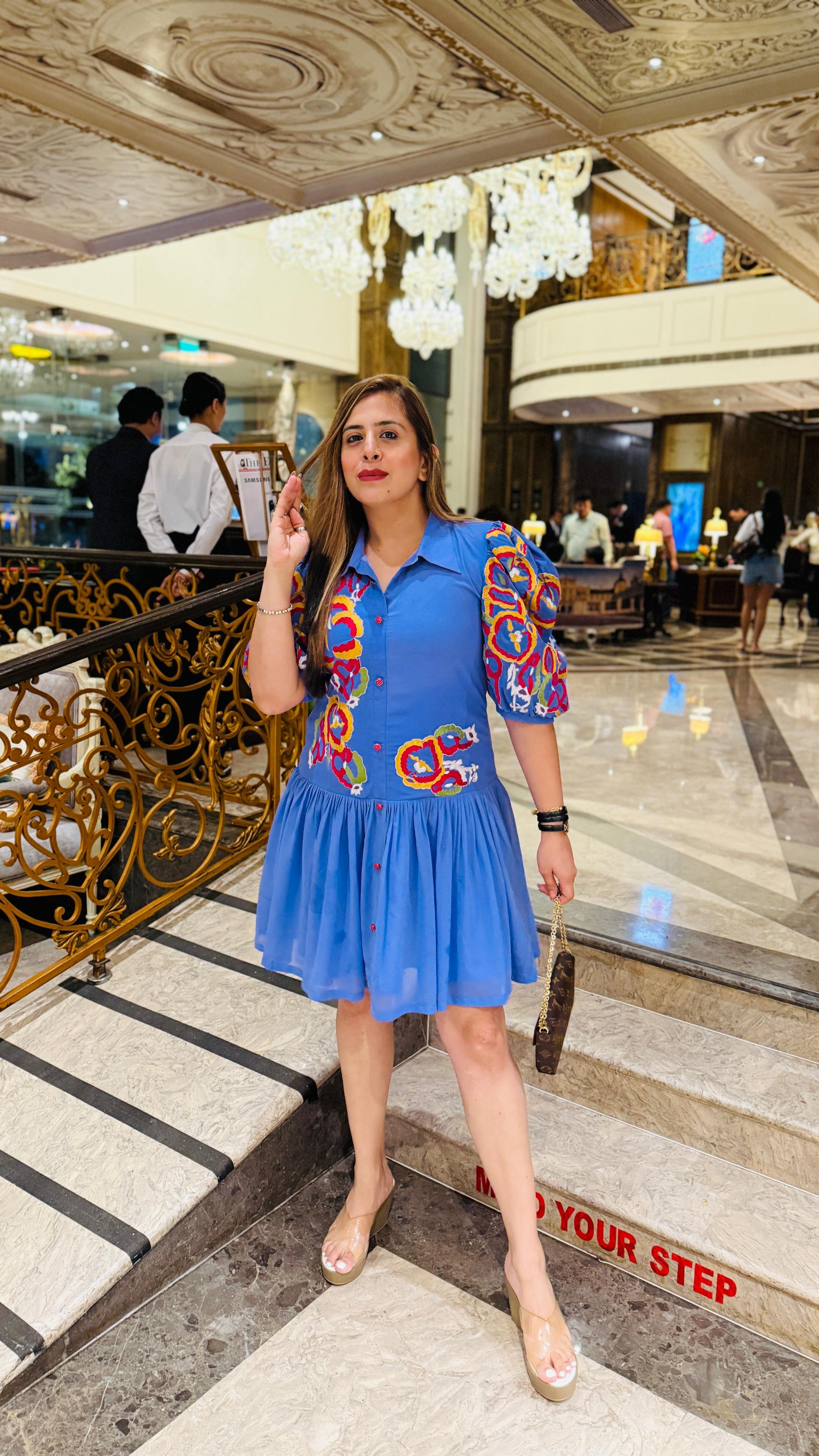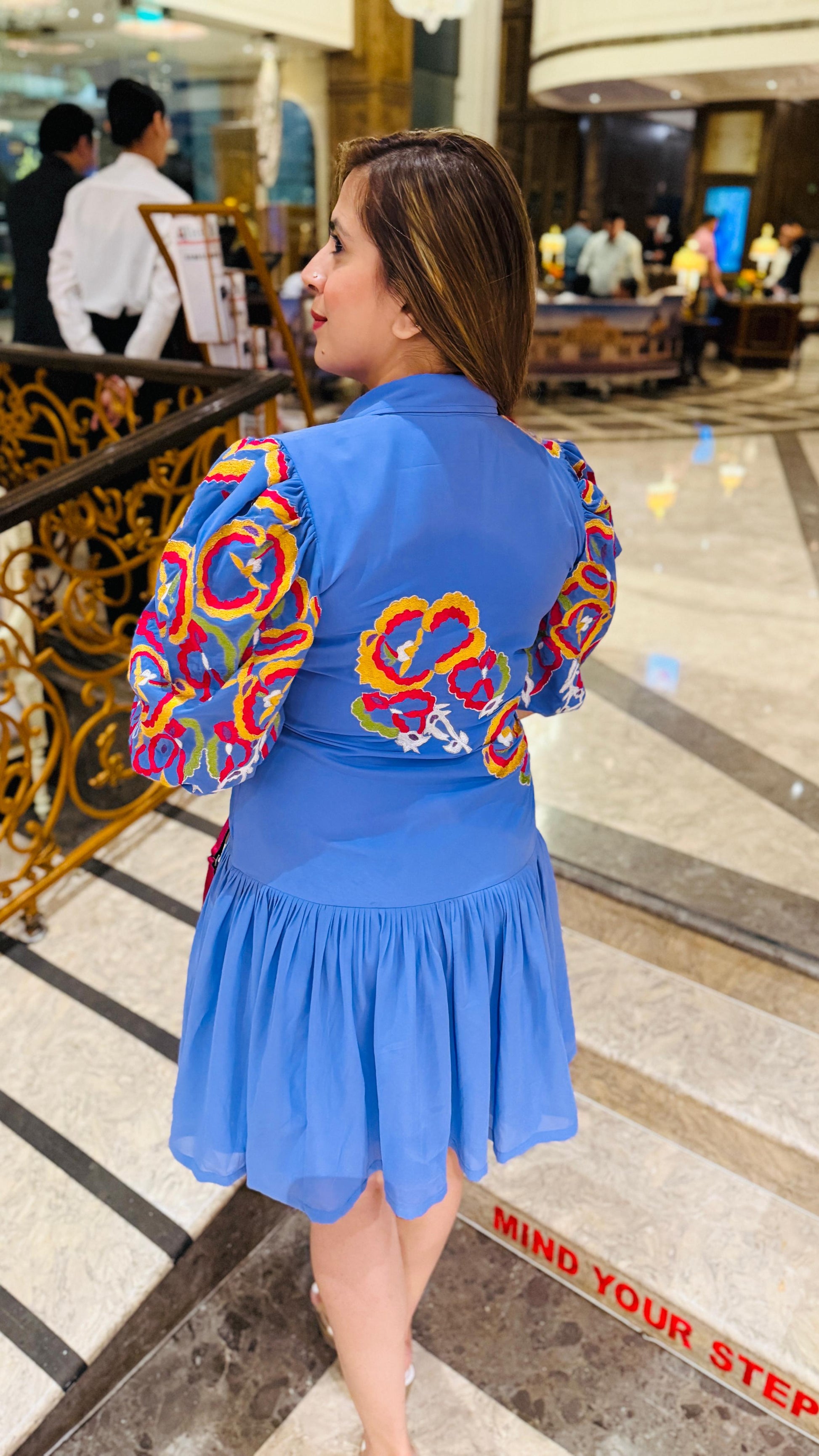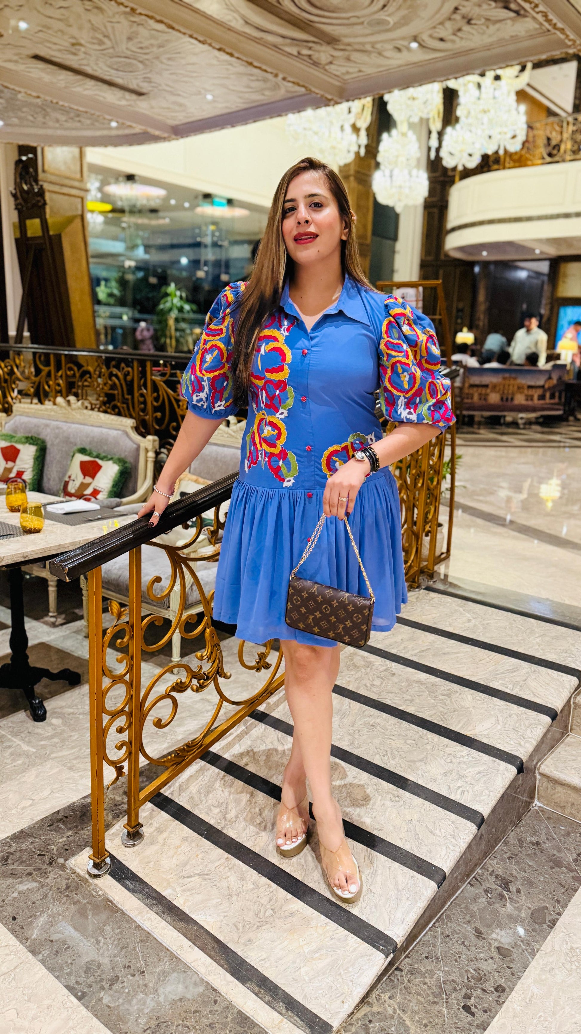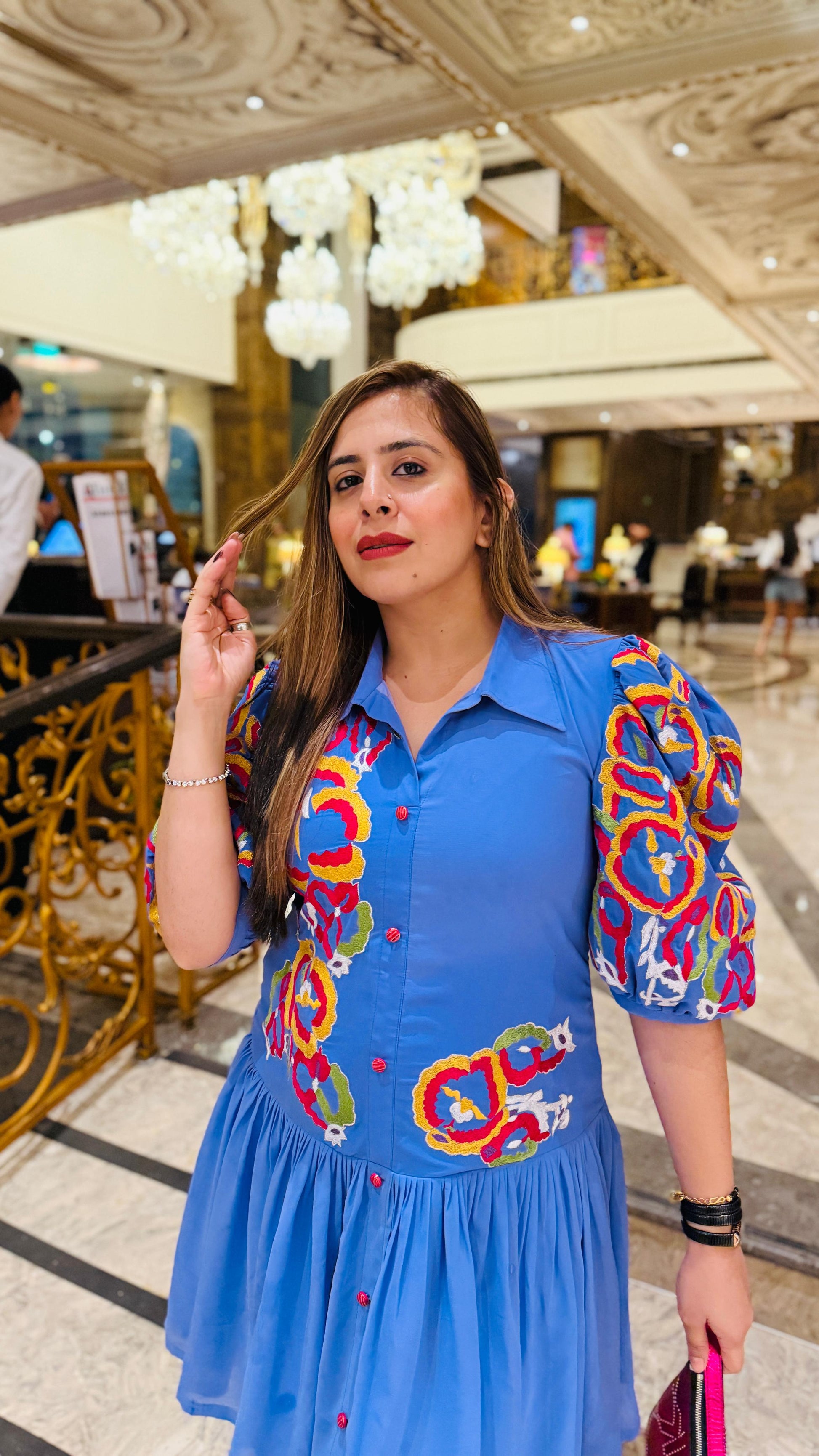 Shine in this Blue Birthday Embroidered Dress 🎉💙✨. Delicate floral embroidery 🌸, flared silhouette 👗, and charming details make it perfect for celebrations 🎂🥂. A dreamy outfit for unforgettable birthday moments 🎁🎀.