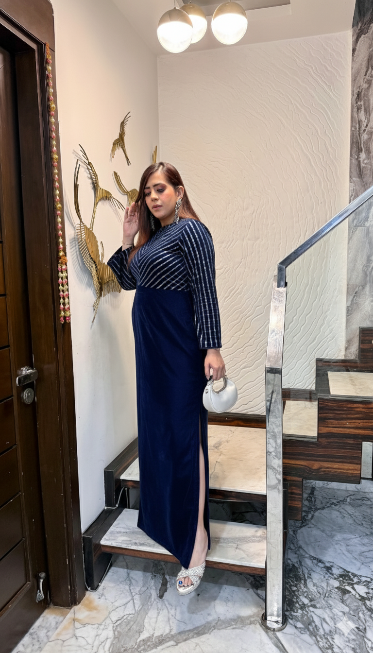 This elegant Navy Blue velvet gown boasts a striped bodice and sleek silhouette, exuding sophistication and charm. Perfect for evening parties, it pairs luxury with comfort effortlessly. ✨ðŸ·ðŸ’ƒ |