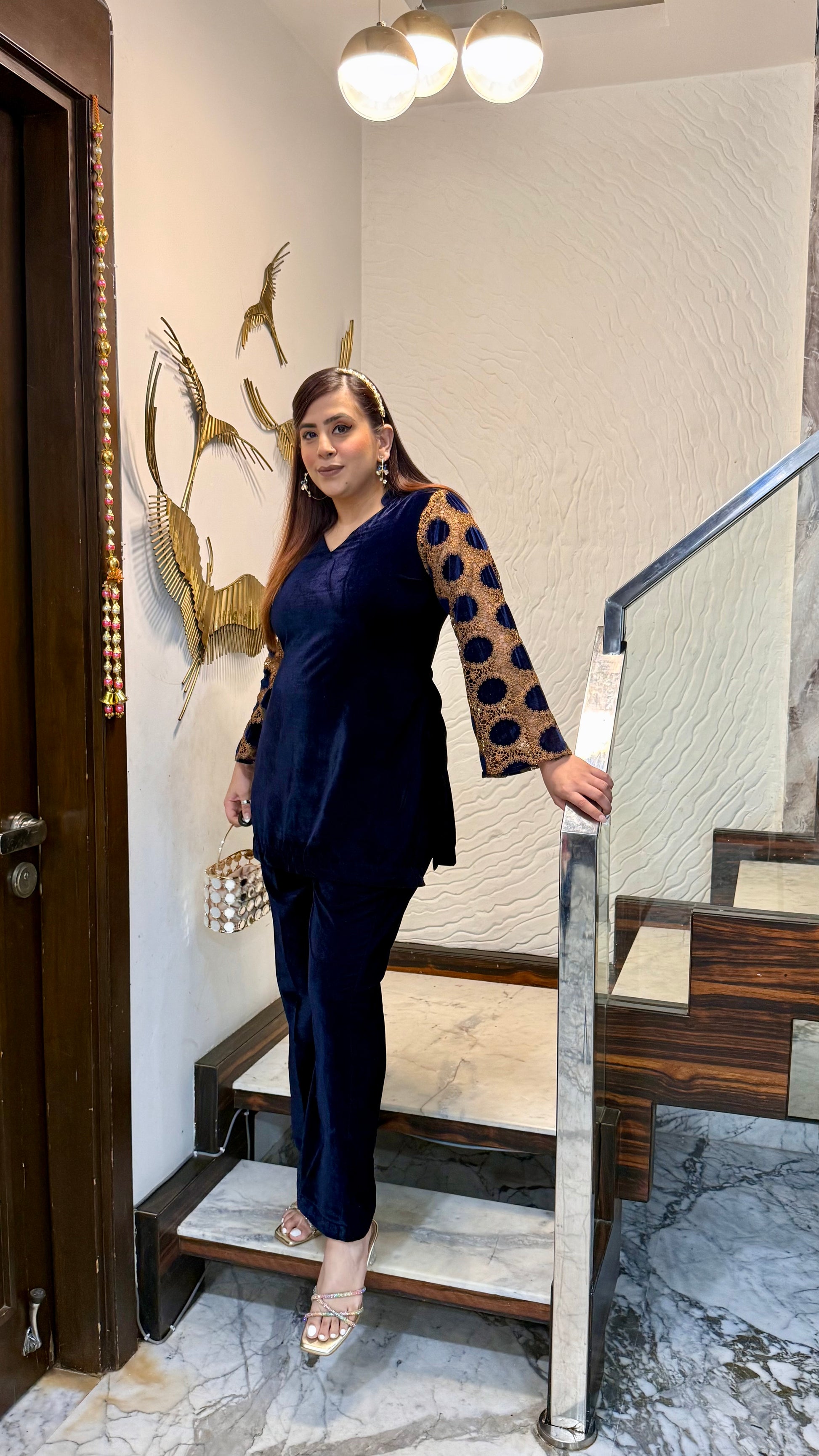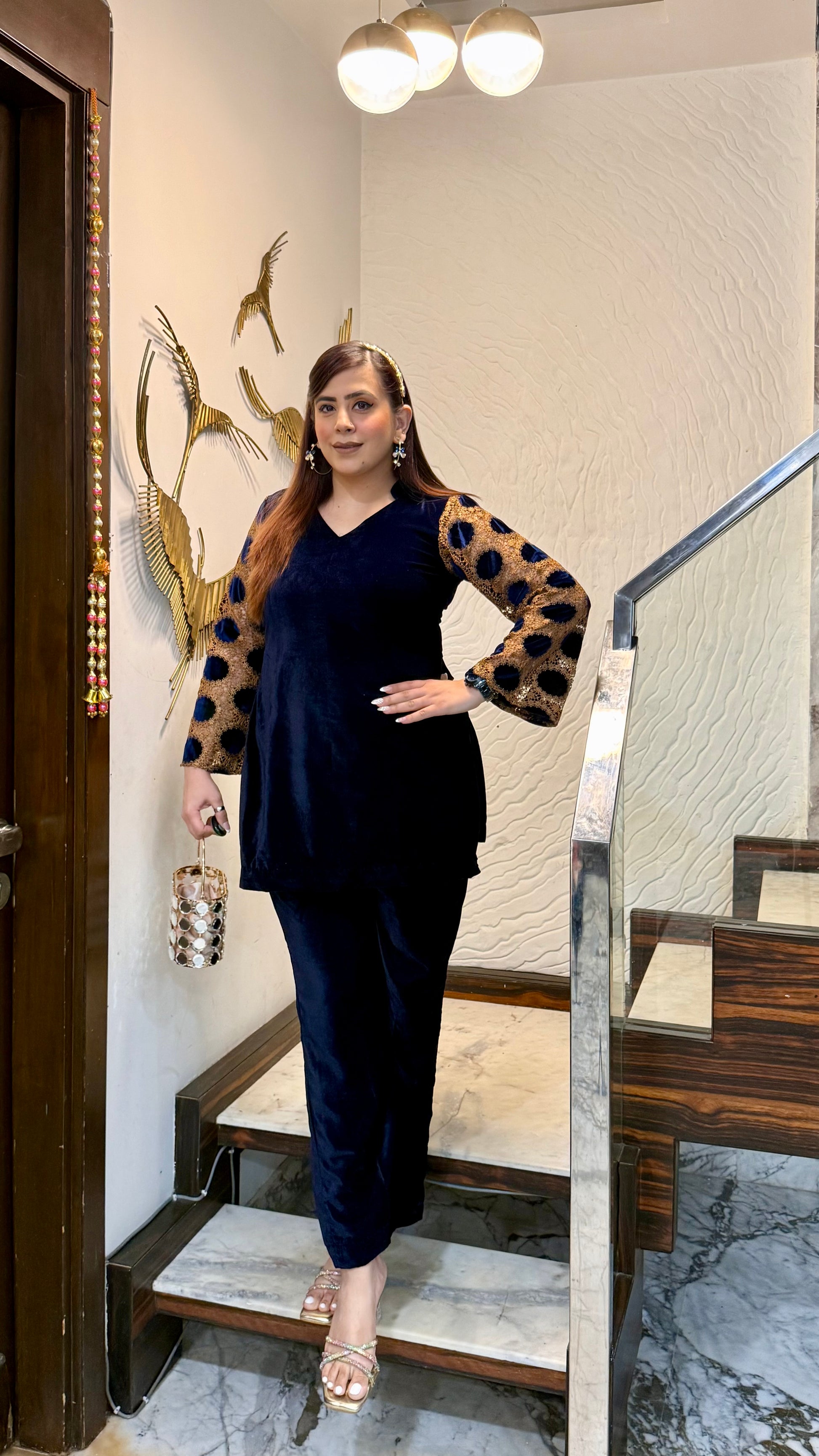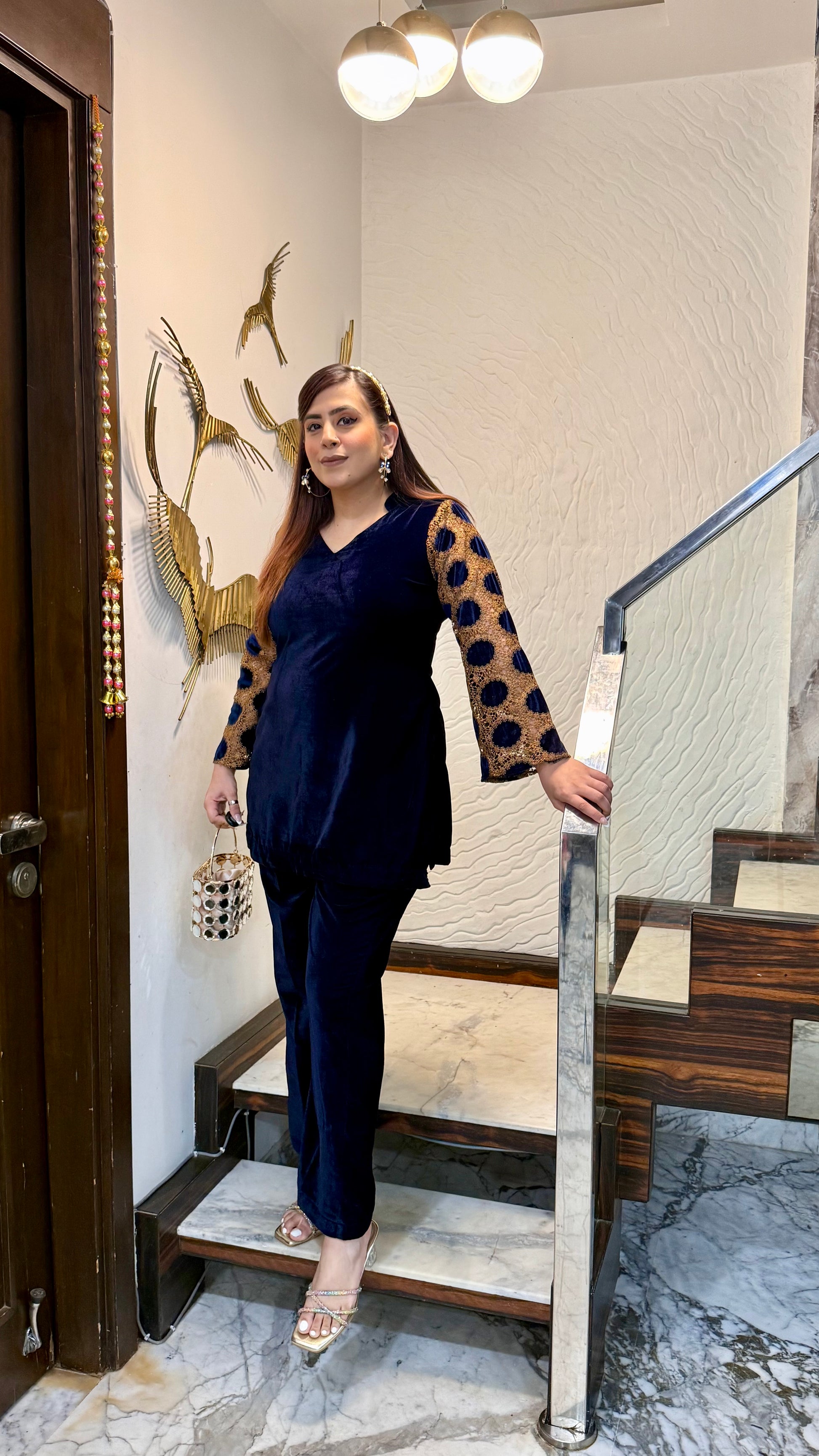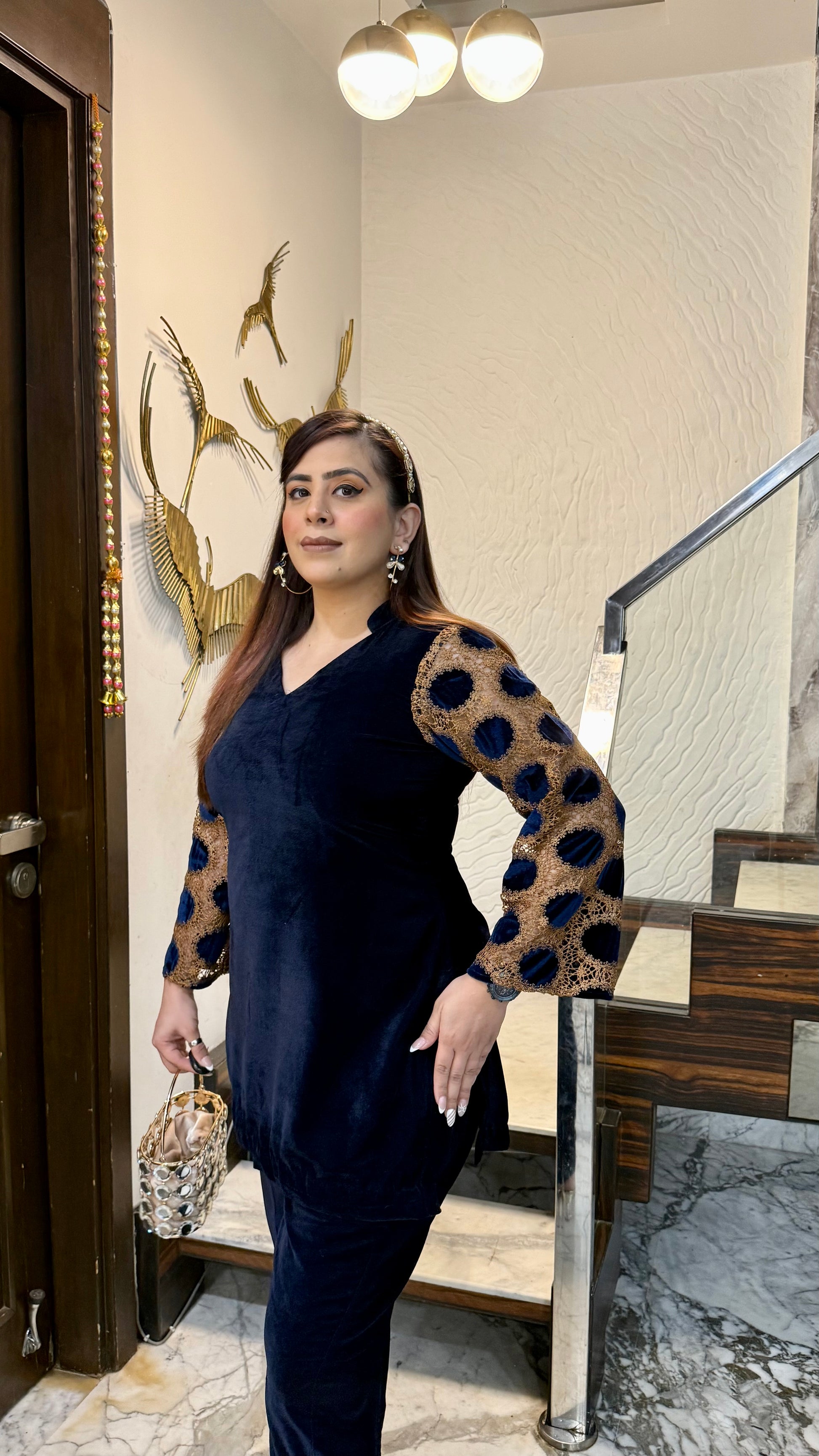 The Blue Mesh Velvet Co-Ord exudes elegance with its rich velvet texture, shimmering polka-dot mesh sleeves, and gold accents. Perfect for evening parties and festive gatherings! 💙✨ #LuxuryLook #PartyReady |