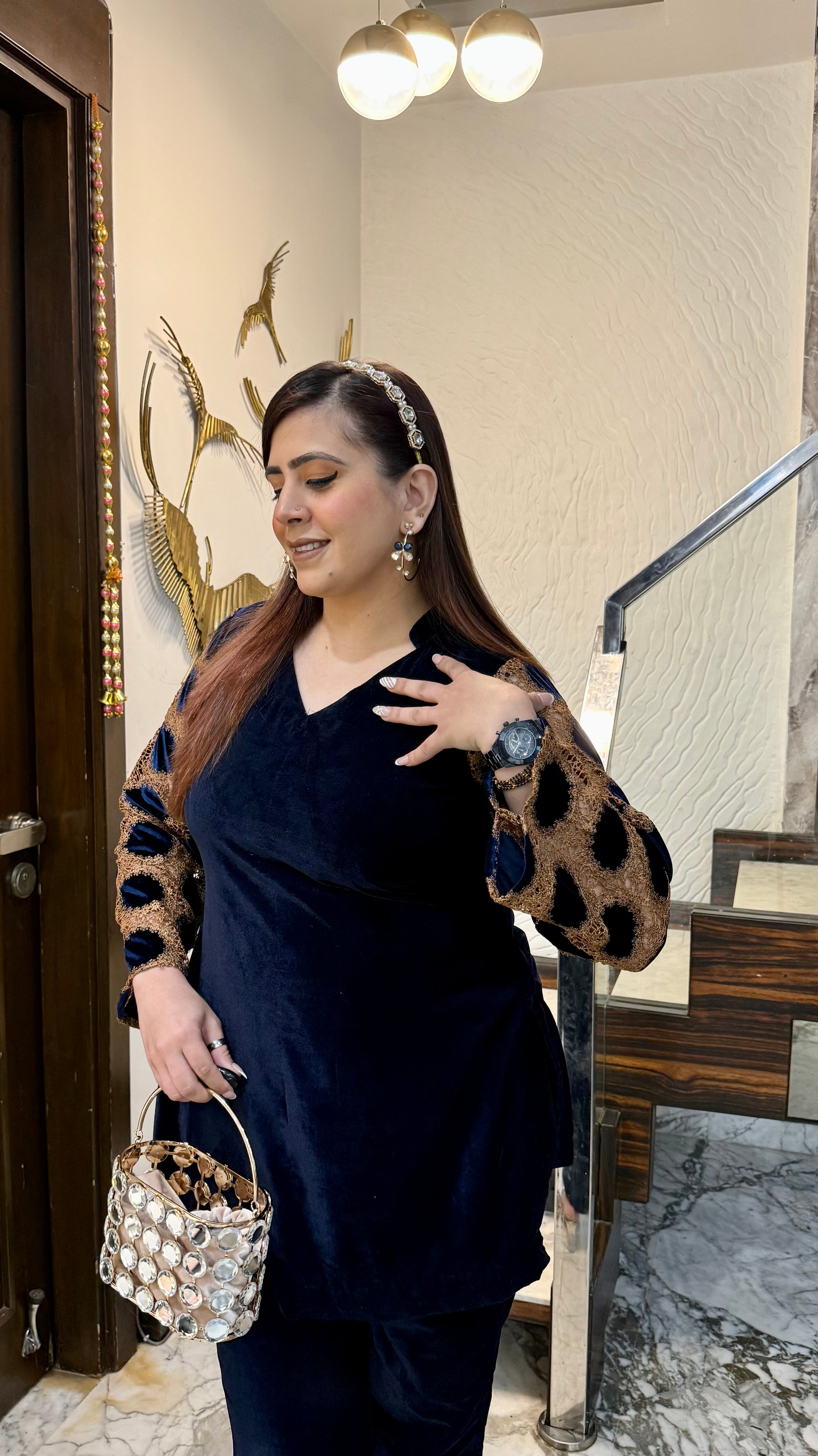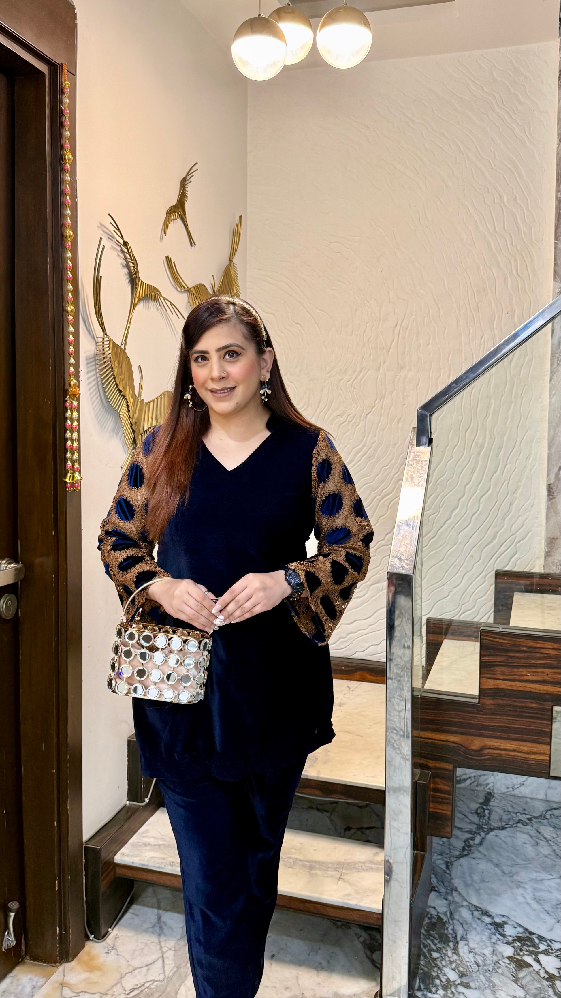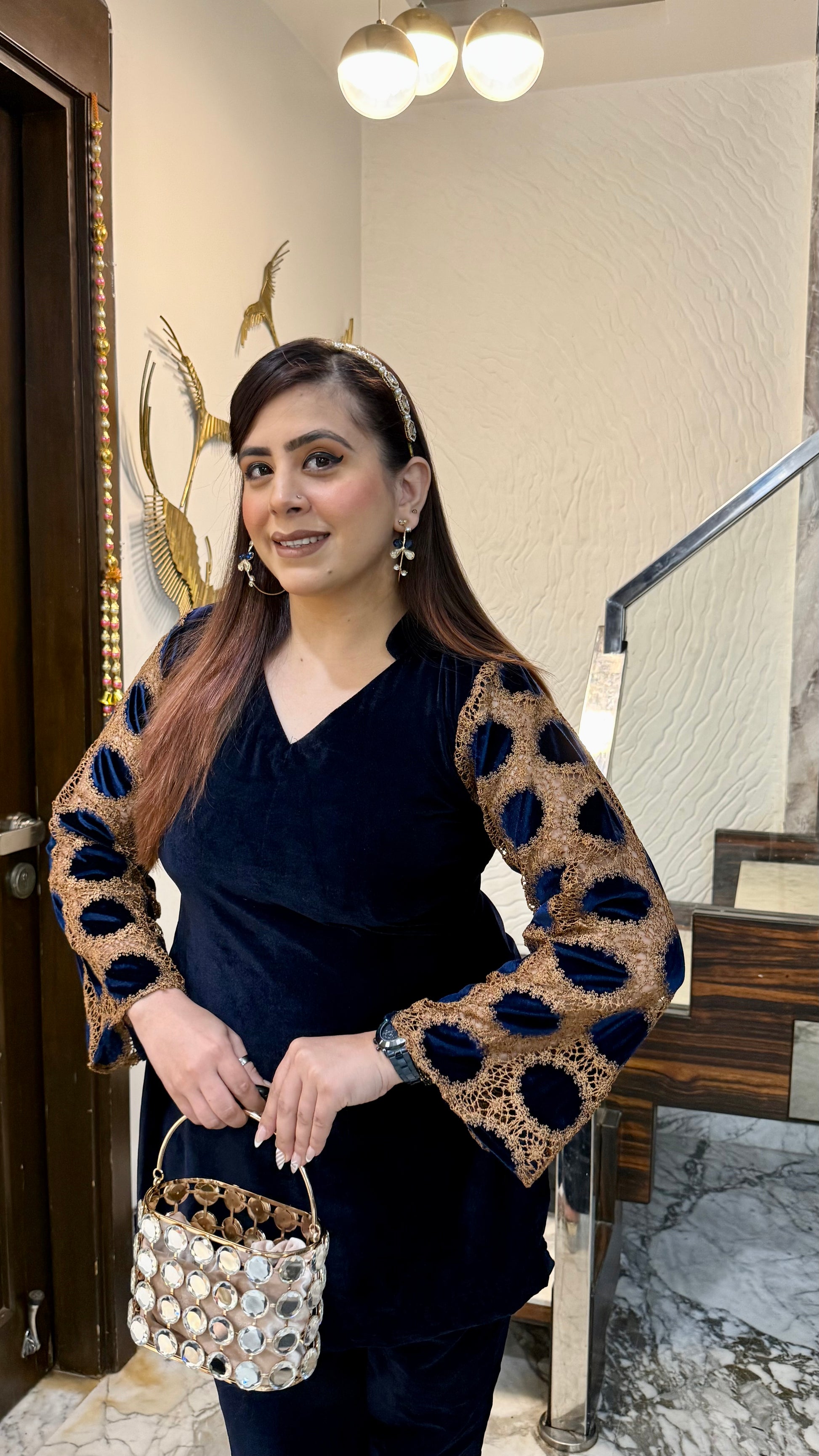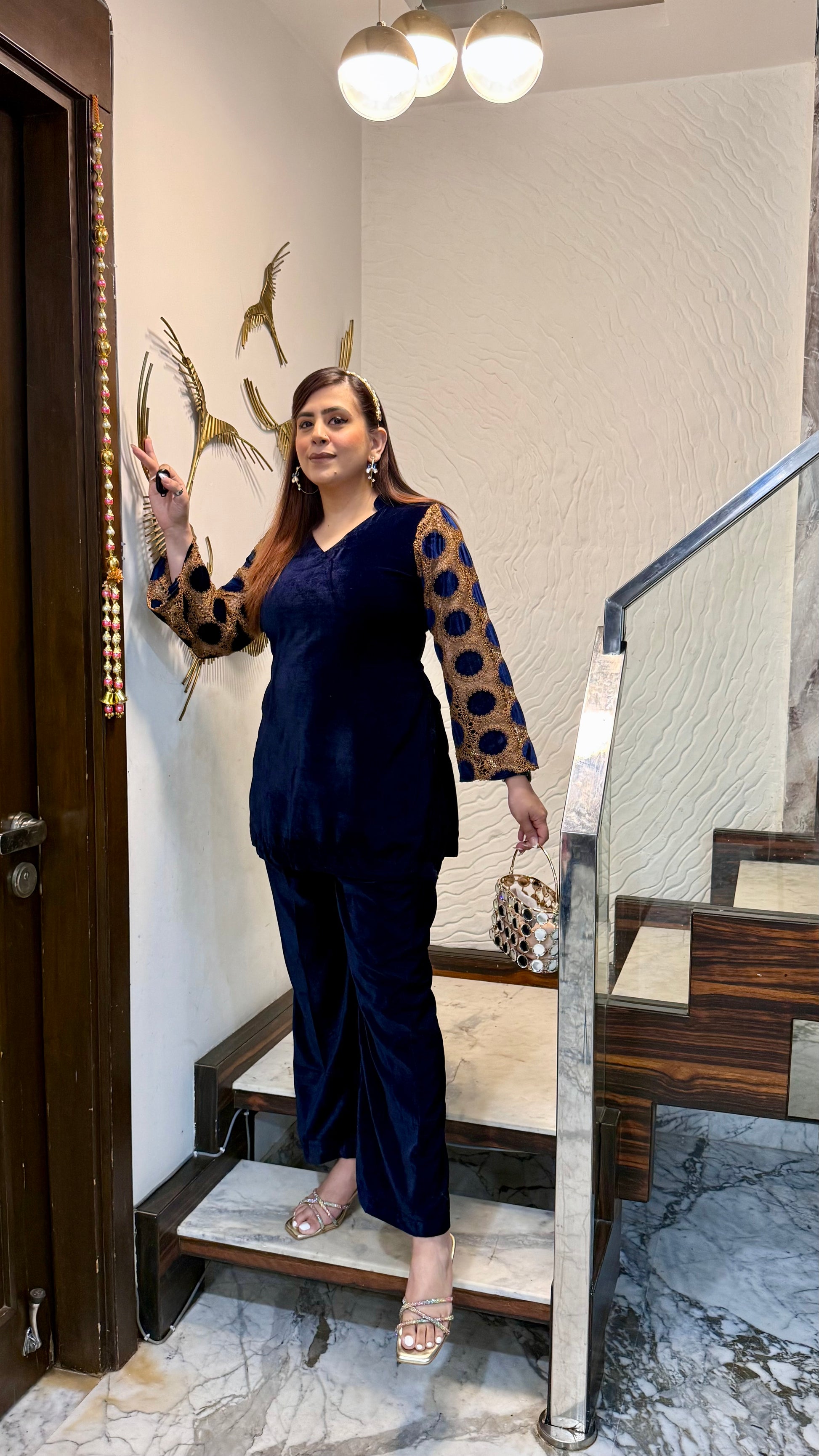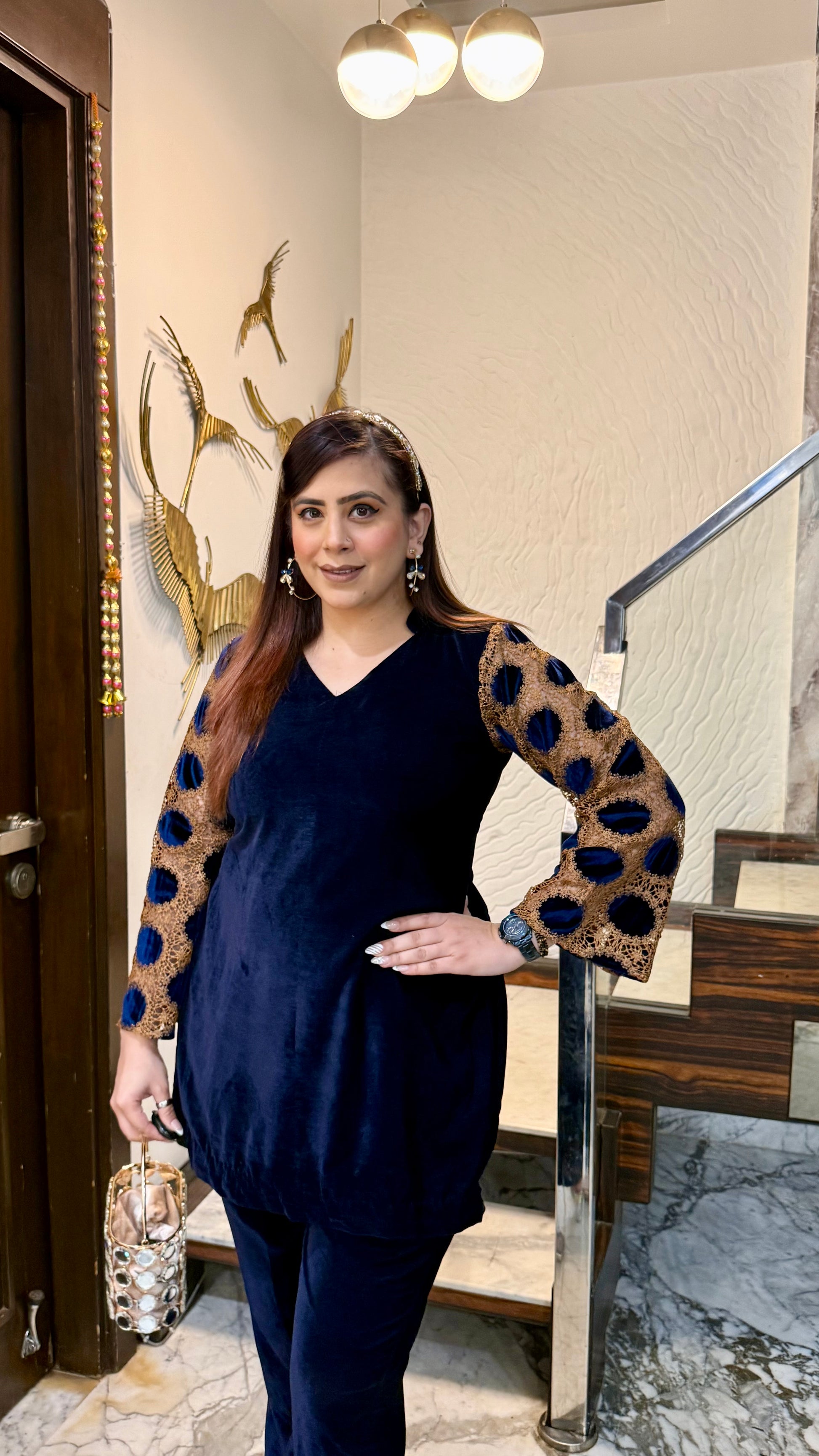 The Blue Mesh Velvet Co-Ord exudes elegance with its rich velvet texture, shimmering polka-dot mesh sleeves, and gold accents. Perfect for evening parties and festive gatherings! 💙✨ #LuxuryLook #PartyReady |