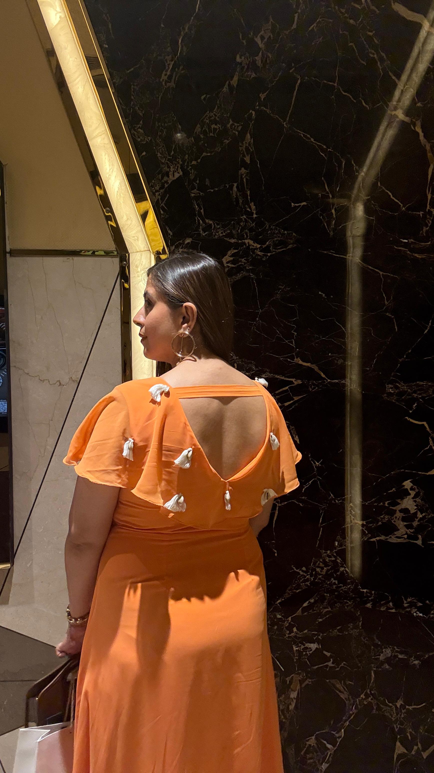 🌼 Turn heads in this vibrant Boho Orange Maxi Dress 🍊 featuring flutter sleeves, seashell-style embellishments 🐚, a flared ruffle hem, and flattering fit. Perfect for brunch dates or casual outings! ✨👜 |