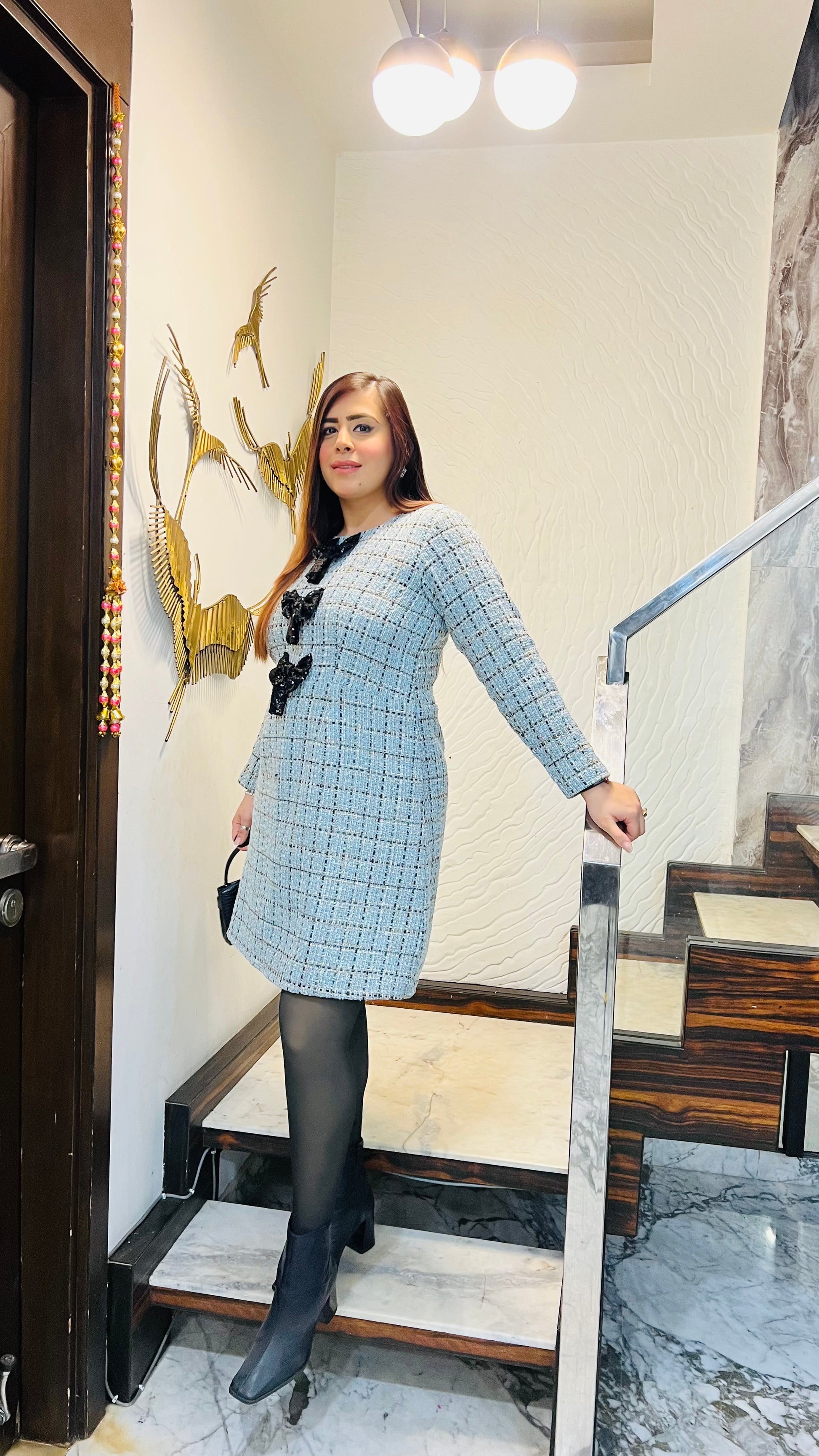 "Elevate your style with this chic Bow Beauty Tweed Dress ✨! Featuring elegant black bows 🎀, textured tweed fabric 🧵, and long sleeves, it's perfect for classy winter outings ❄️." |