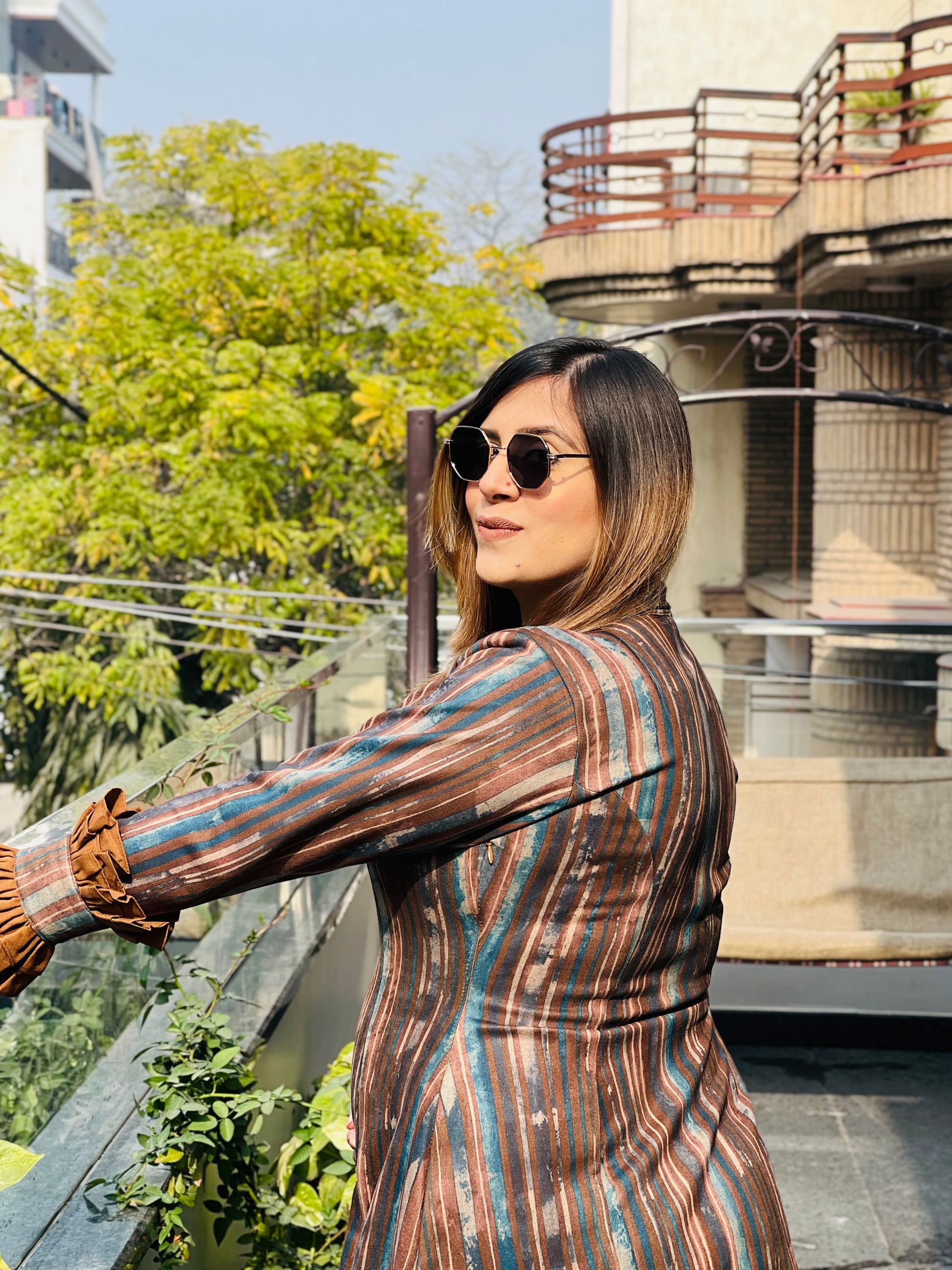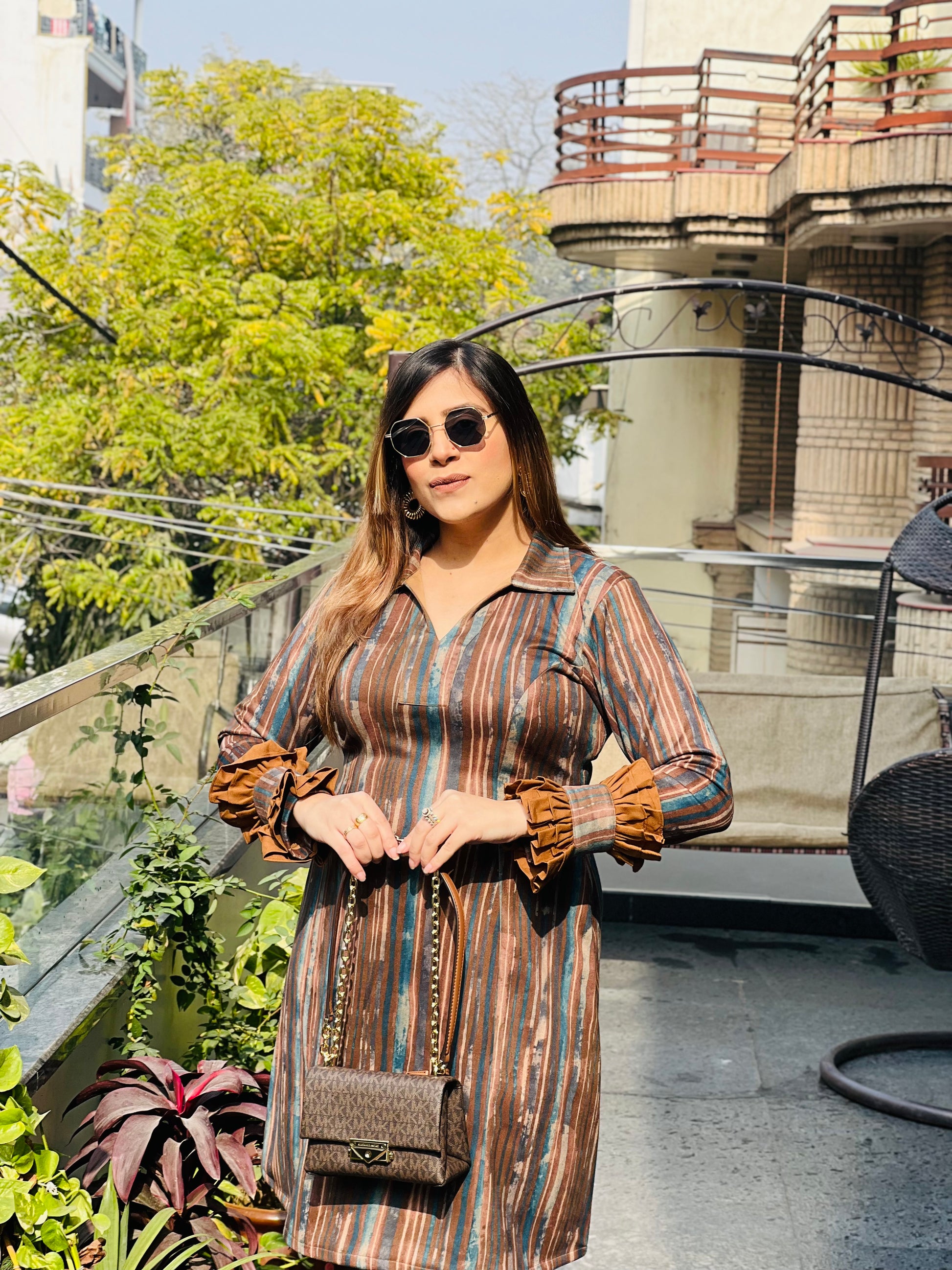 Embrace the warmth of autumn in this brown stripes suede dress. 🍂✨ #FallFashion |