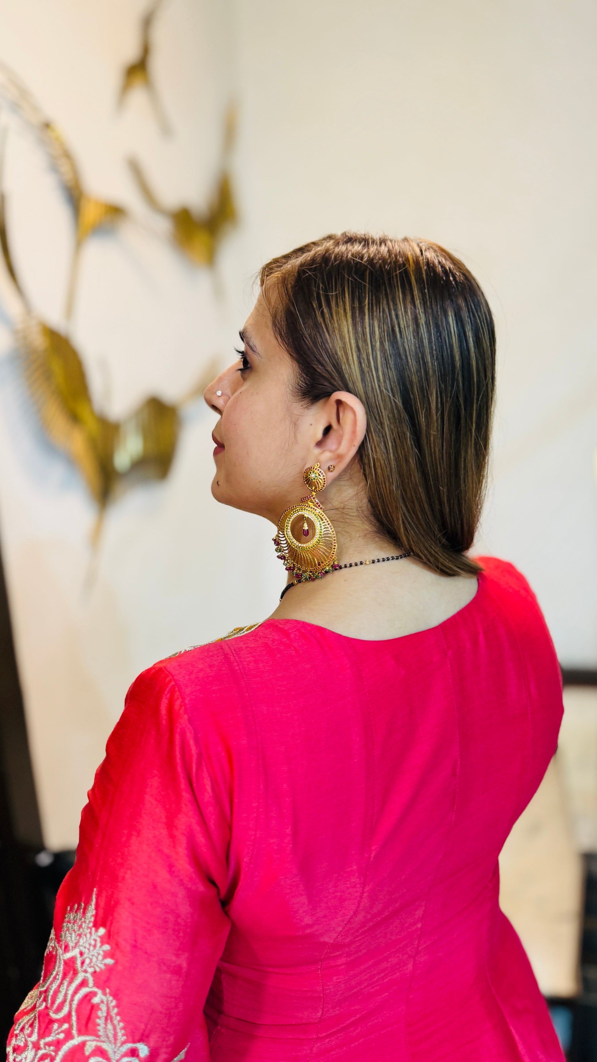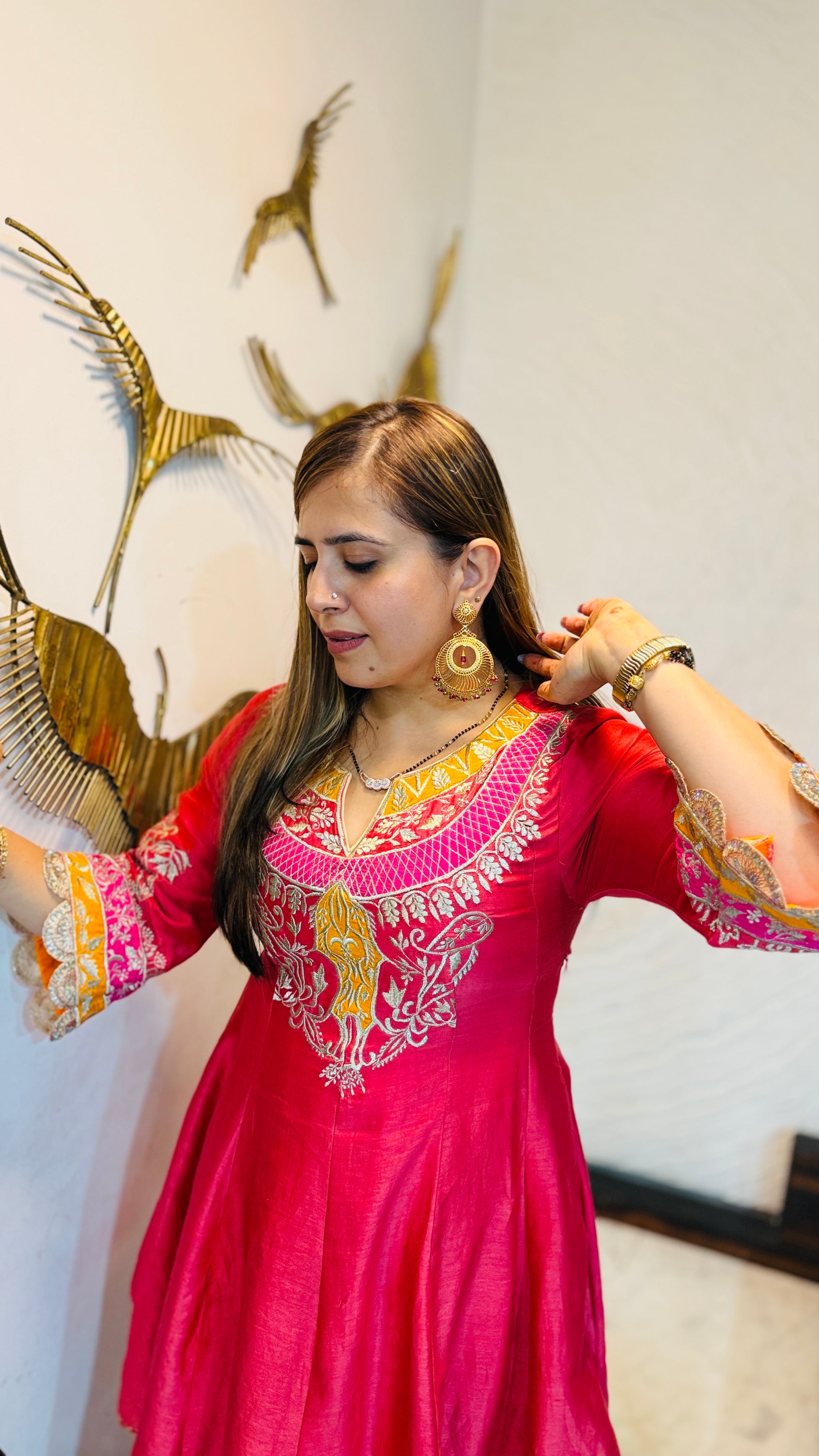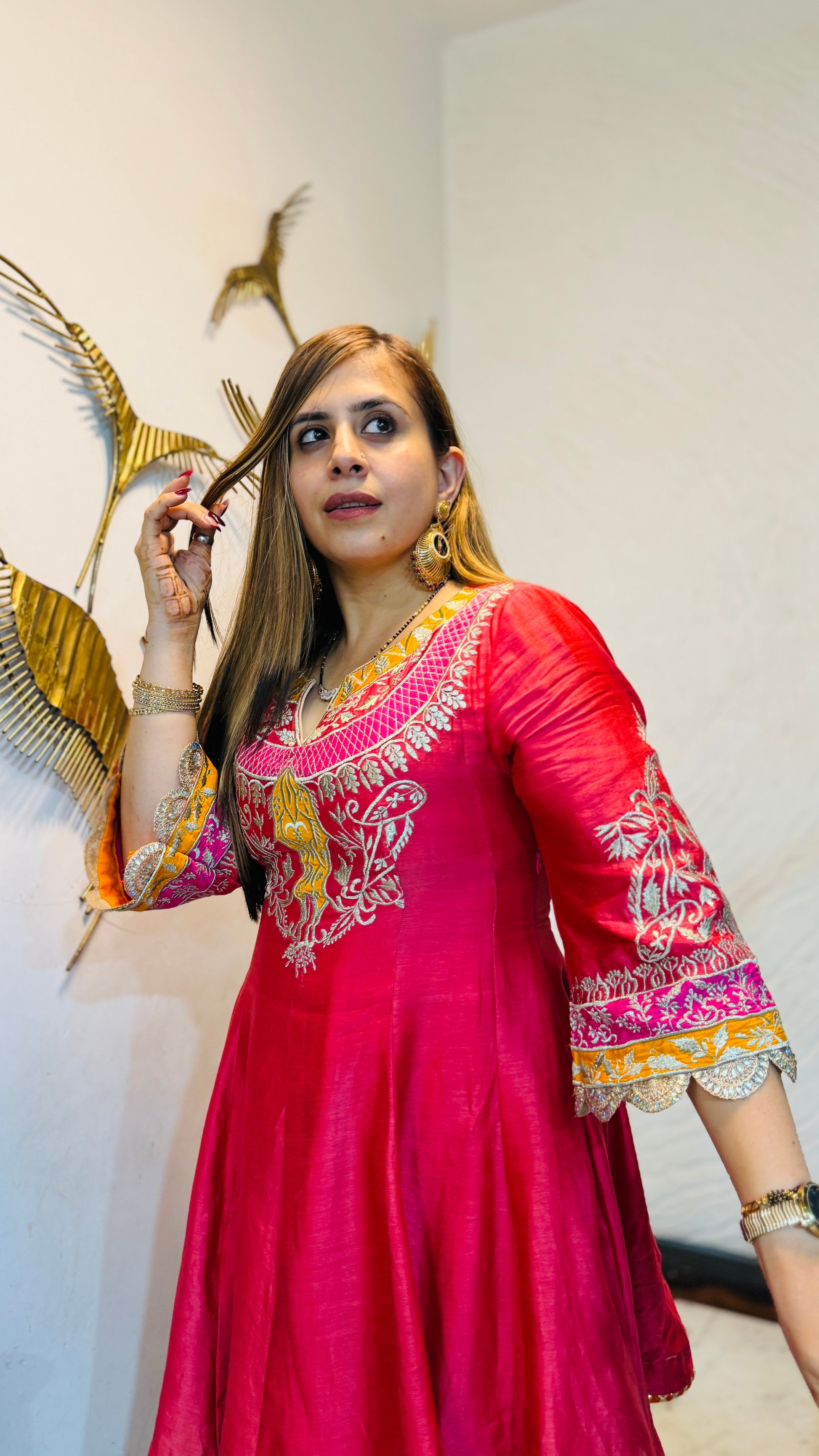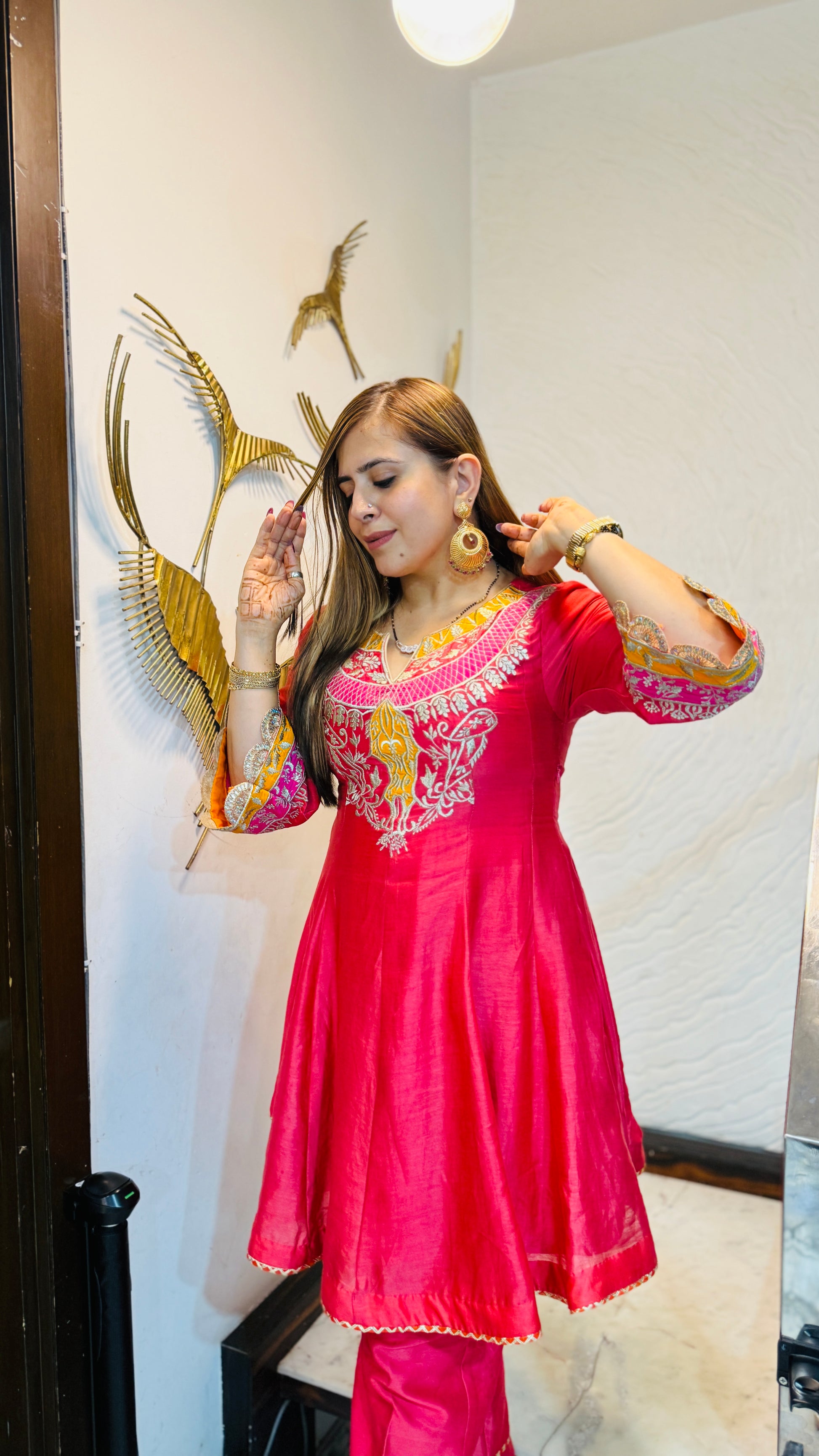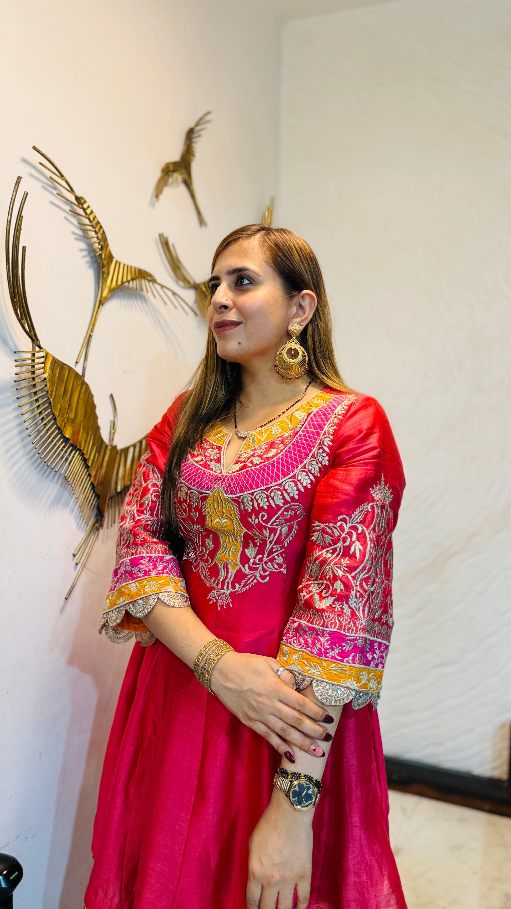 ✨ Candy Coral Co-Ord radiates festive charm in vibrant coral silk 💖. The short kurta features intricate golden & white embroidery with lace sleeves, paired with matching straight pants & embellished flats 👗🌸 |