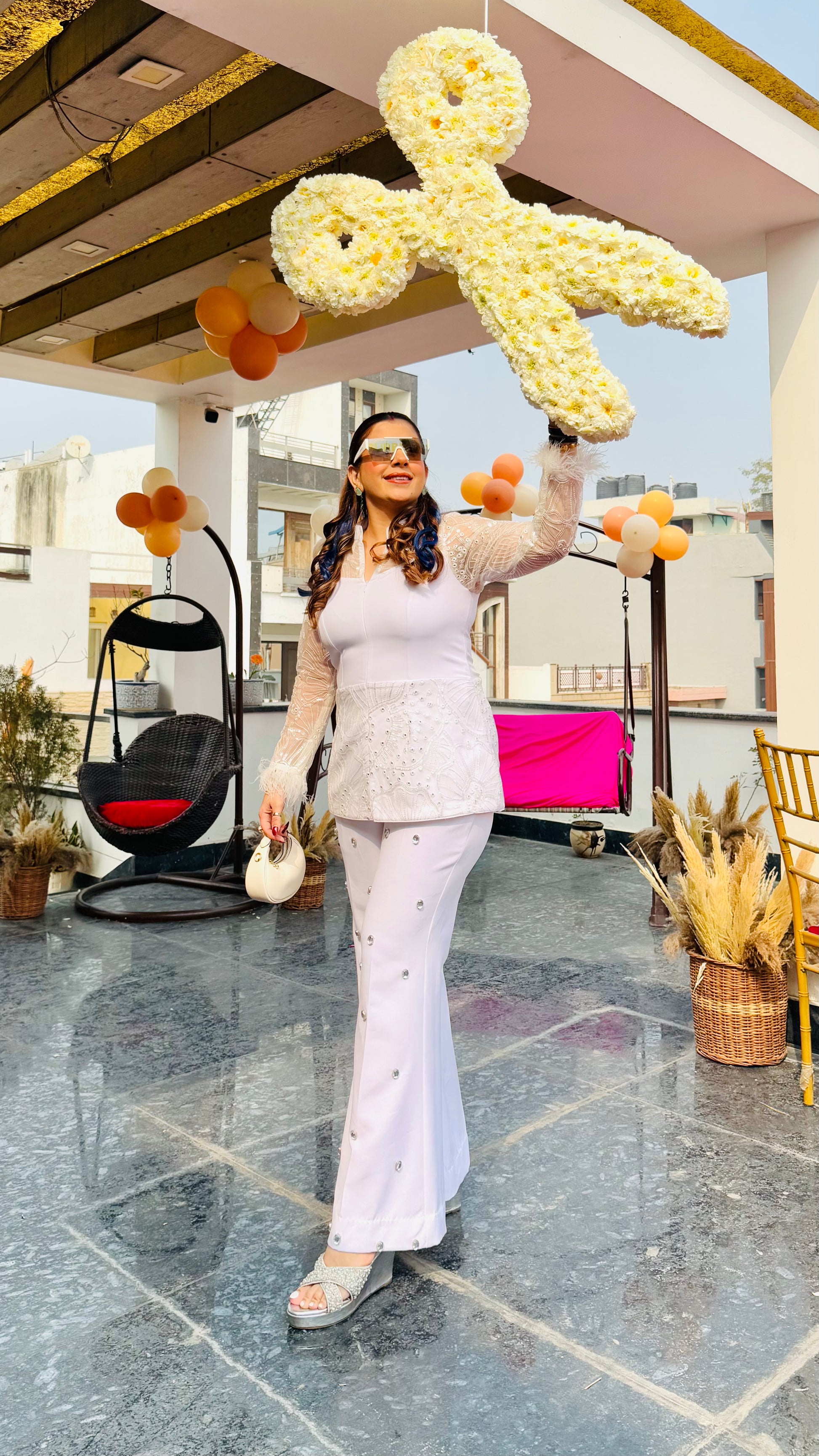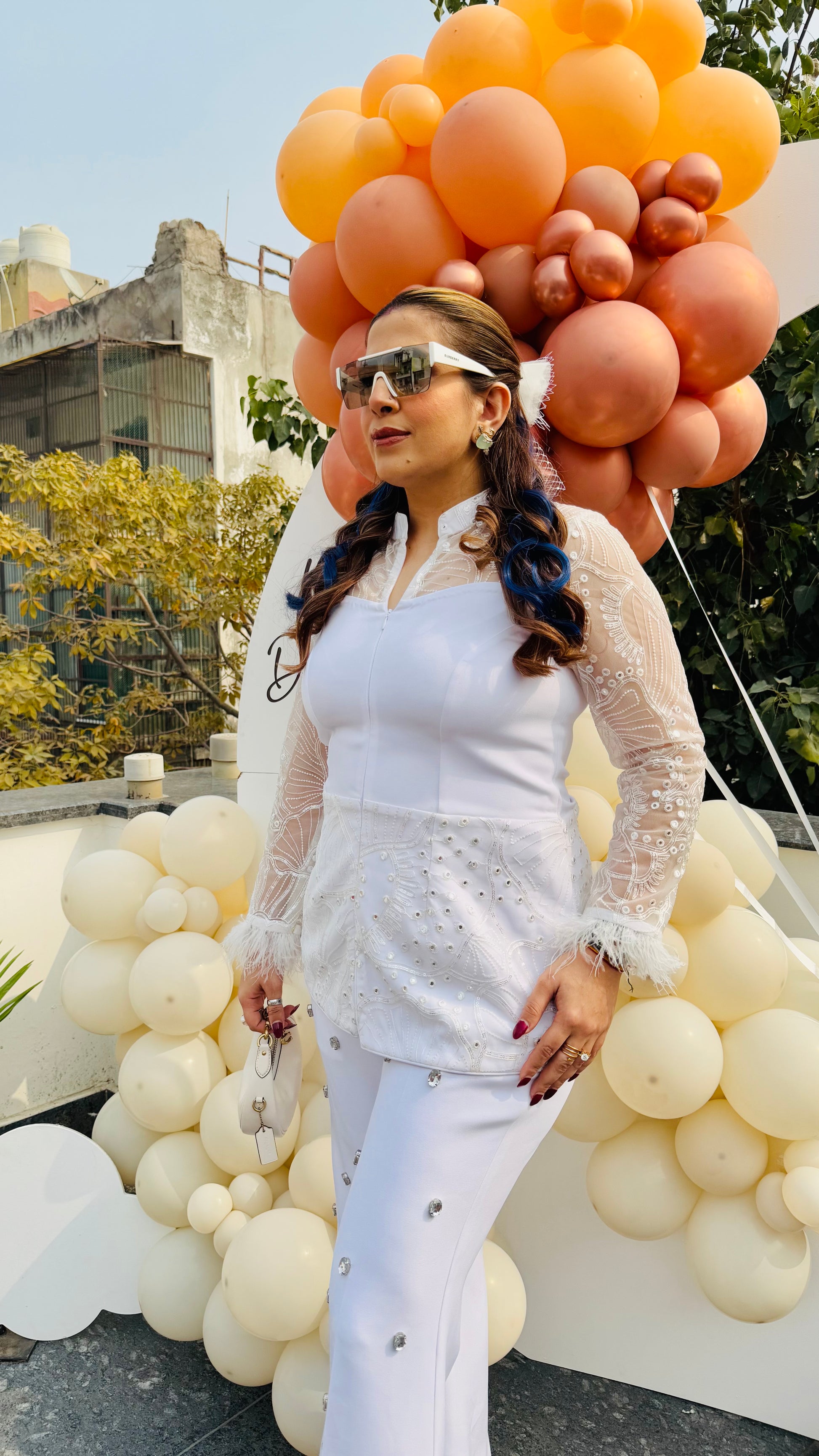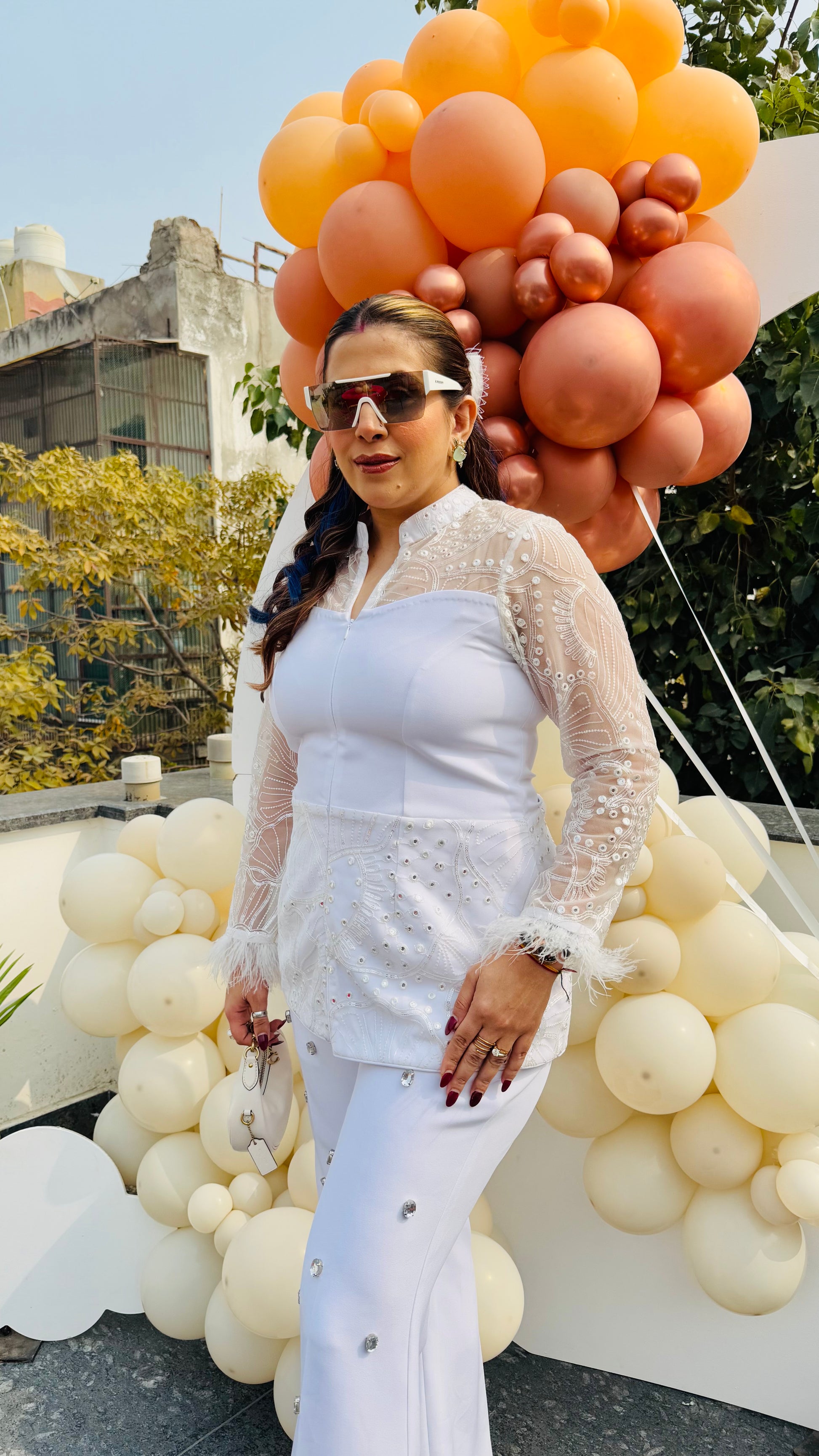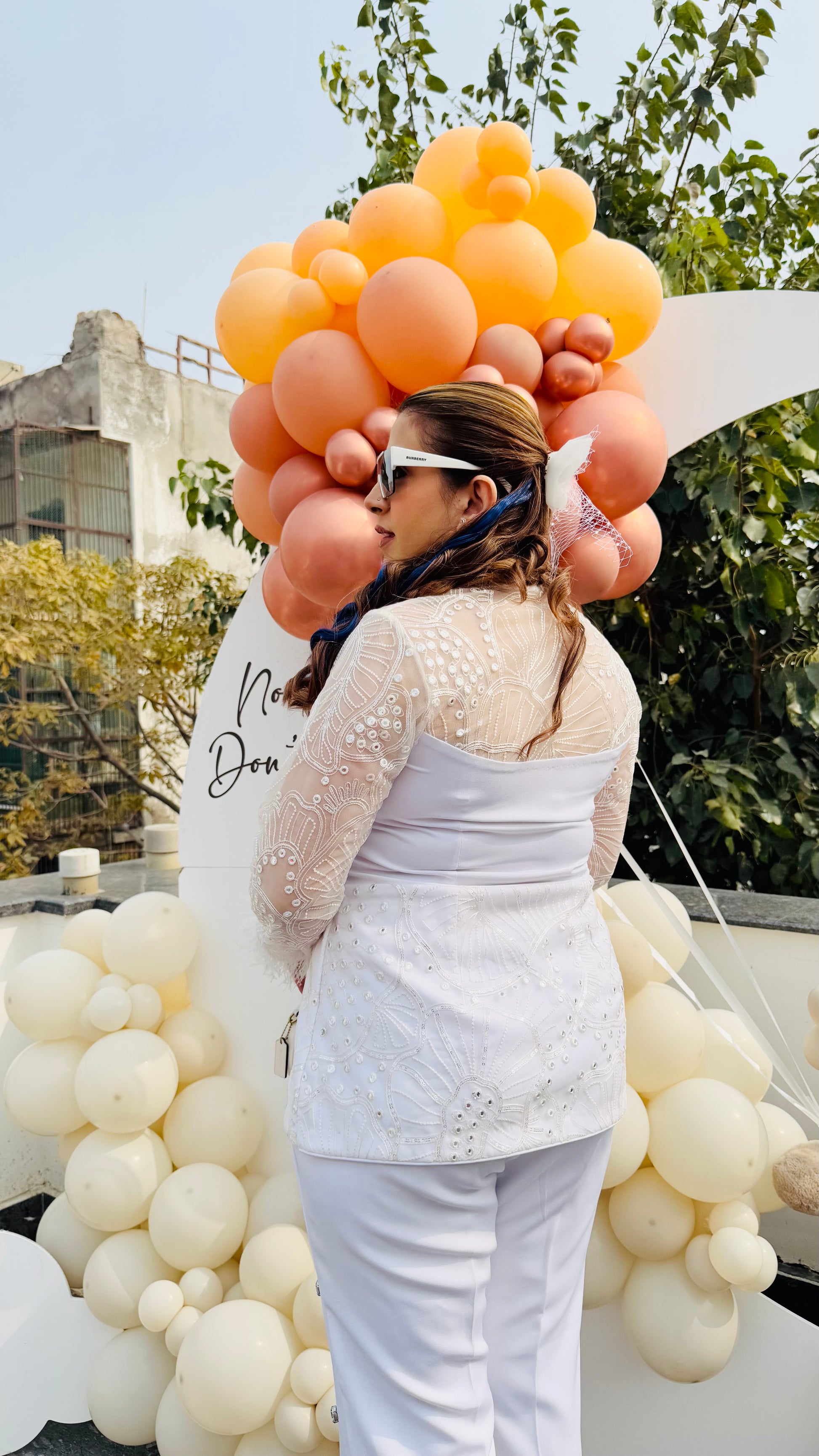 An elegant all-white co-ord with sheer lace sleeves 🌟 and embellished pants, paired with glittery heels ✨. The chic styling and playful balloons create a dreamy, celebratory vibe 🎈🤍. |