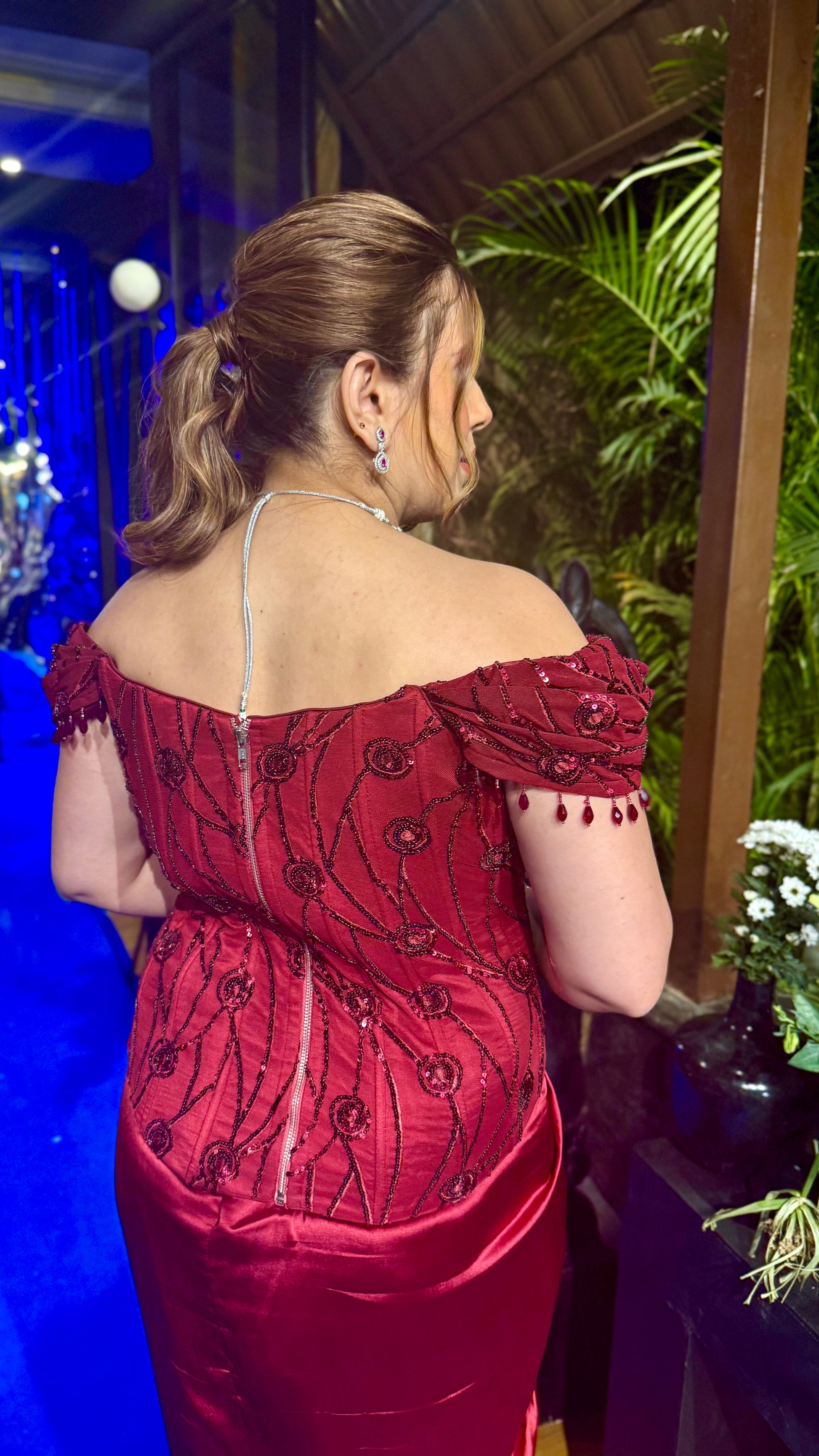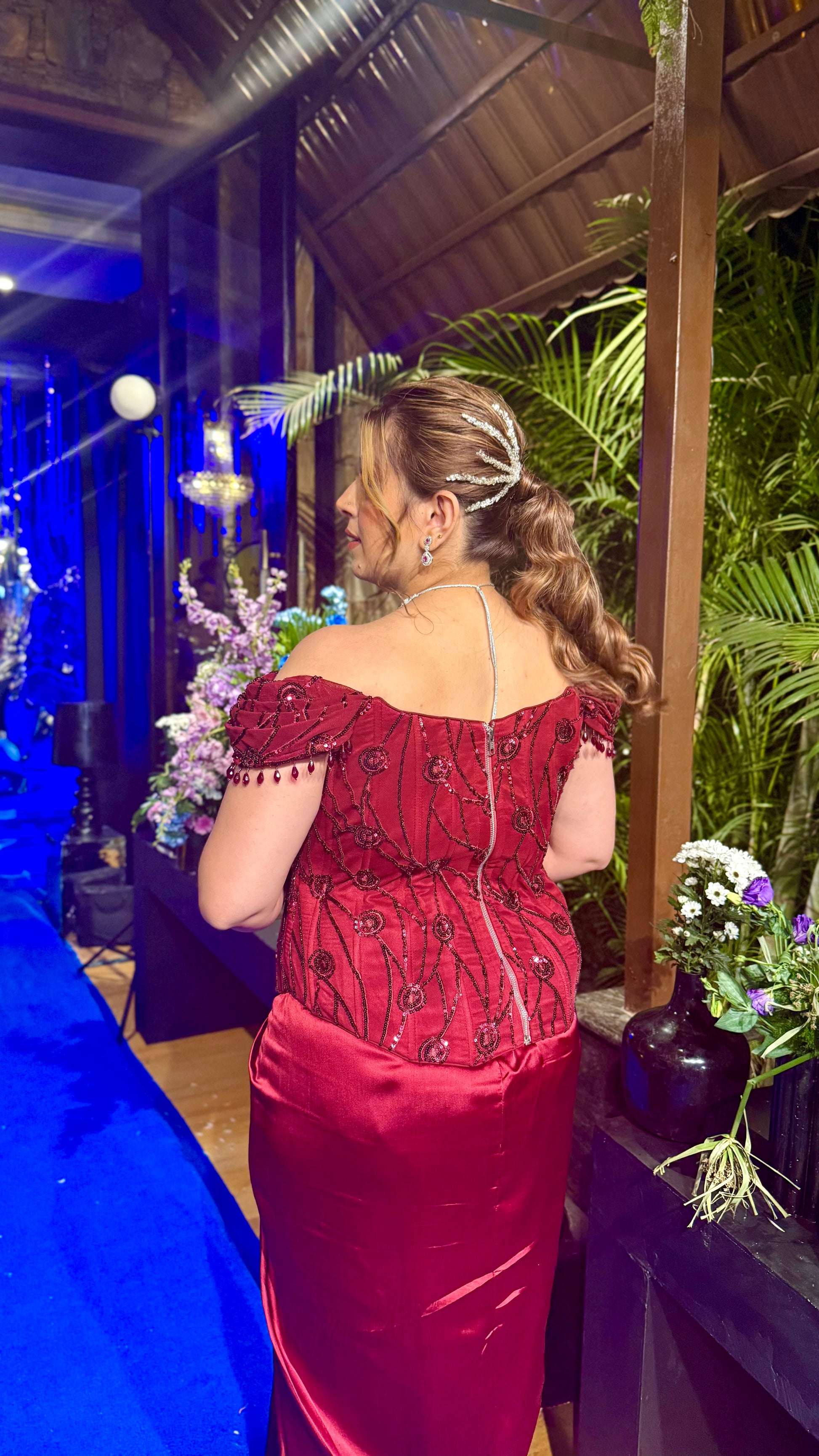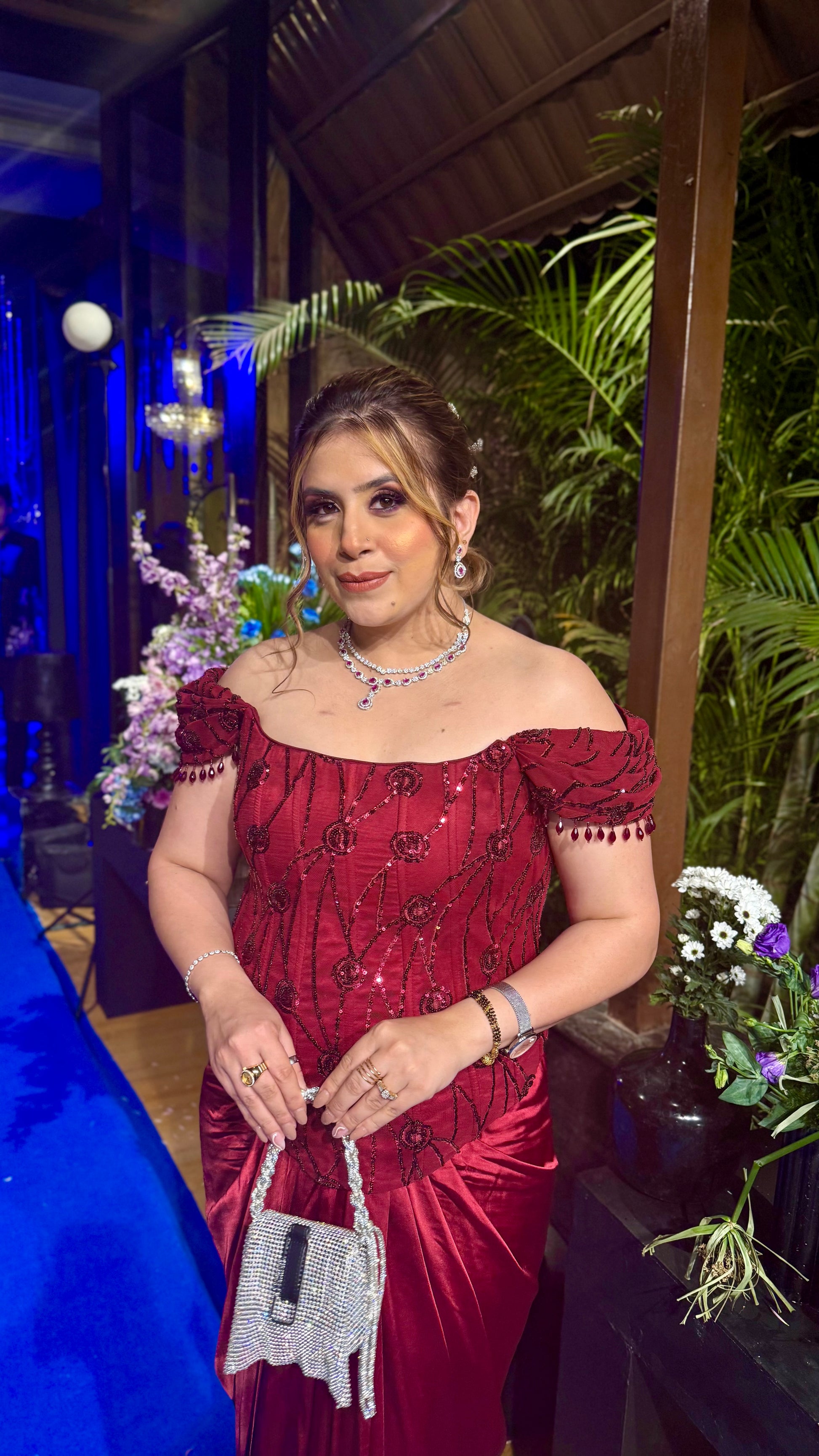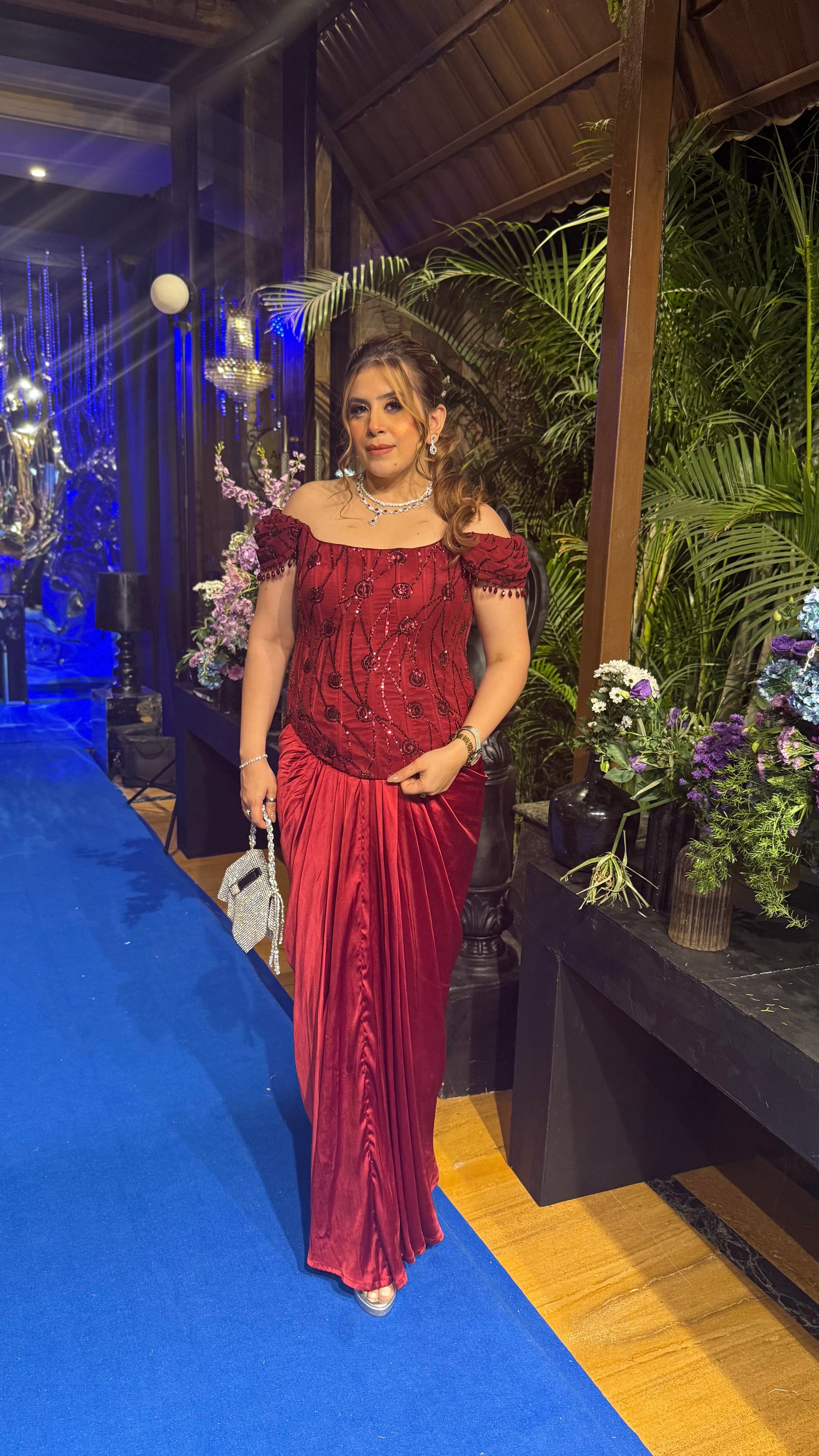 Model Length: 5’8 " Sample Length Top: High: 25" Low: 21" Dhoti: 43 " |