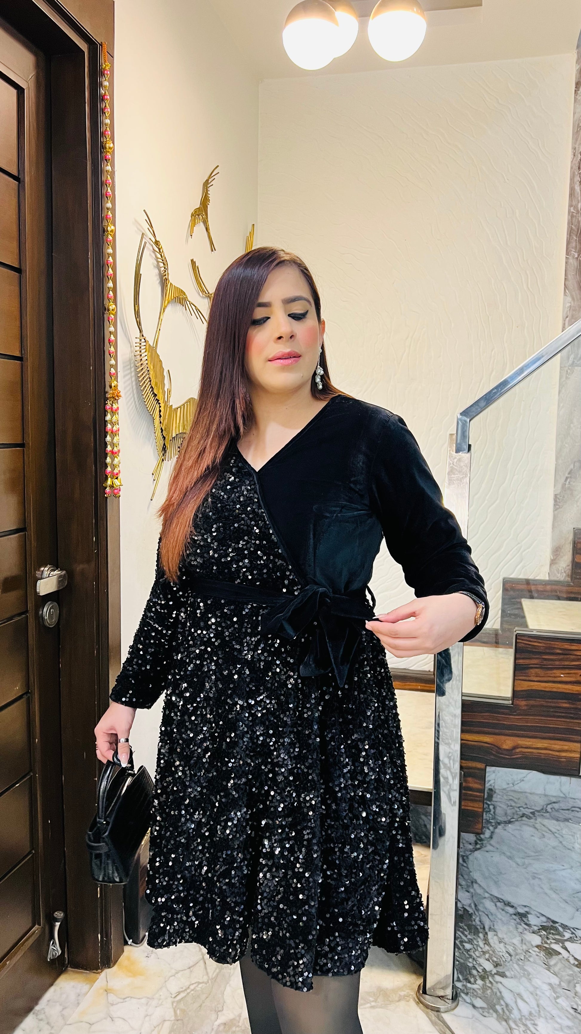 Stunning Devil’s black sequin dress with a velvet wrap bodice, flared skirt, and waist-tie detailing. Perfectly paired with black tights, ankle boots, and a mini handbag for glam vibes. 🖤✨ |