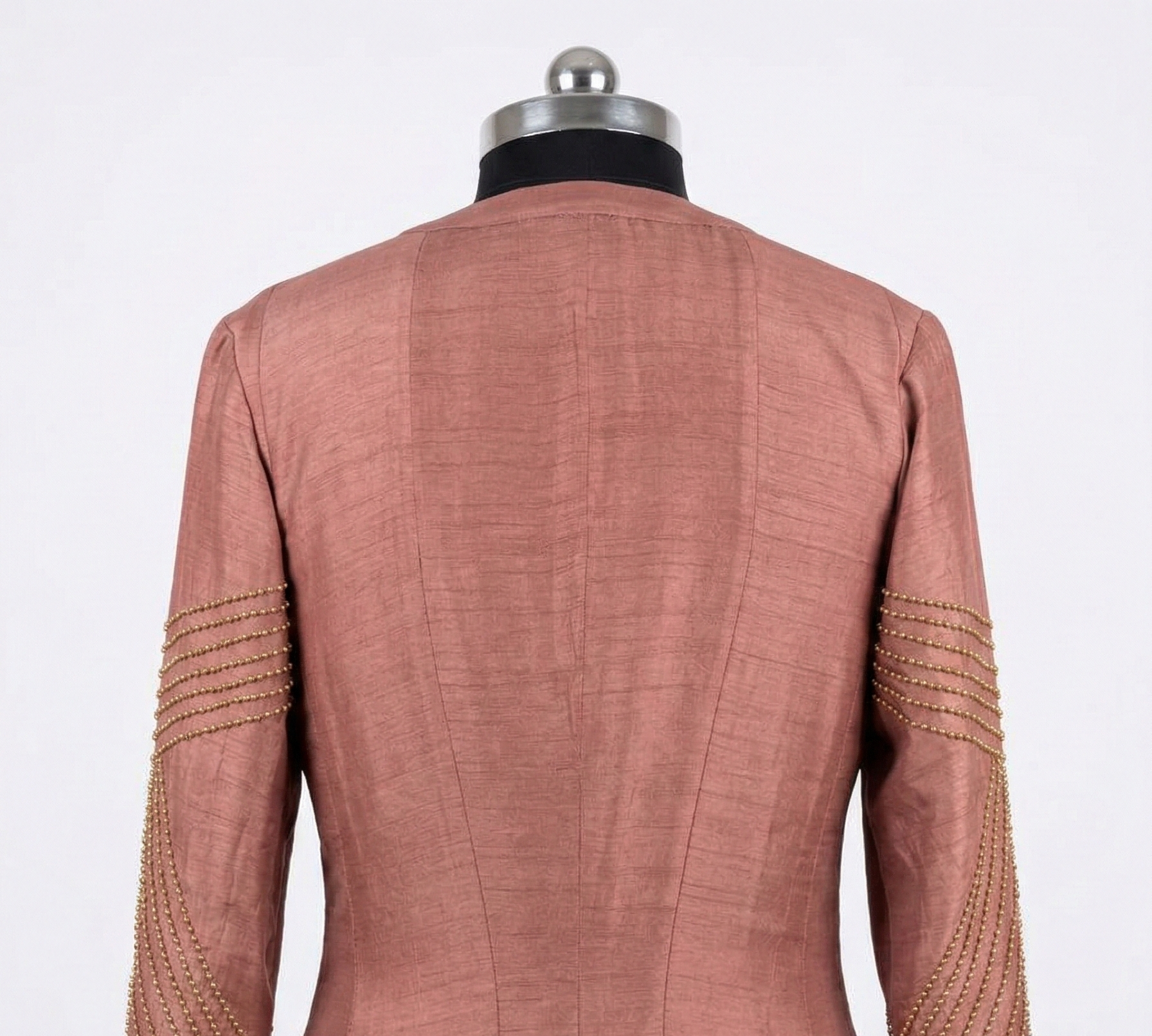 She carries timeless grace in this dusty rose Anarkali, crafted in flowing georgette with intricate thread and zari embroidery. The structured silhouette flatters beautifully, while scalloped full sleeves and a soft organza dupatta add regal movement. Designed for weddings and grand celebrations, it blends heritage detailing with effortless elegance.