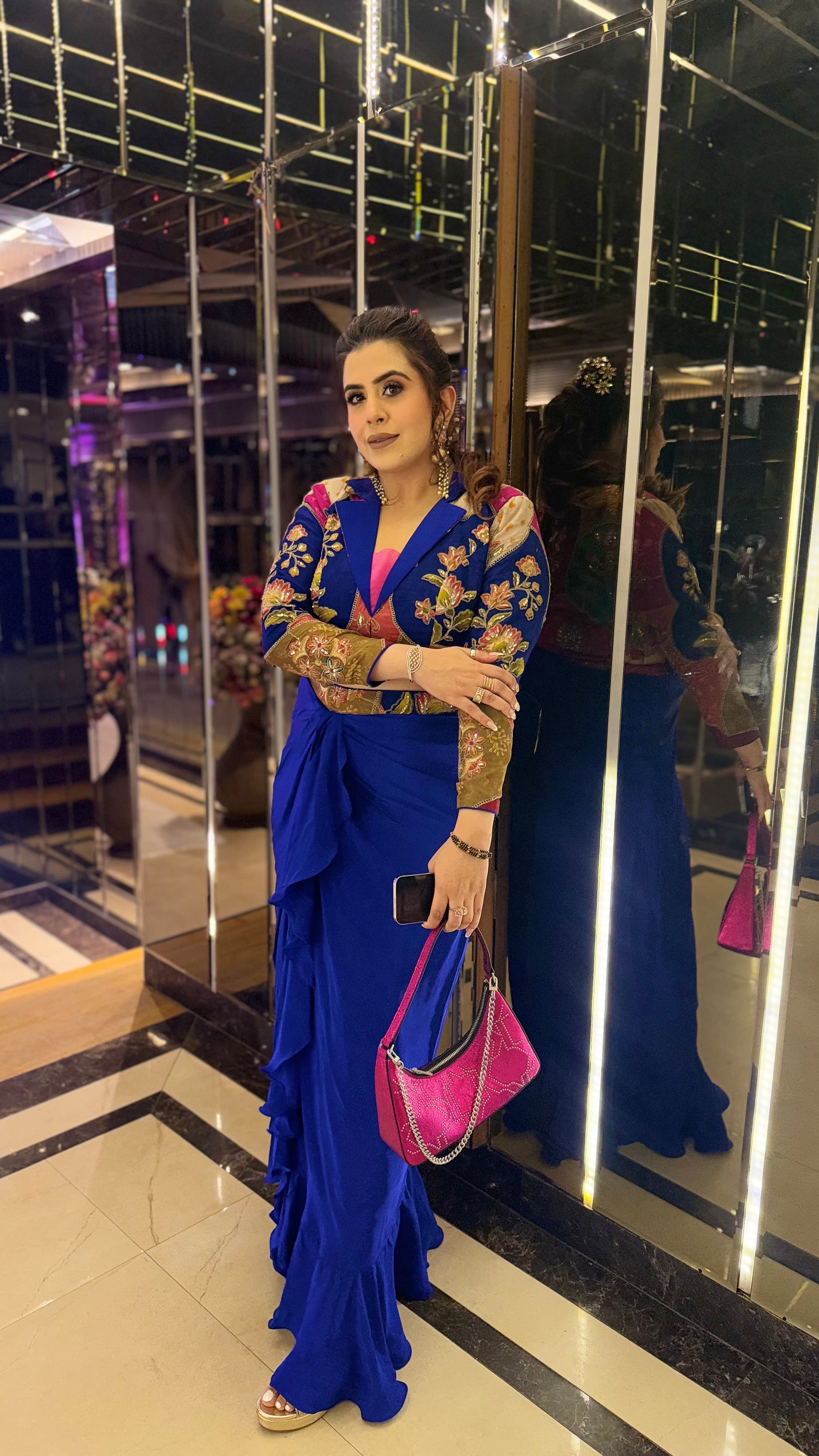 The Electric Blue Carnival Co-Ord is a vibrant fusion of tradition and style 💙✨. Featuring a flowy ruched saree skirt and embroidered blouse 🌸, it's perfect for festive glam! 💃 |