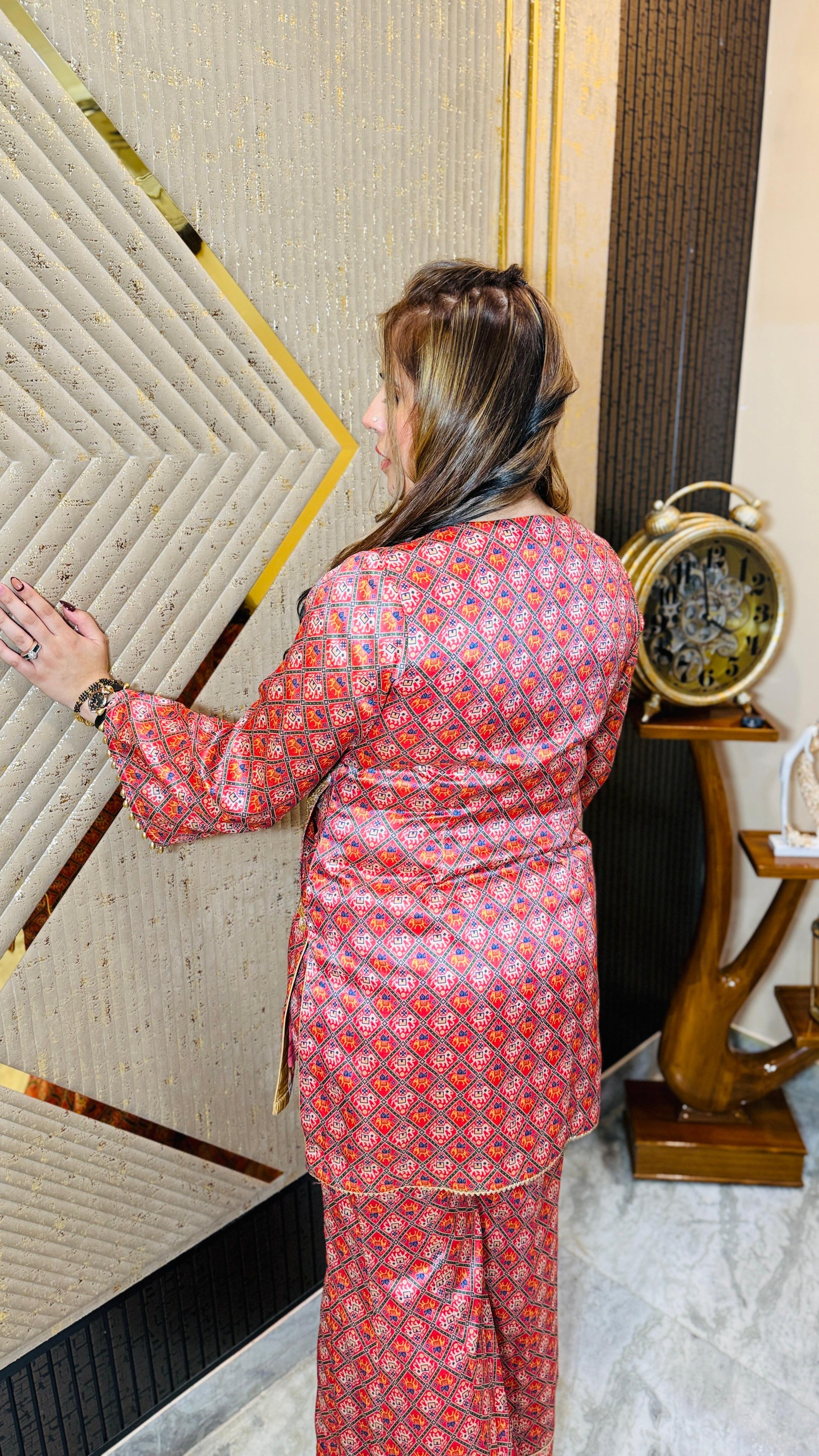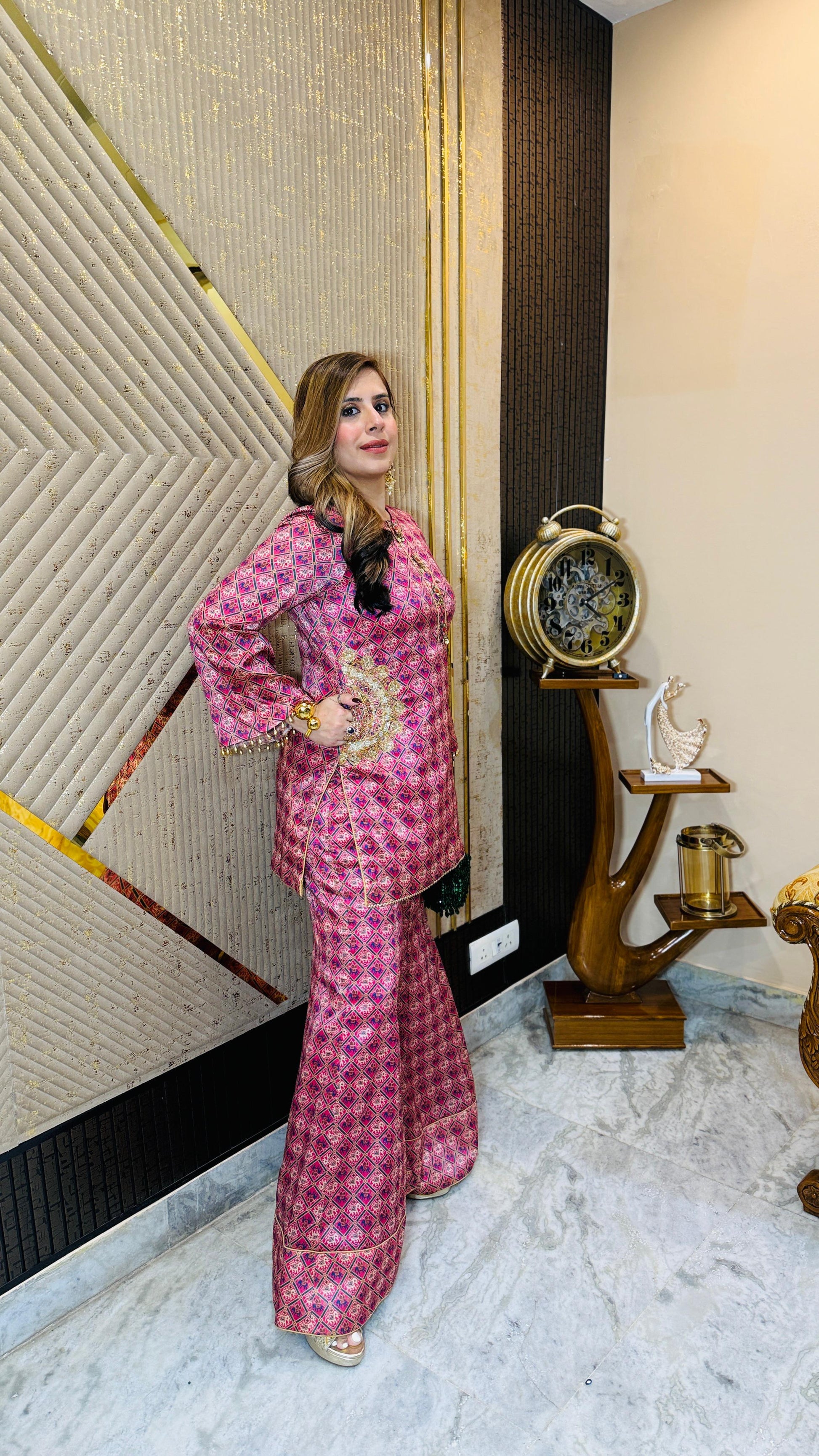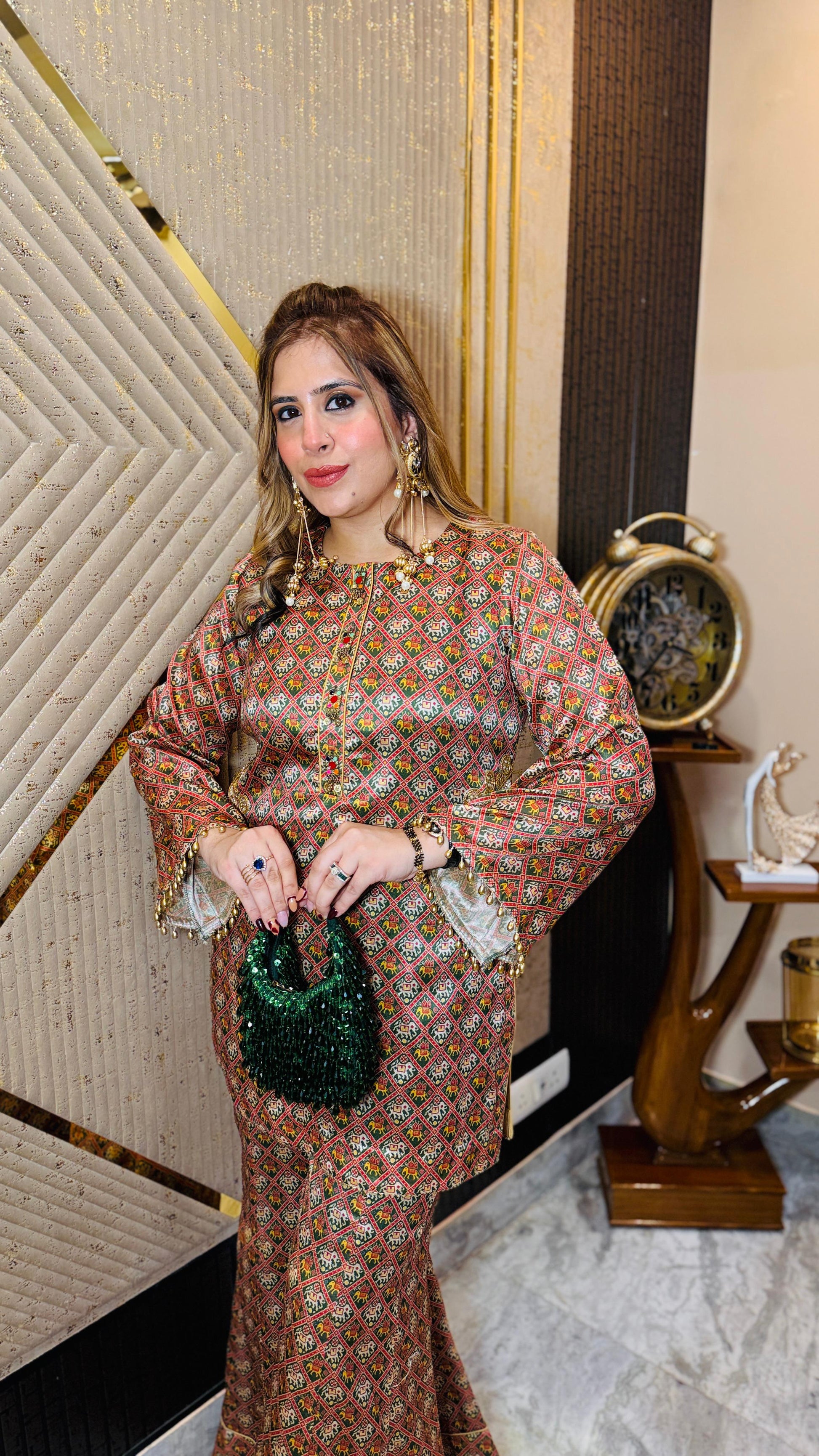 Royal elegance 👑✨ This Elephant Garara Co-Ord 🐘 features a geometric silk print with golden zari highlights 🌟, long kurta style top, and flared garara pants 💃. Styled with statement earrings and clutch 👜. |