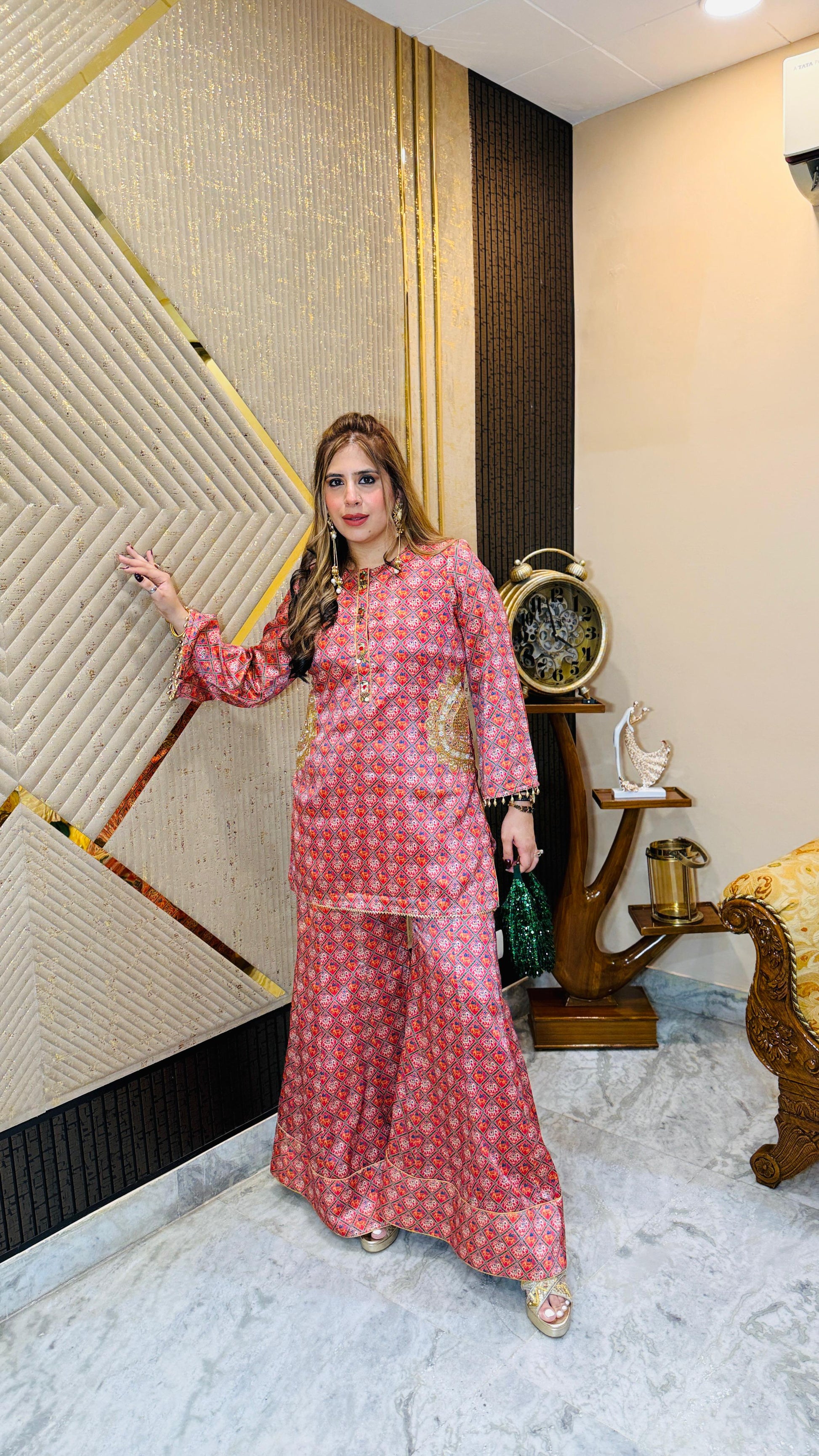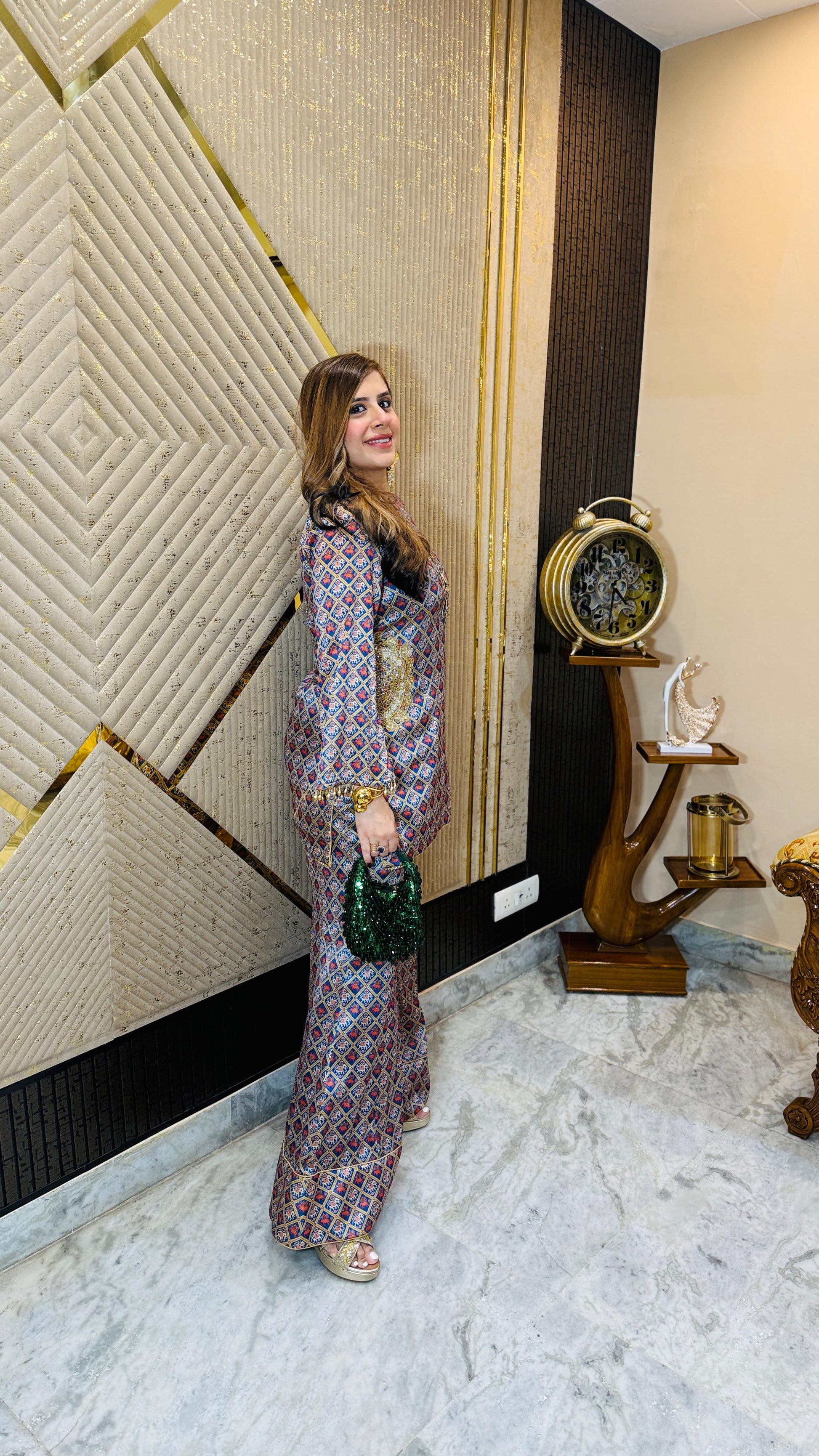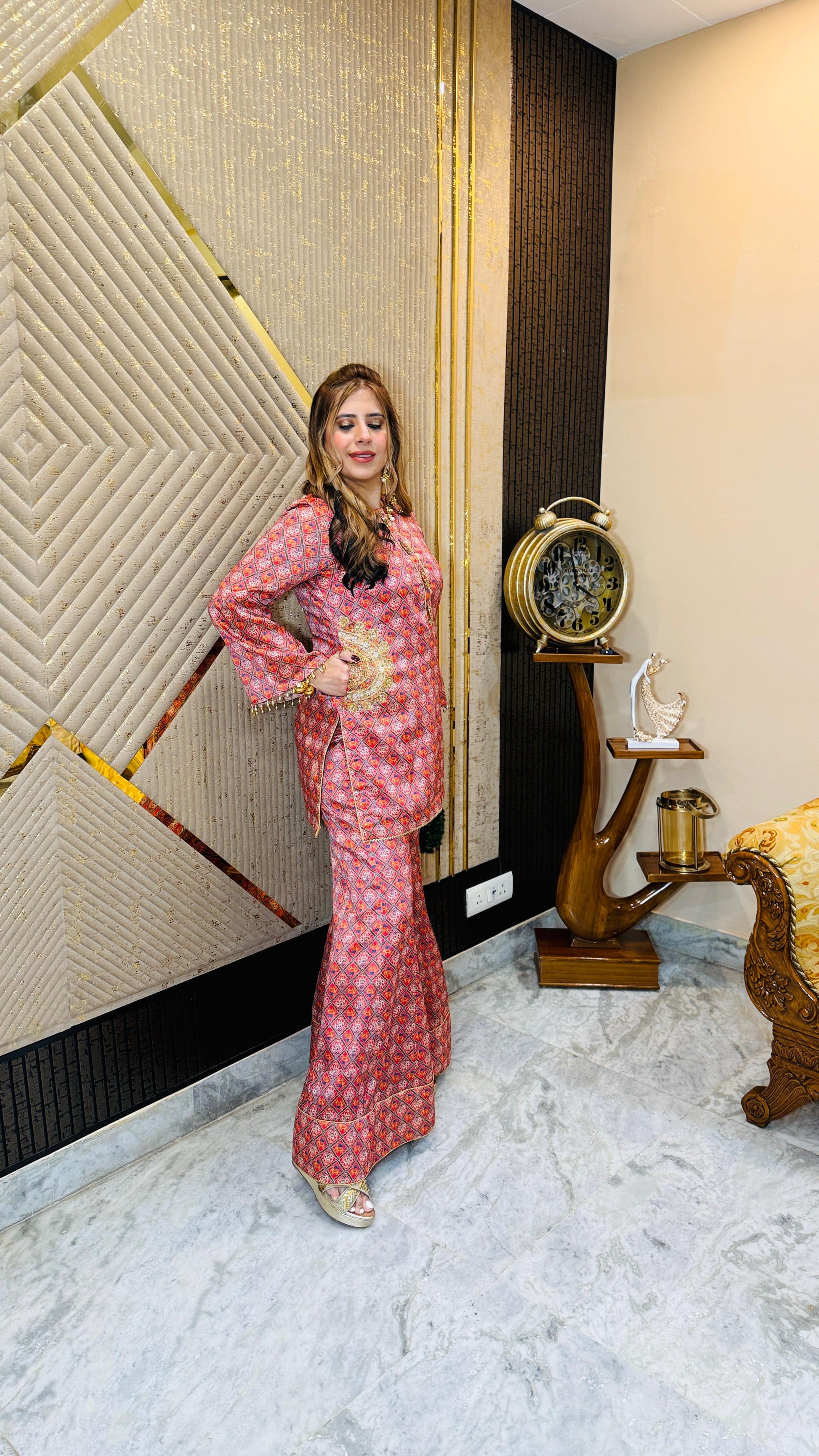 Royal elegance 👑✨ This Elephant Garara Co-Ord 🐘 features a geometric silk print with golden zari highlights 🌟, long kurta style top, and flared garara pants 💃. Styled with statement earrings and clutch 👜. |