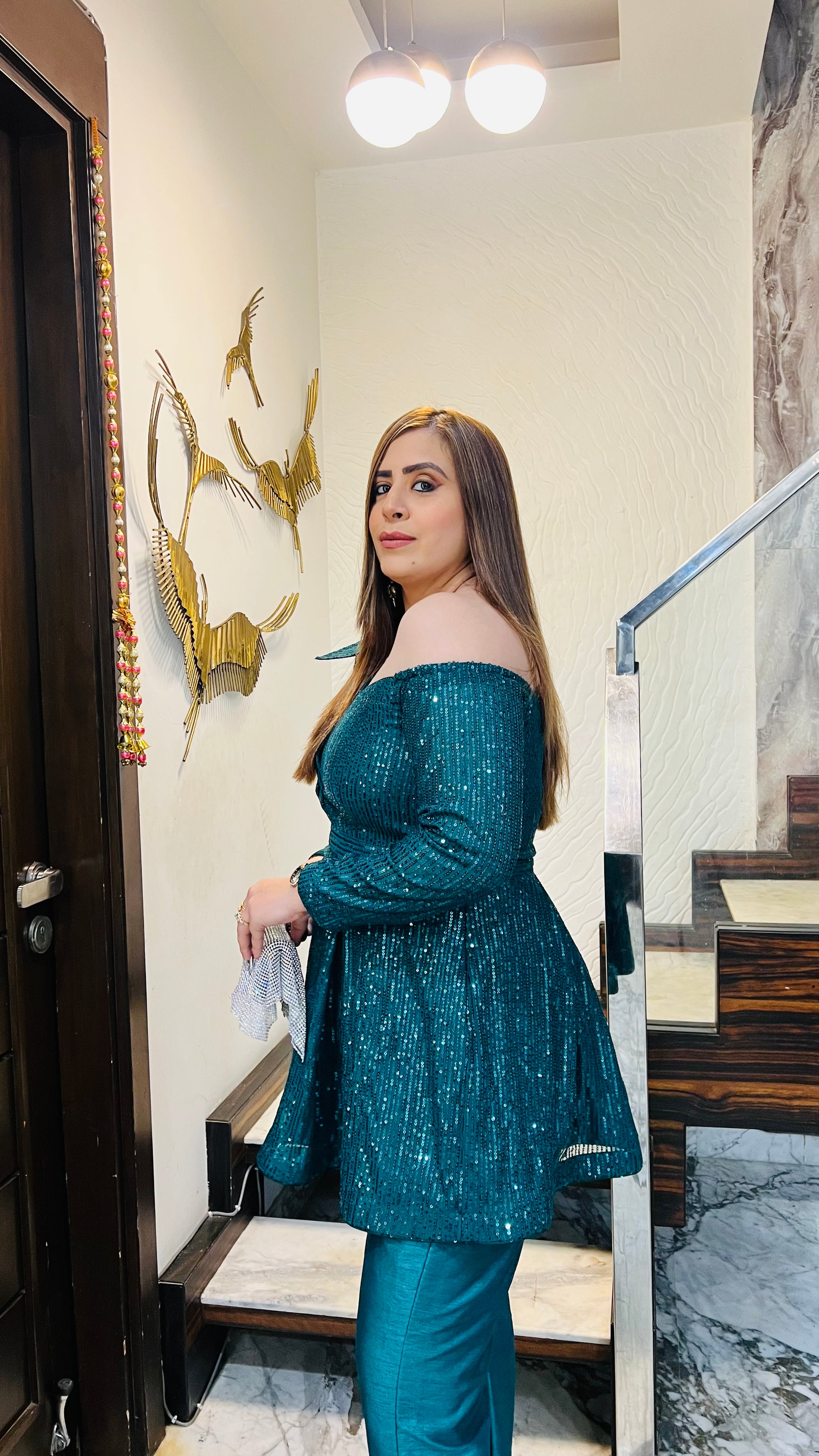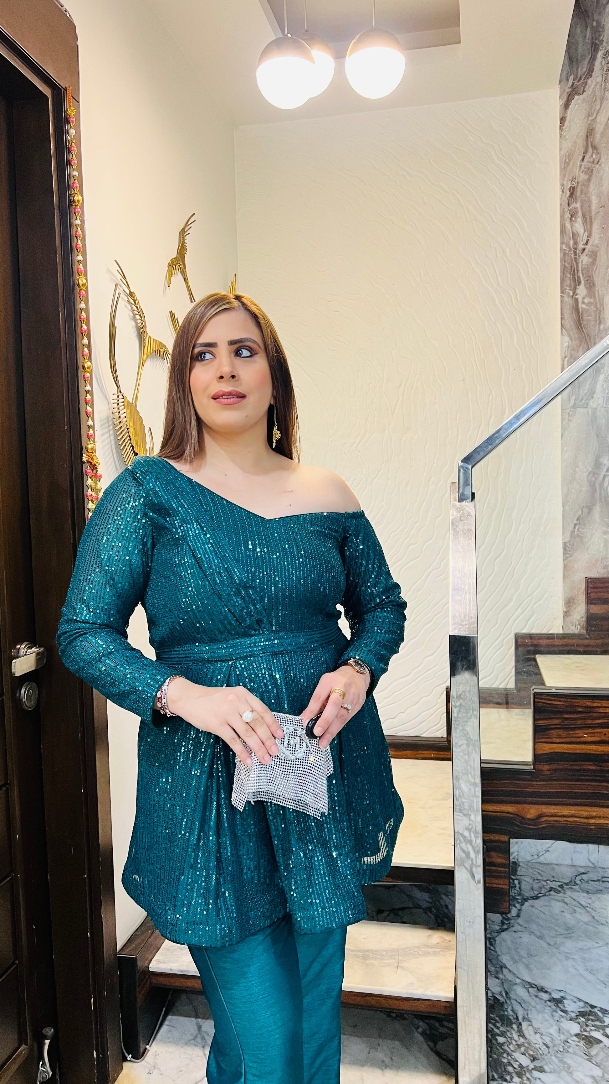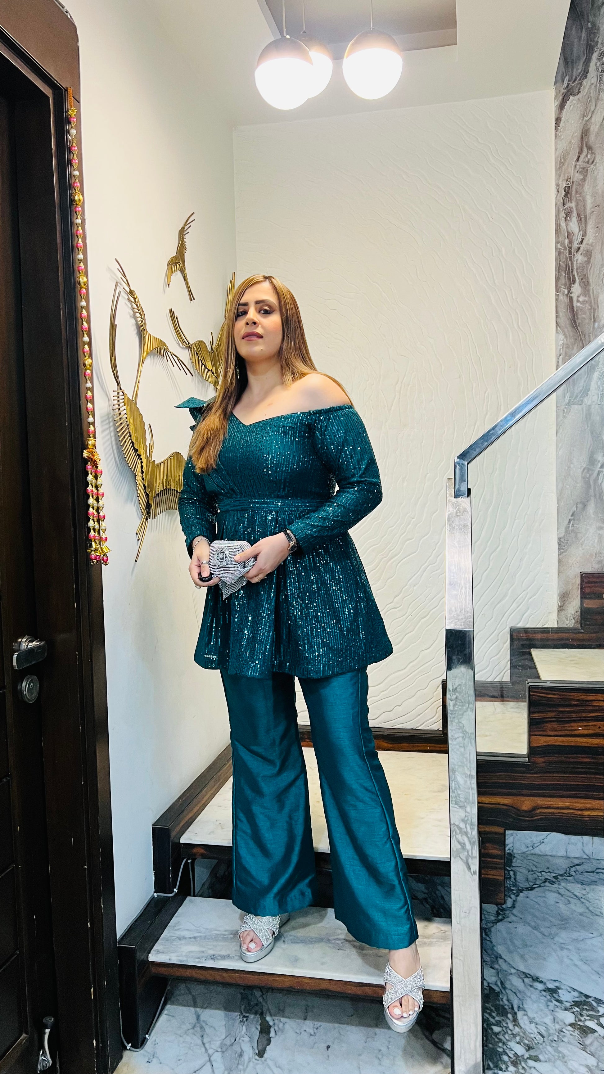 A glamorous Forest Green sequin co-ord with an off-shoulder top and flared pants 🌟✨. Paired with silver heels and a matching clutch, it’s perfect for stylish evening events! 💃💎 |