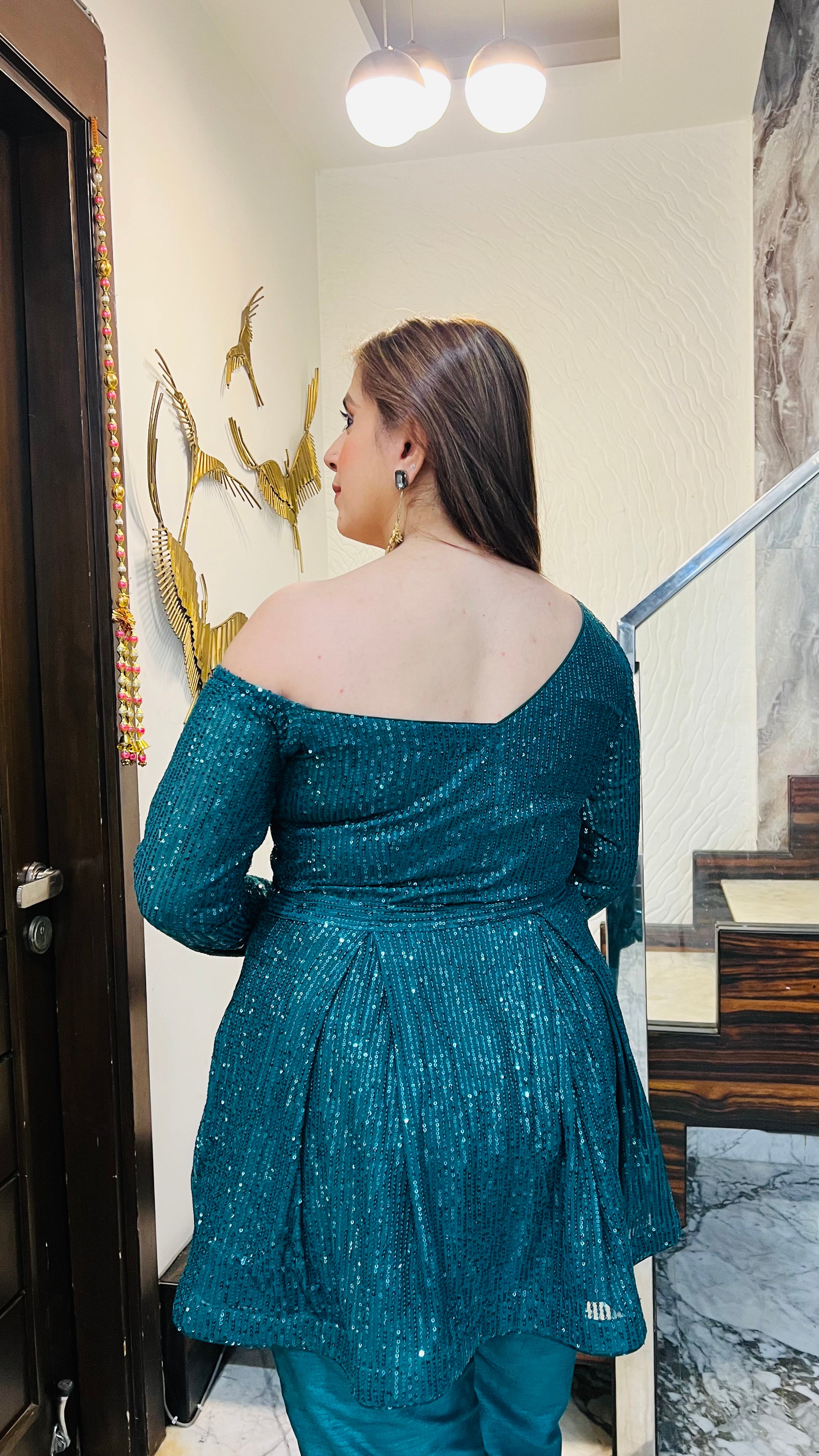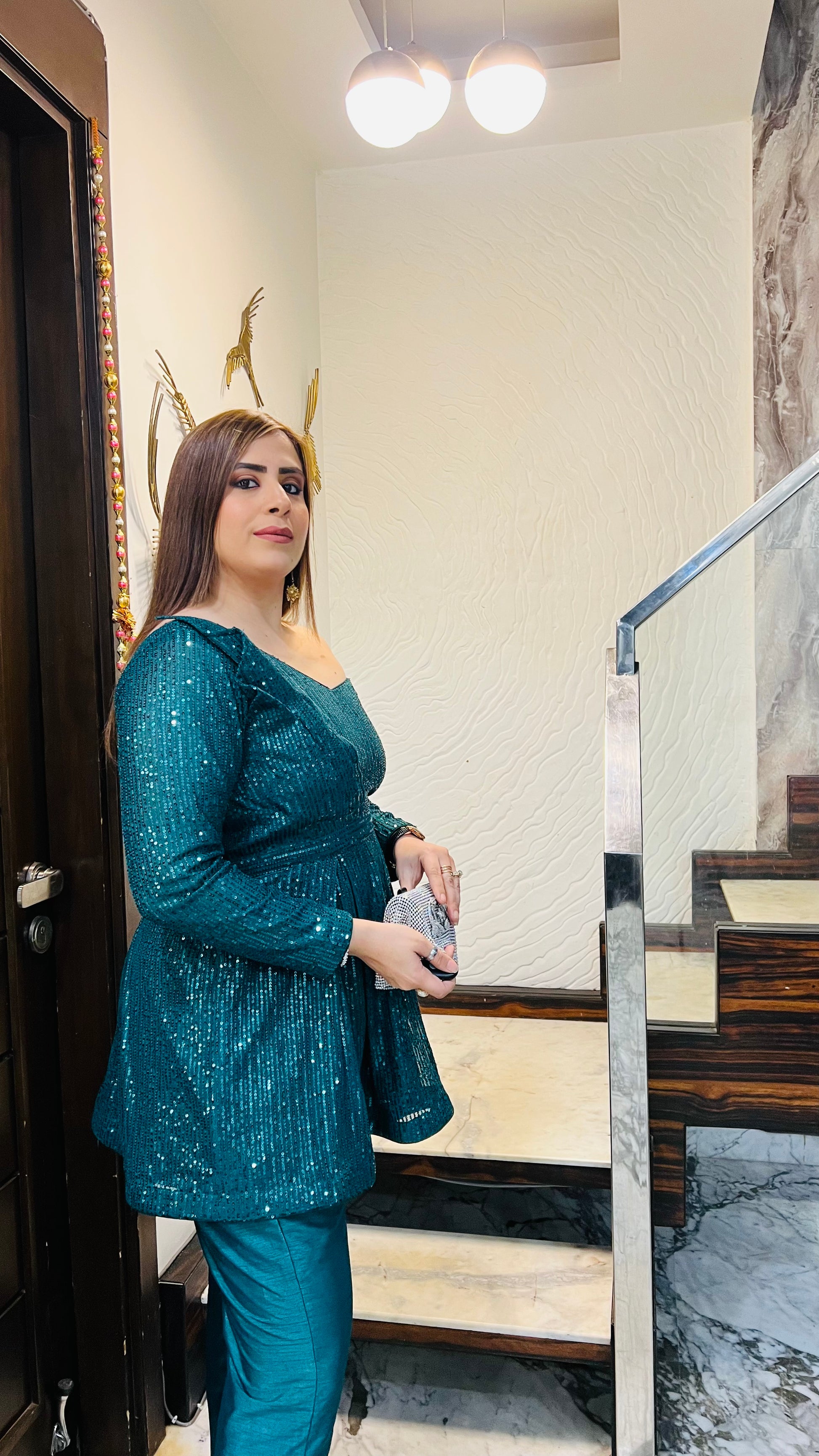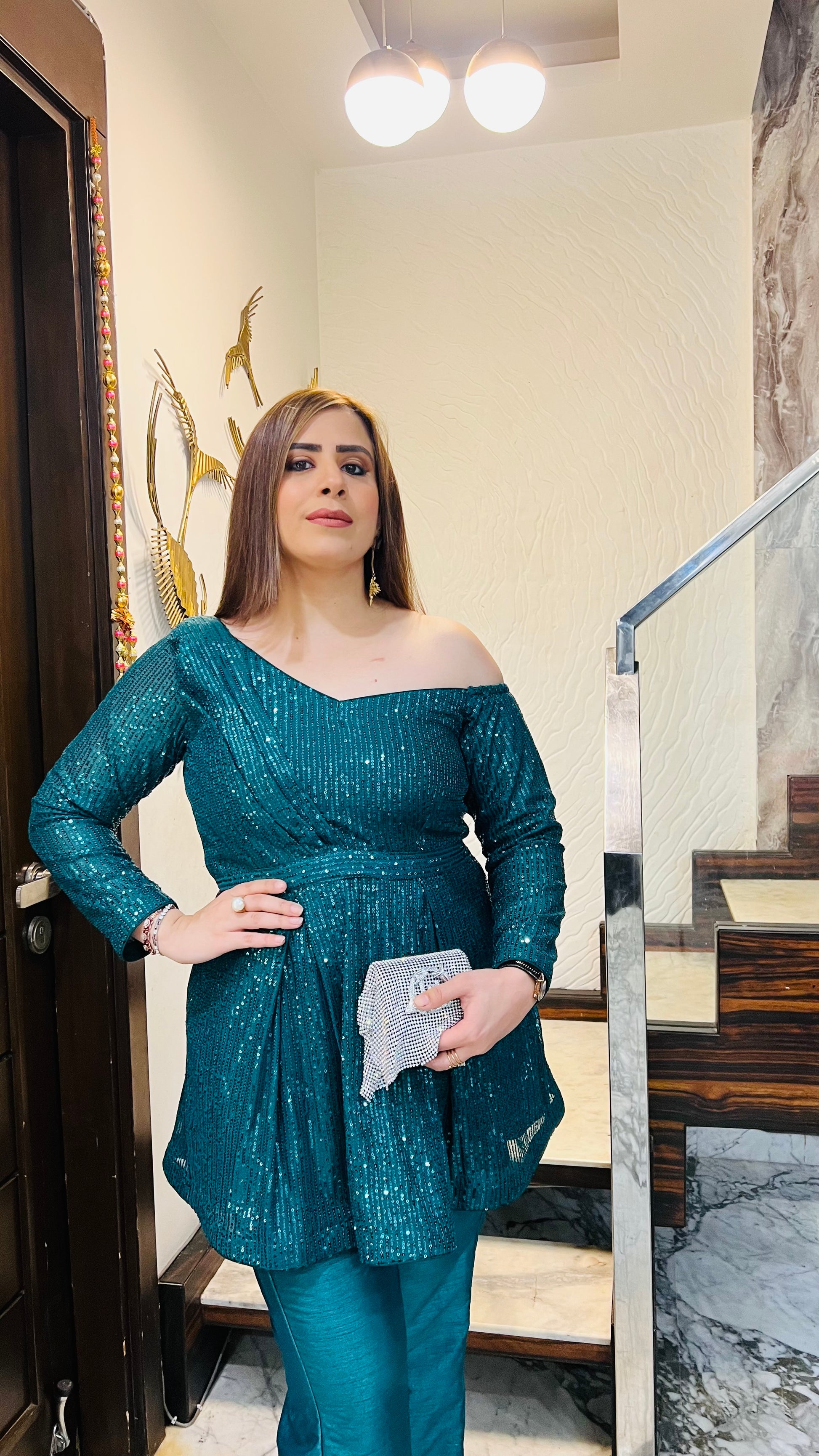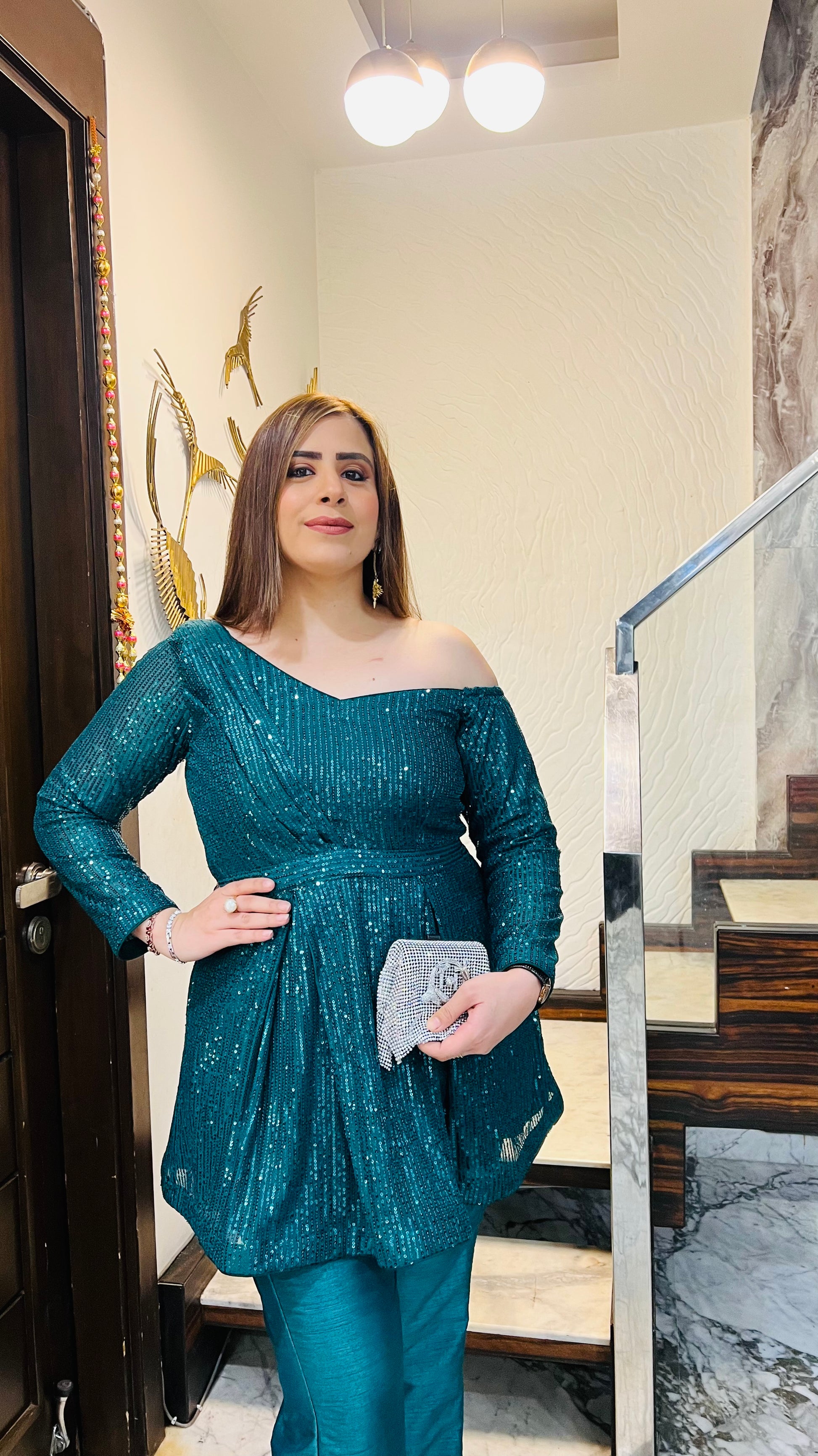 A glamorous Forest Green sequin co-ord with an off-shoulder top and flared pants 🌟✨. Paired with silver heels and a matching clutch, it’s perfect for stylish evening events! 💃💎 |