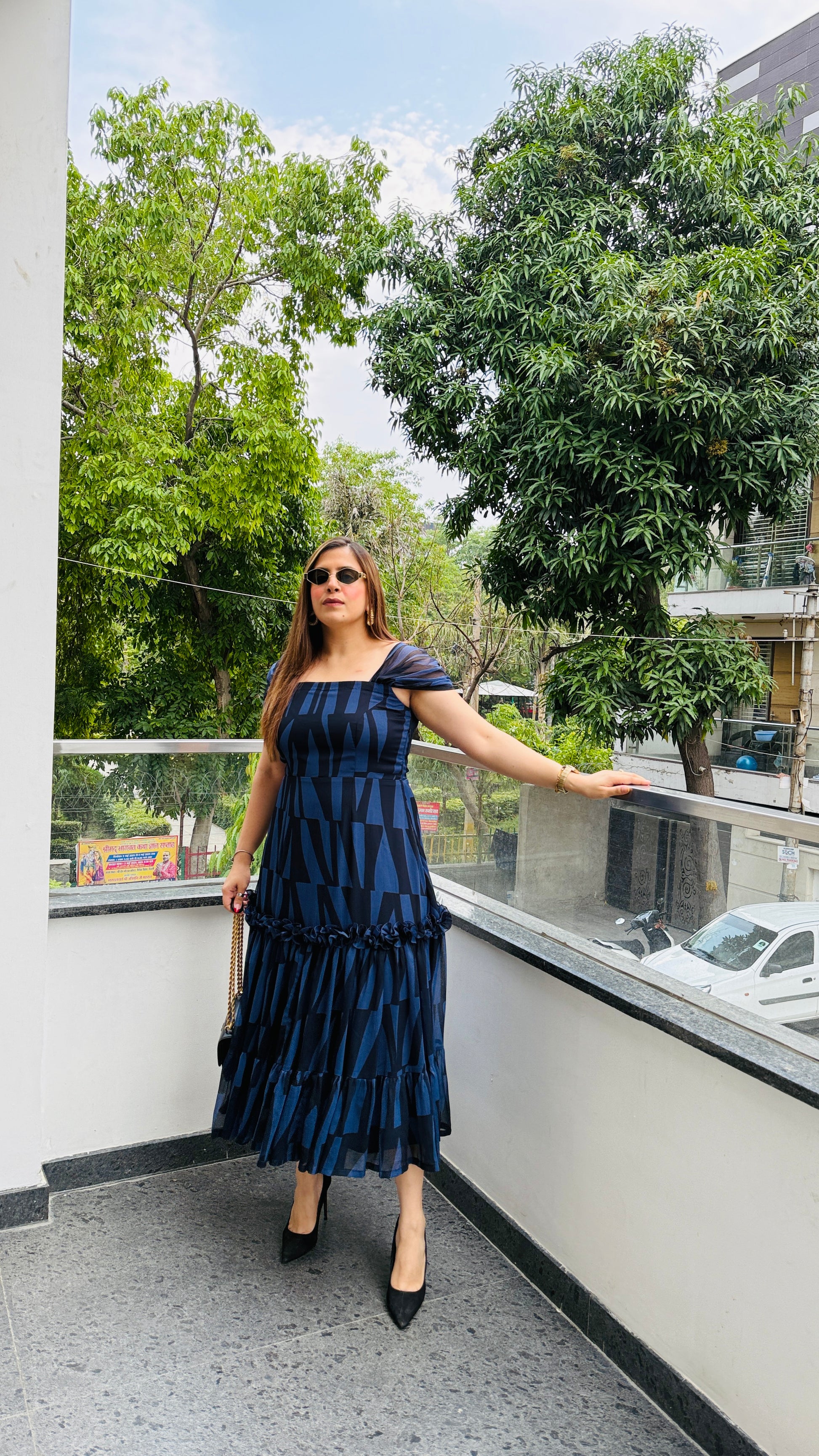 The Geometri-City Midi Dress features bold navy-black geometric patterns 🖤💙, puff sleeves, a square neckline, and a tiered hem. Its structured yet flowy silhouette offers effortless elegance with modern flair 😍👗✨. |