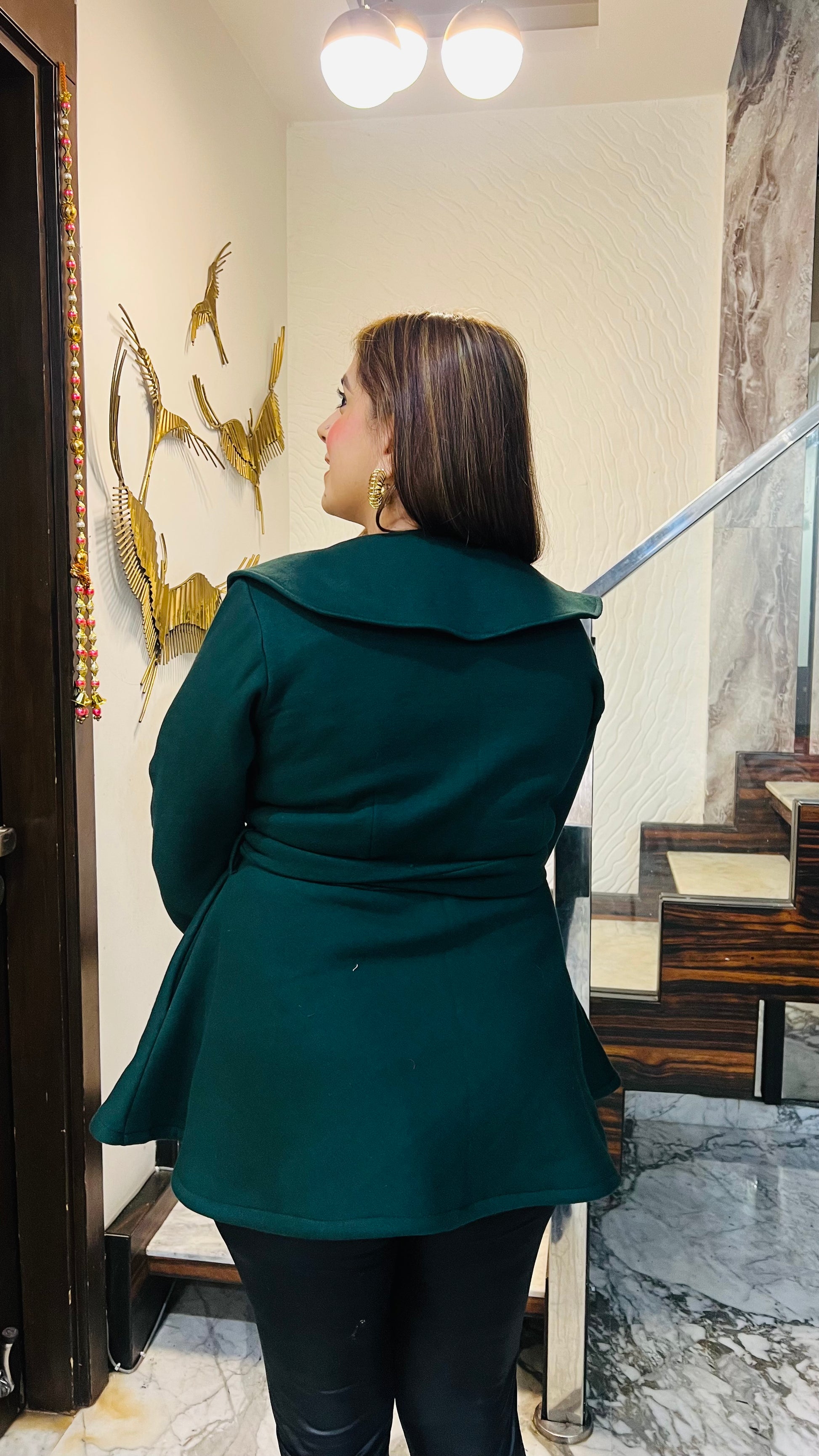 "Elevate your winter style with this stunning green cape coat 💚✨, featuring a chic belted waist and oversized collar. Paired with sleek black pants and a statement handbag 👜👢, pure elegance!" |