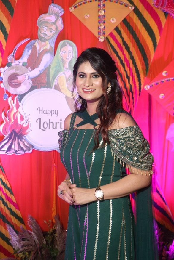 A dazzling emerald green cocktail jumpsuit with intricate golden embroidery ✨, off-shoulder design, and a flowing dupatta adorned with fringes 🌟, perfect for festive celebrations like Lohri 🎉! |