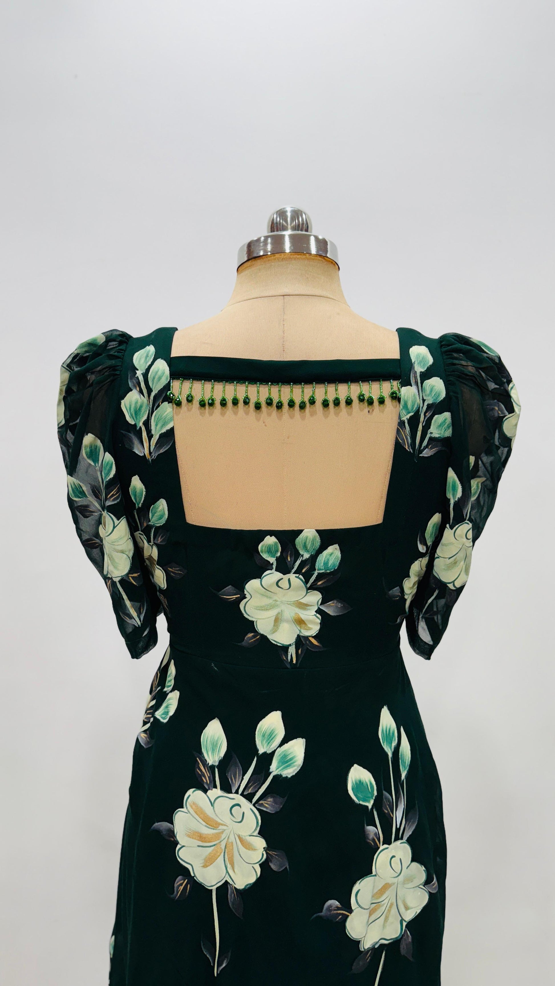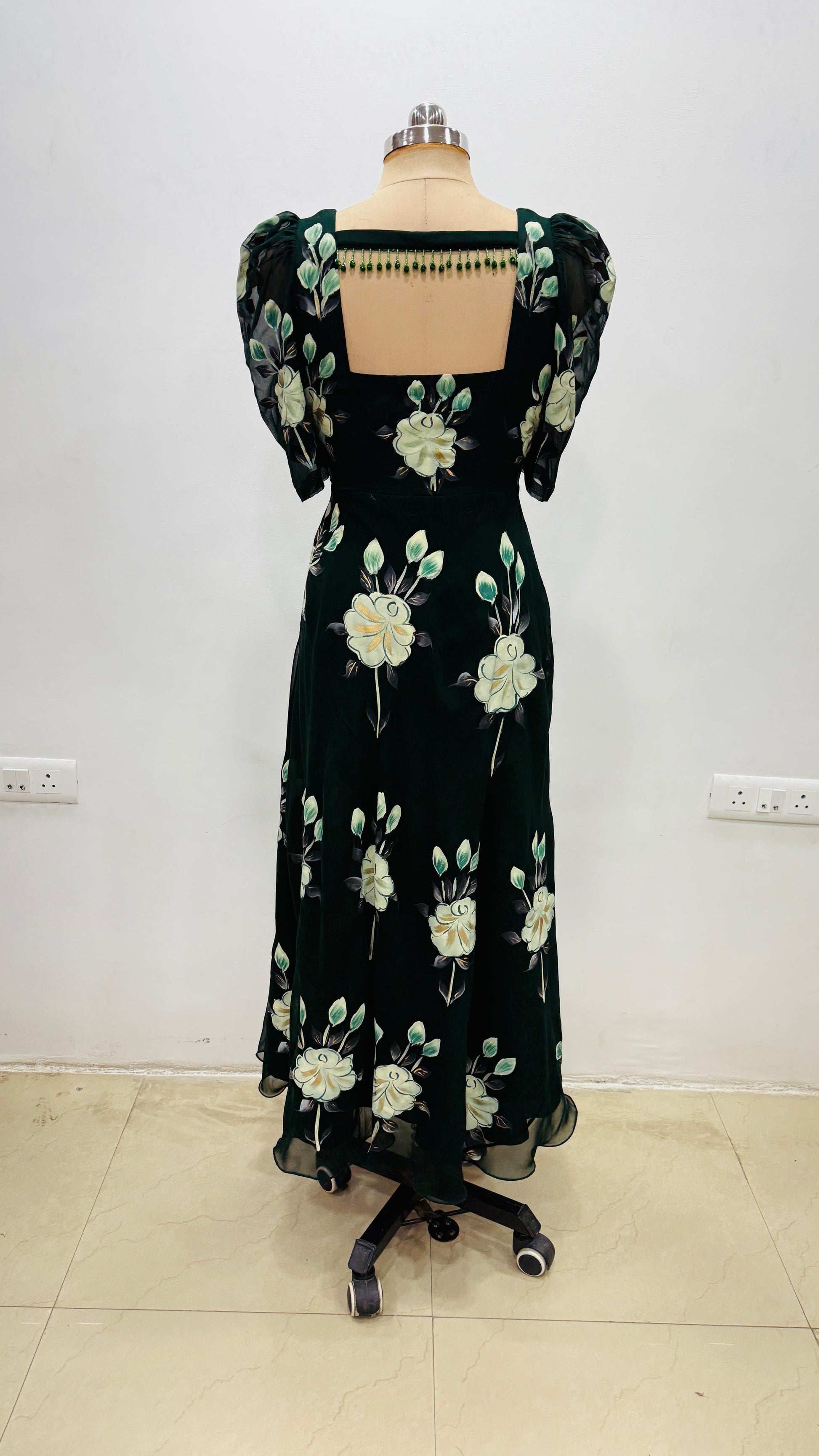 Elevate your ethnic charm in this deep green hand-painted Anarkali 🌿✨ adorned with ivory floral motifs 🌸, puff sleeves, and a matching dupatta detailed with intricate circular embroidery 🪡💫. Perfect for festive elegance! 💚 |