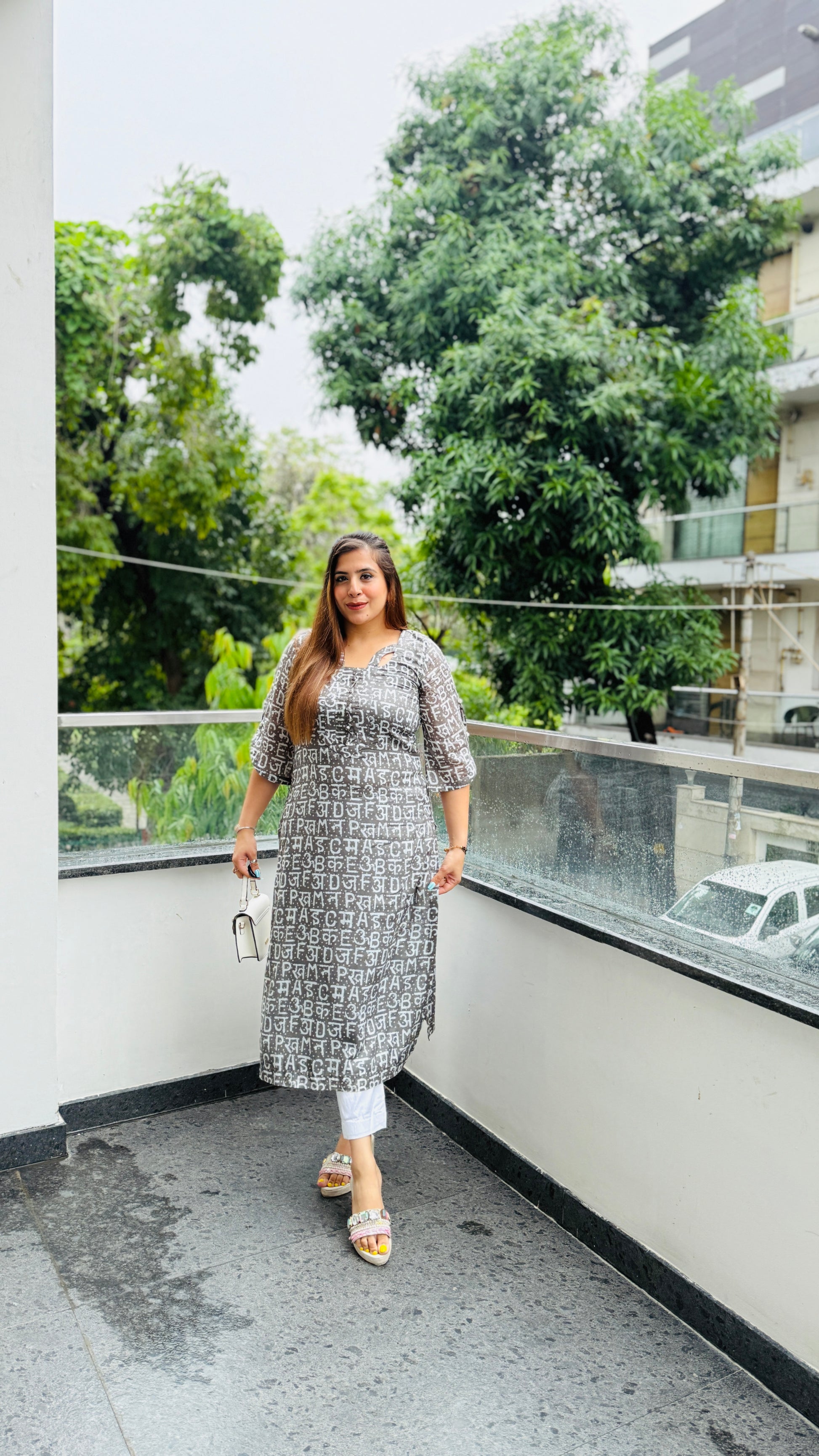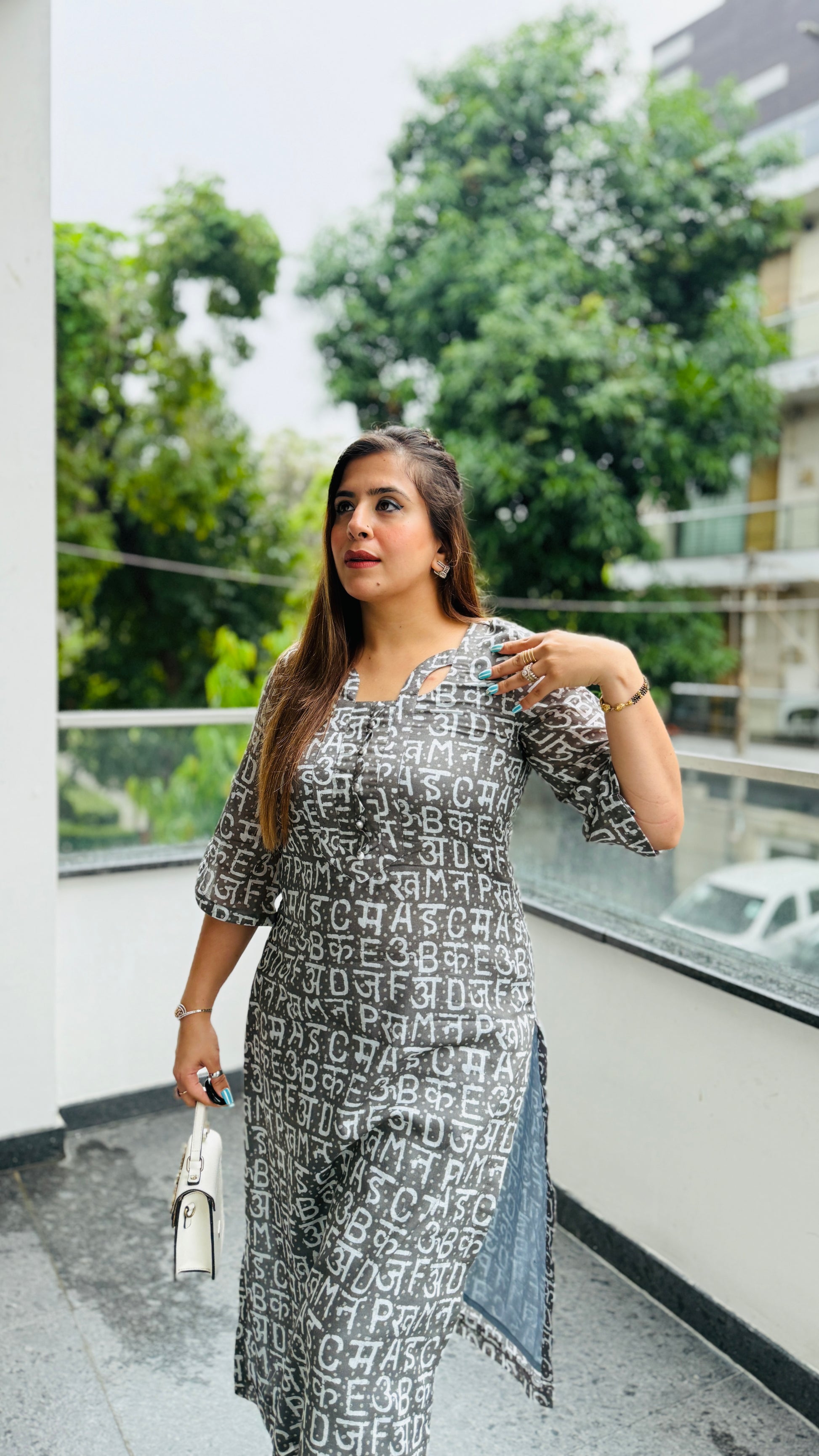 💚 Add charm to your everyday look with this Grey Text Me Mal Cotton Kurti 🌿 featuring bold white typography, puff sleeves, square neckline & comfy straight silhouette. Perfect for monsoon moods ☔✨ |