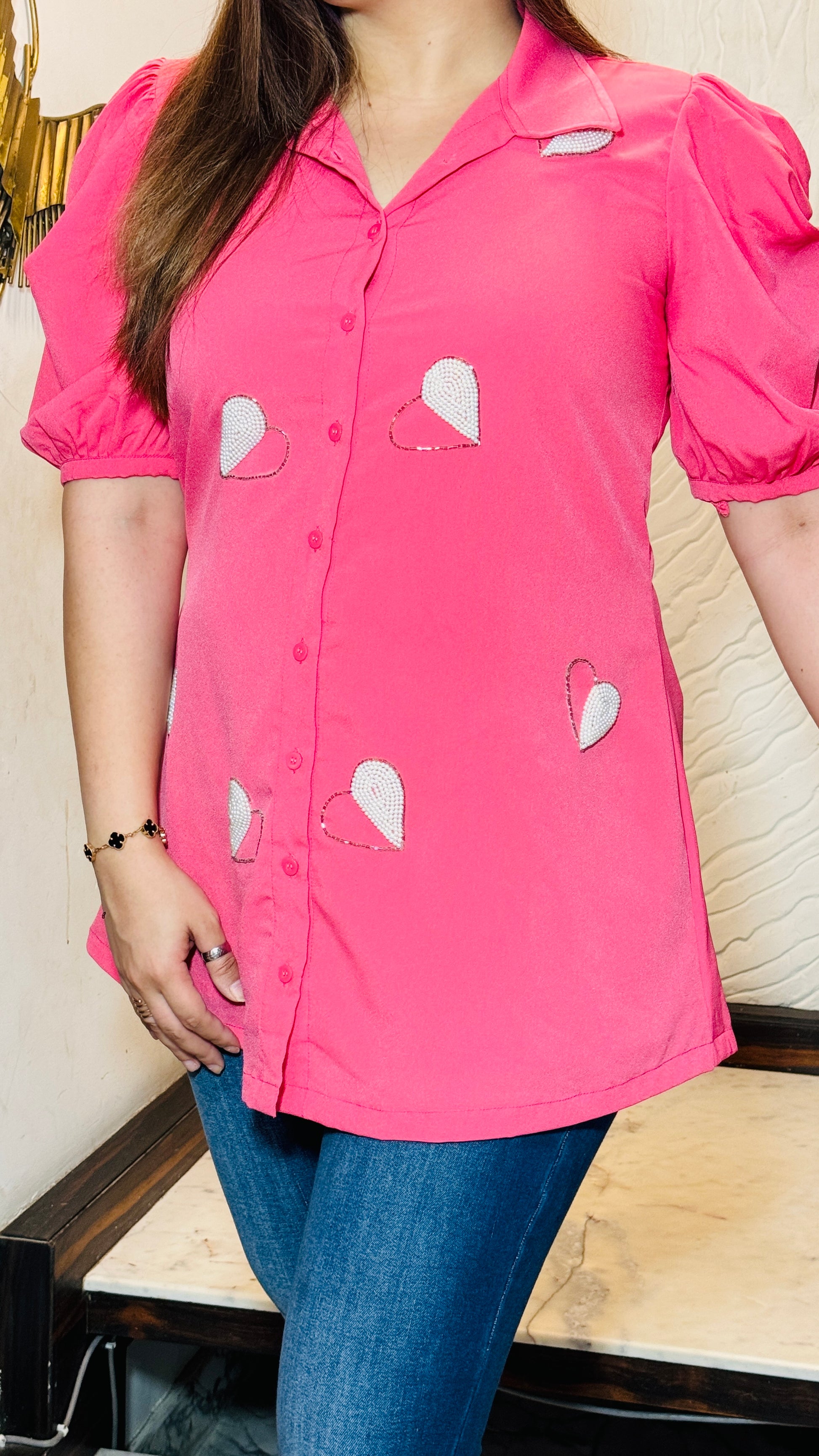 Fall Half-way to Heart 💖 in this cute pink puff-sleeve shirt 💕, dotted with silver heart patches ✨. Paired with denim, it’s playful, comfy, and totally Insta-worthy! 📸👖💫 |