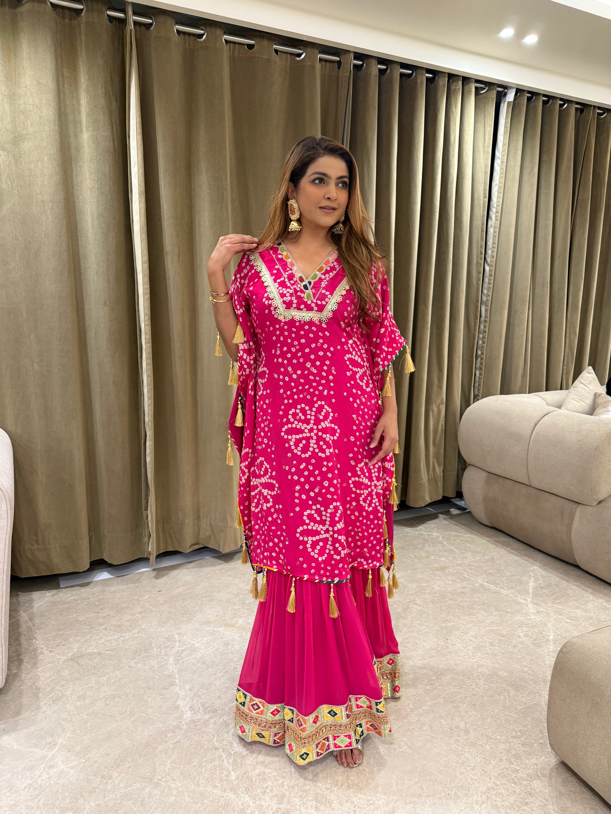 ✨ Bright and festive, this Pink Bandhini Kaftaan Garara Co-Ord 💛 features intricate mirror work neckline, tassel details 🎀, and a flared garara with vibrant gota border 🌸—ideal for celebrations 🎉. |