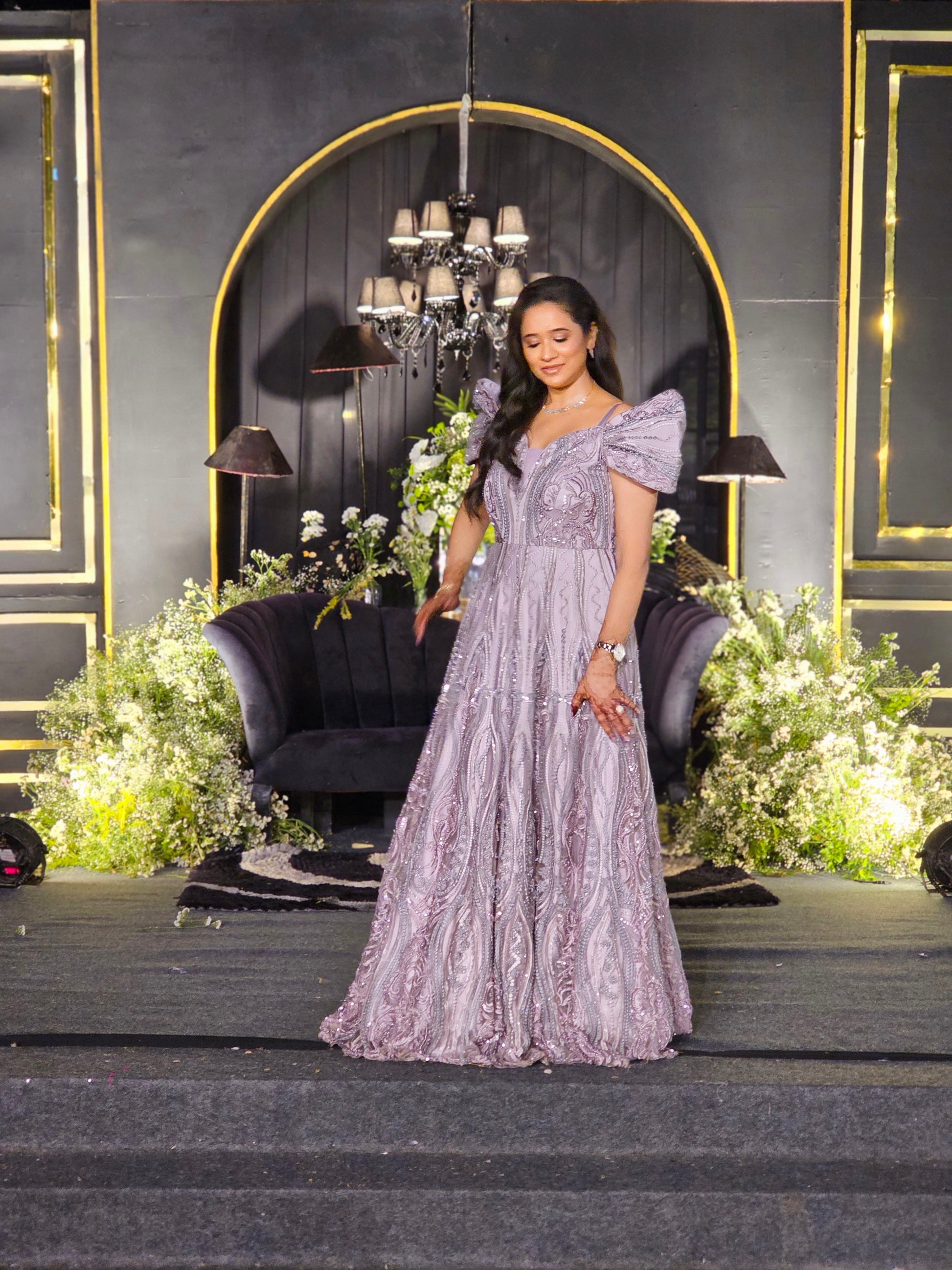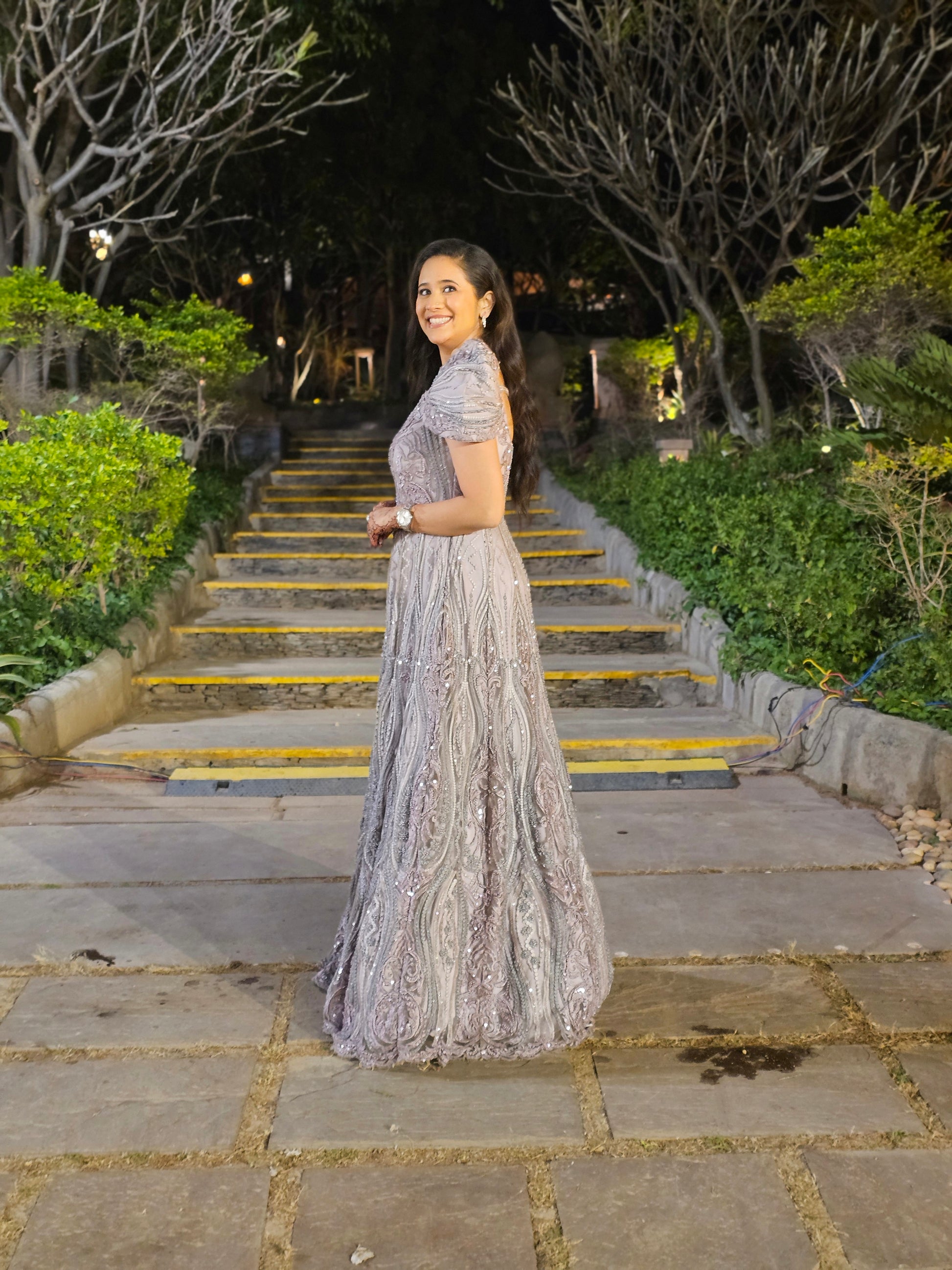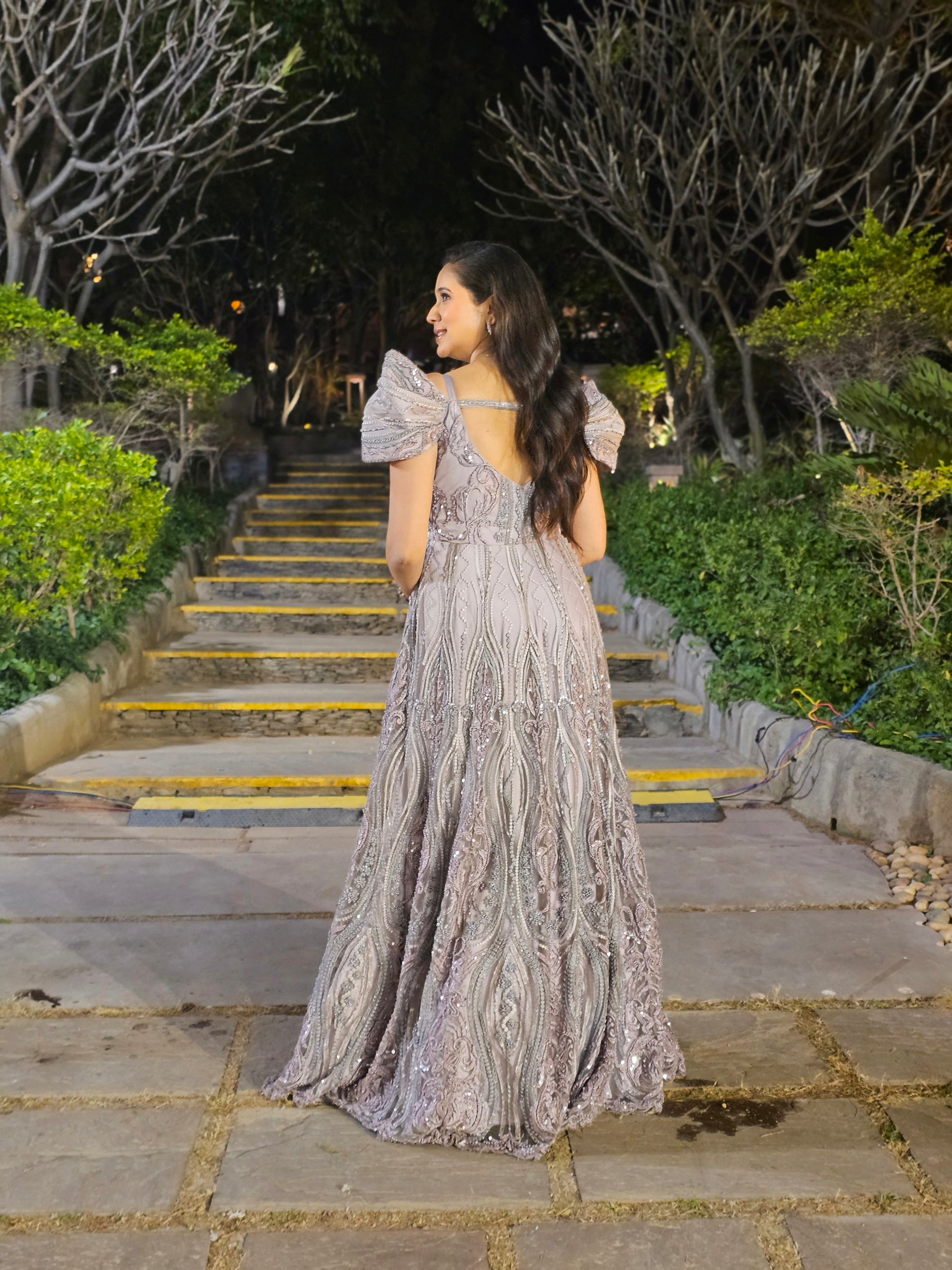 The EXTRA-Vagant Grey Gown exudes elegance 👑 with intricate embroidery ✨, a flowing silhouette 🌿, and statement puff sleeves 💜. Perfect for grand celebrations 🎉, it radiates grace, luxury, and timeless charm. 💫 |