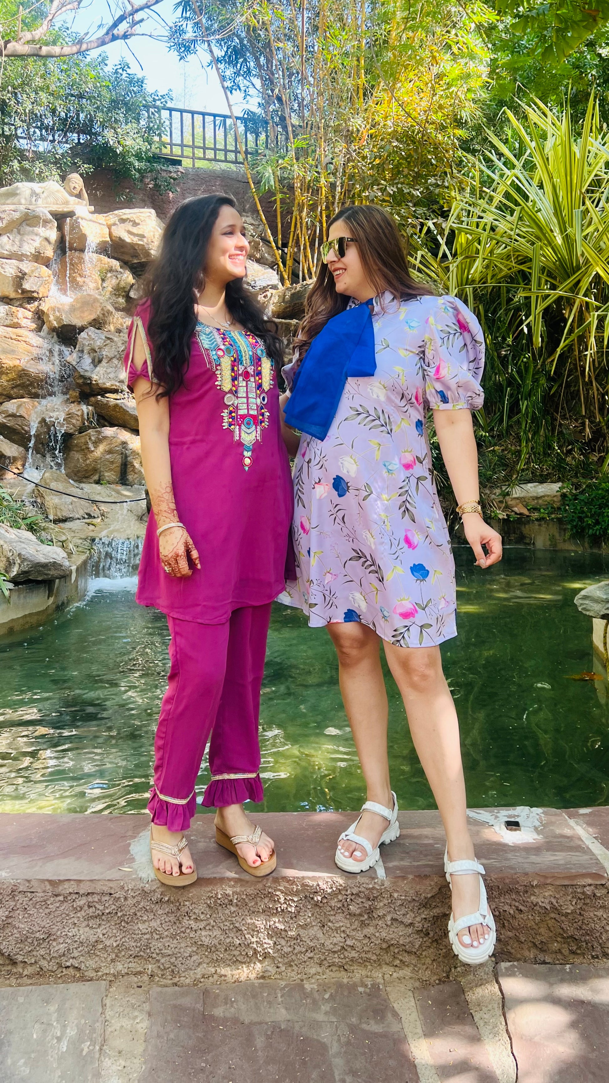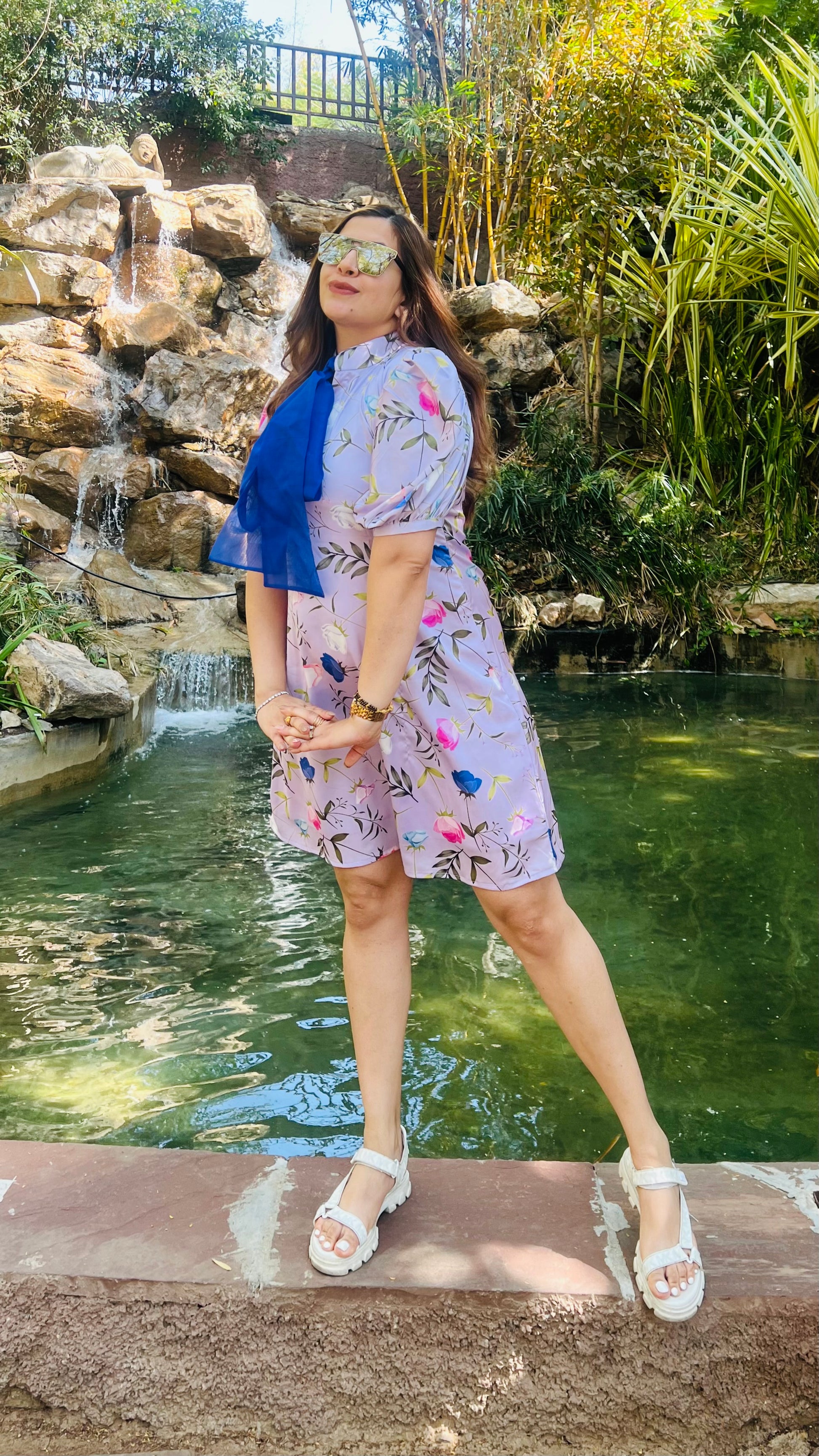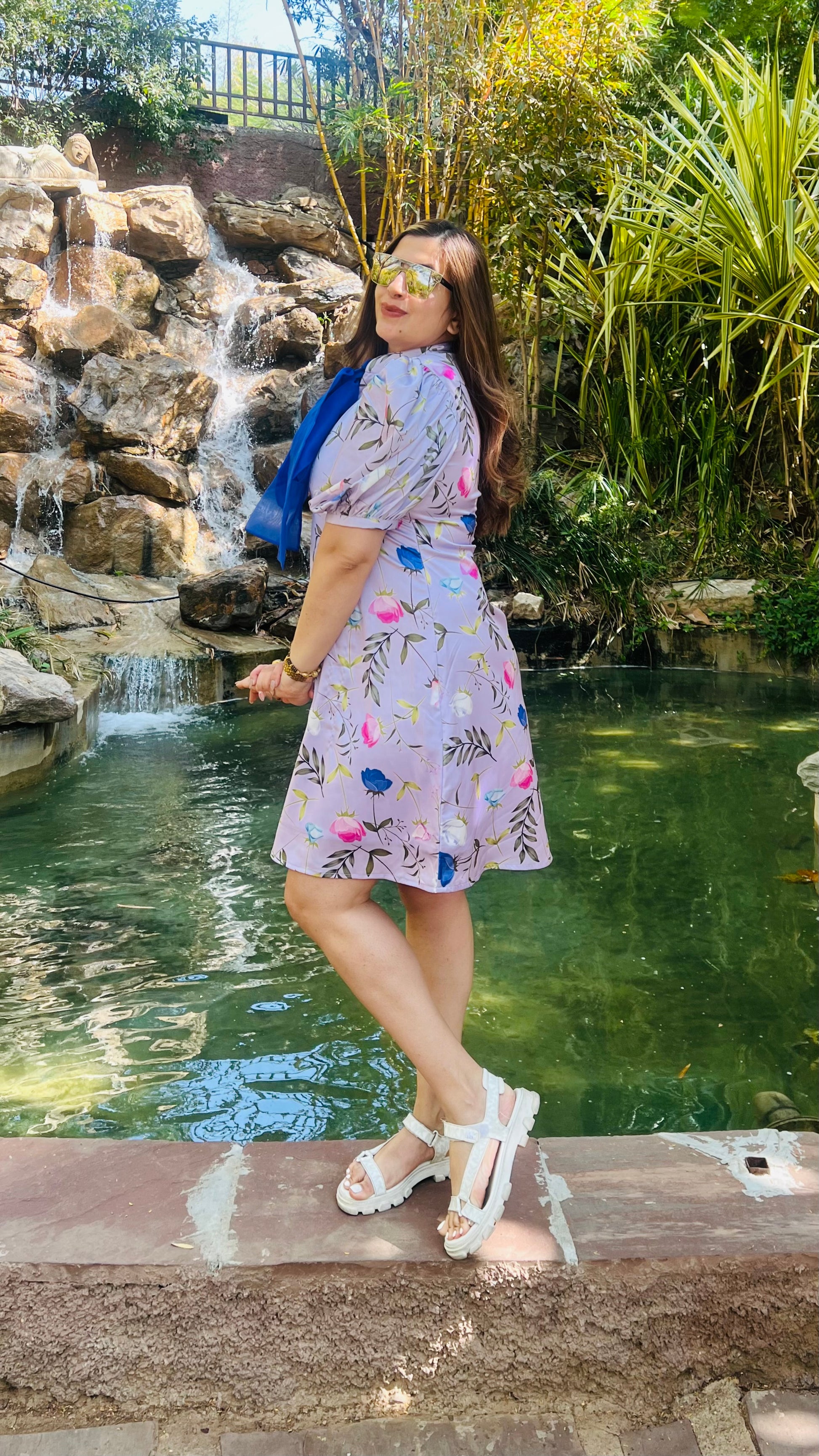 A stunning 🌸 lilac Italian satin dress featuring a delicate floral print 🌿, elegant puff sleeves ✨, and a bold blue bow 🎀. The flowy silhouette adds grace, perfect for chic outings 💃. |
