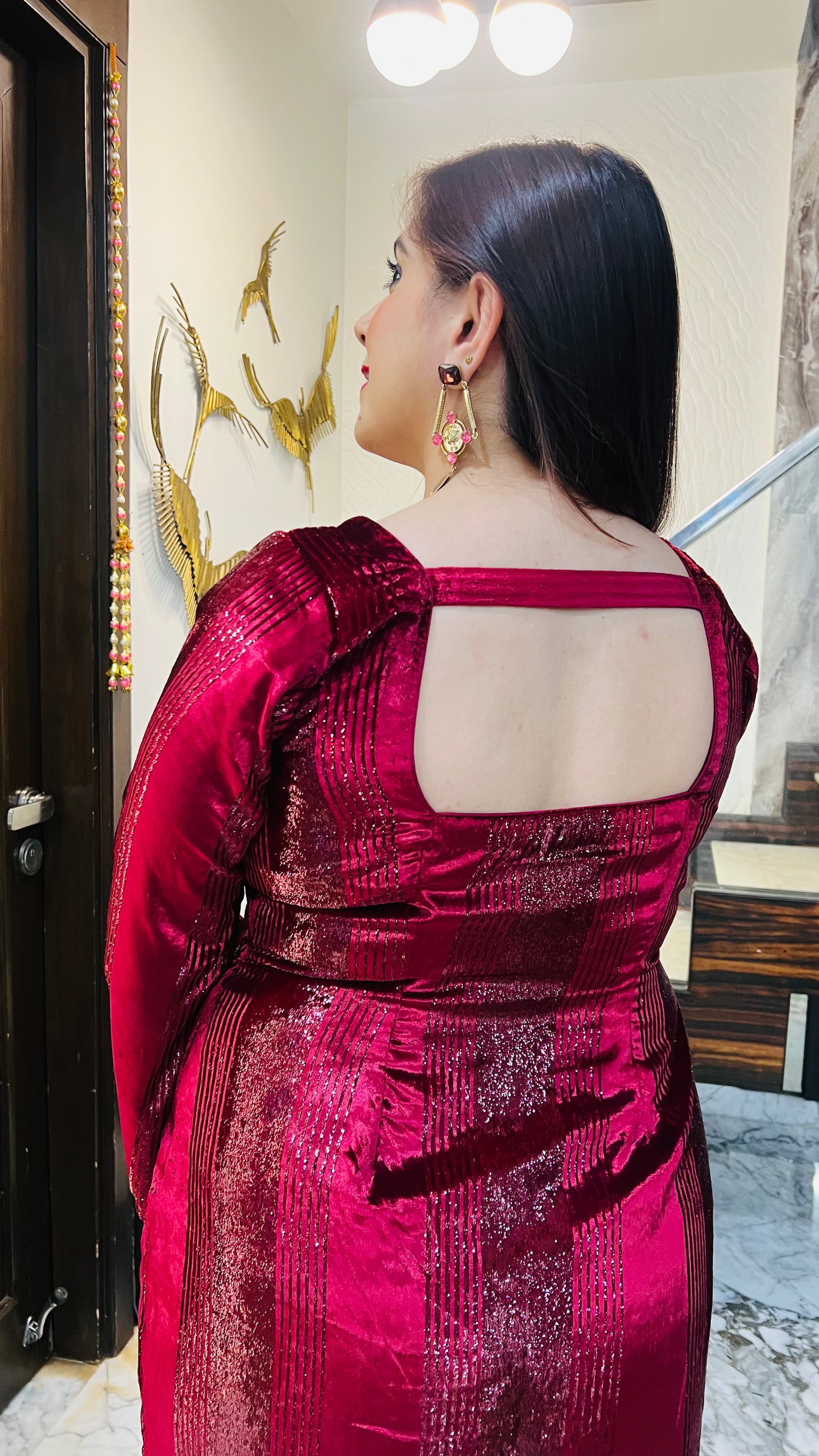 Elegant Maroon foil velvet dress with a square neckline, long flared sleeves, and shimmering patterns. Styled with black tights, boots, and a mini bag for a chic look. ✨🖤 |