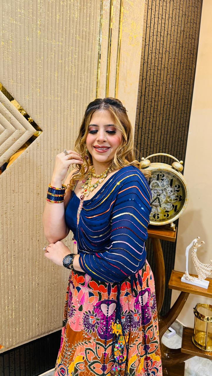 | Description | Lakhina Couture presents this elegant contemporary ethnic lehenga set, designed for modern celebrations. Featuring a padded fusion blouse with draped saree-style detailing and a flowy multicolour crepe lehenga, this outfit is perfect for weddings, parties, and festive occasions. |