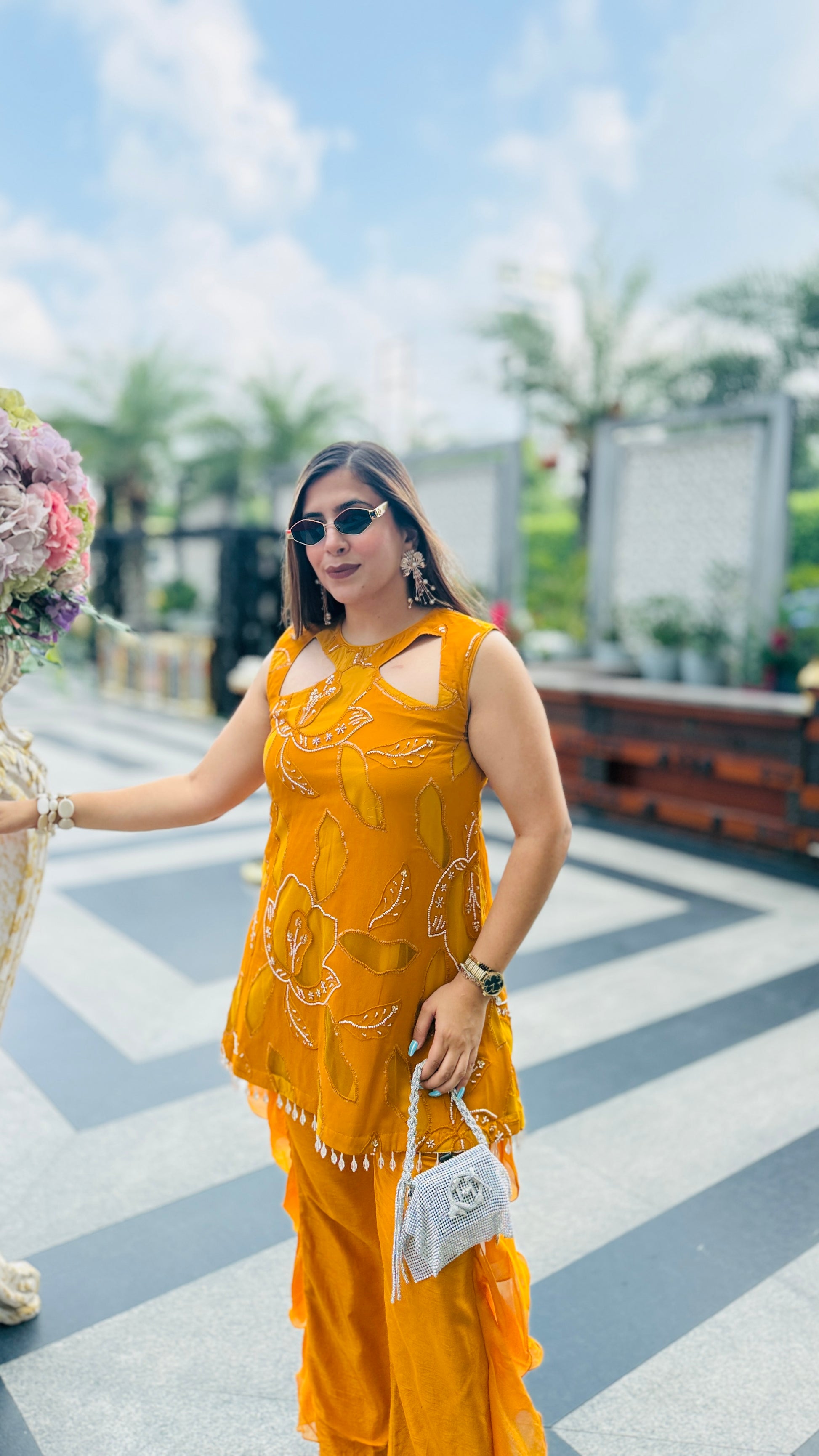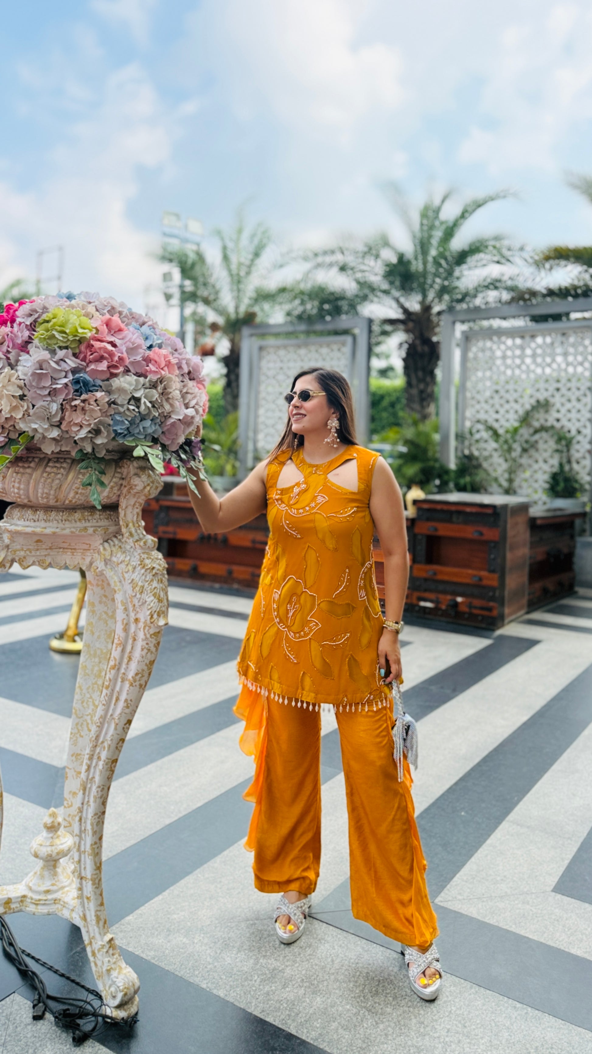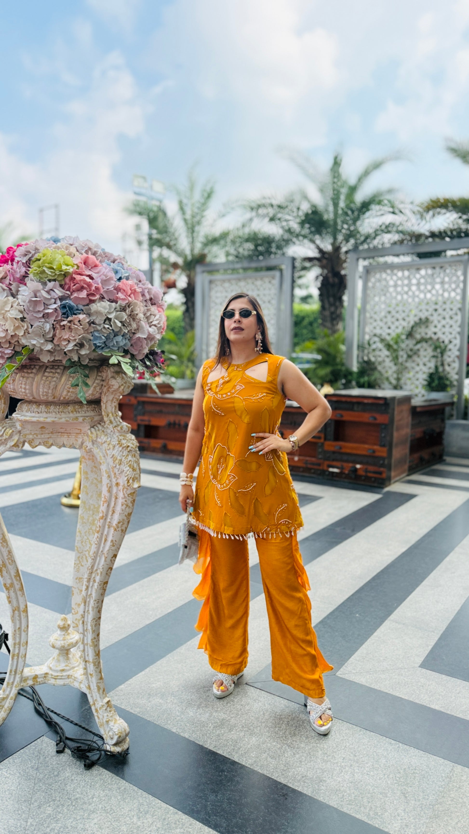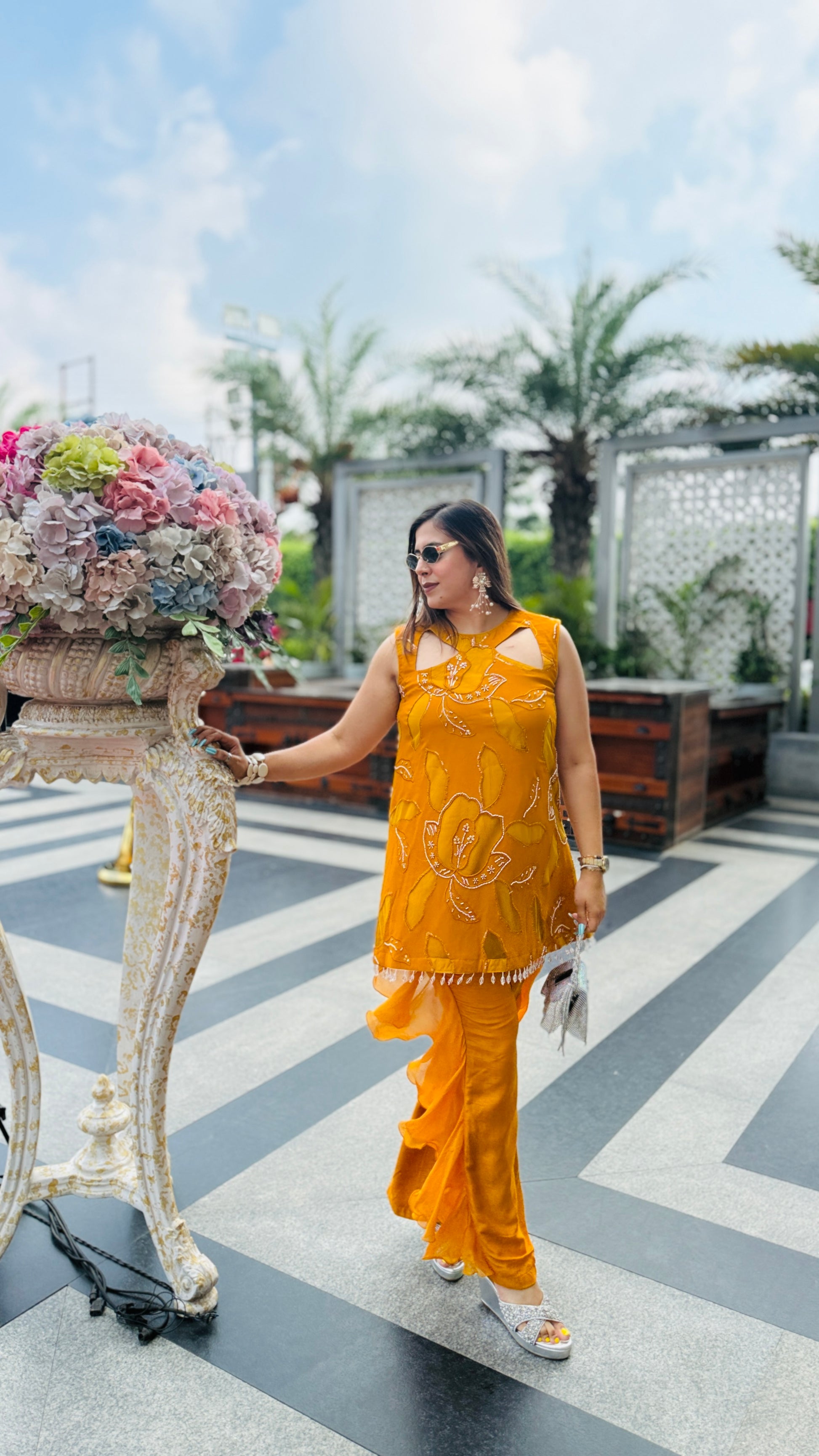 Turn heads in this Mustard Hollywood Co-Ord 💖✨ Featuring chic cut-out detailing, bold floral embroidery, and dramatic ruffle pants 🎀👖—perfect for your glam moments under the sun! 😎🌸💃 |