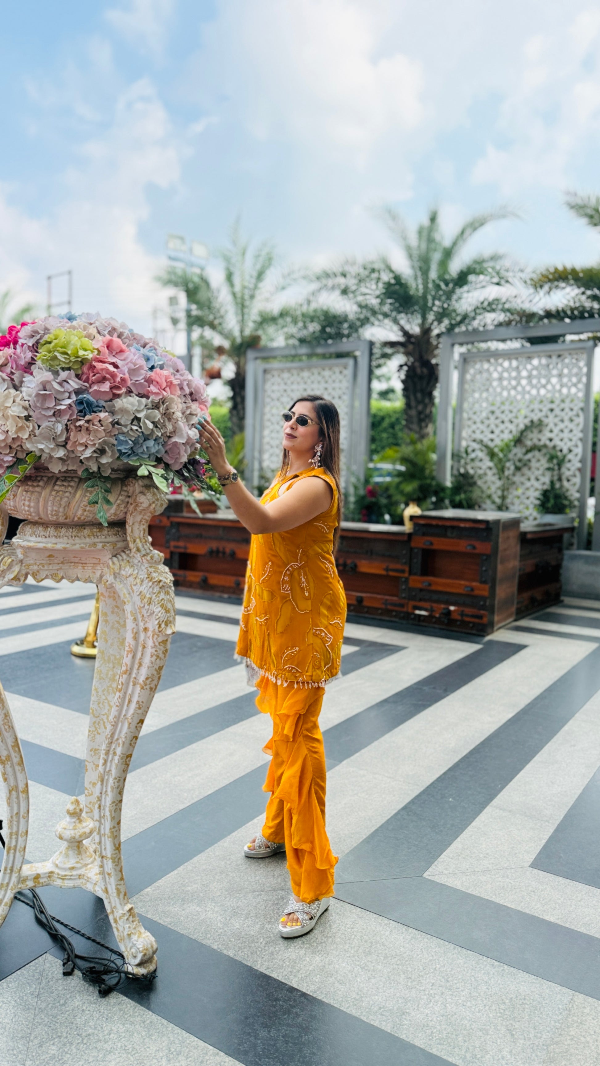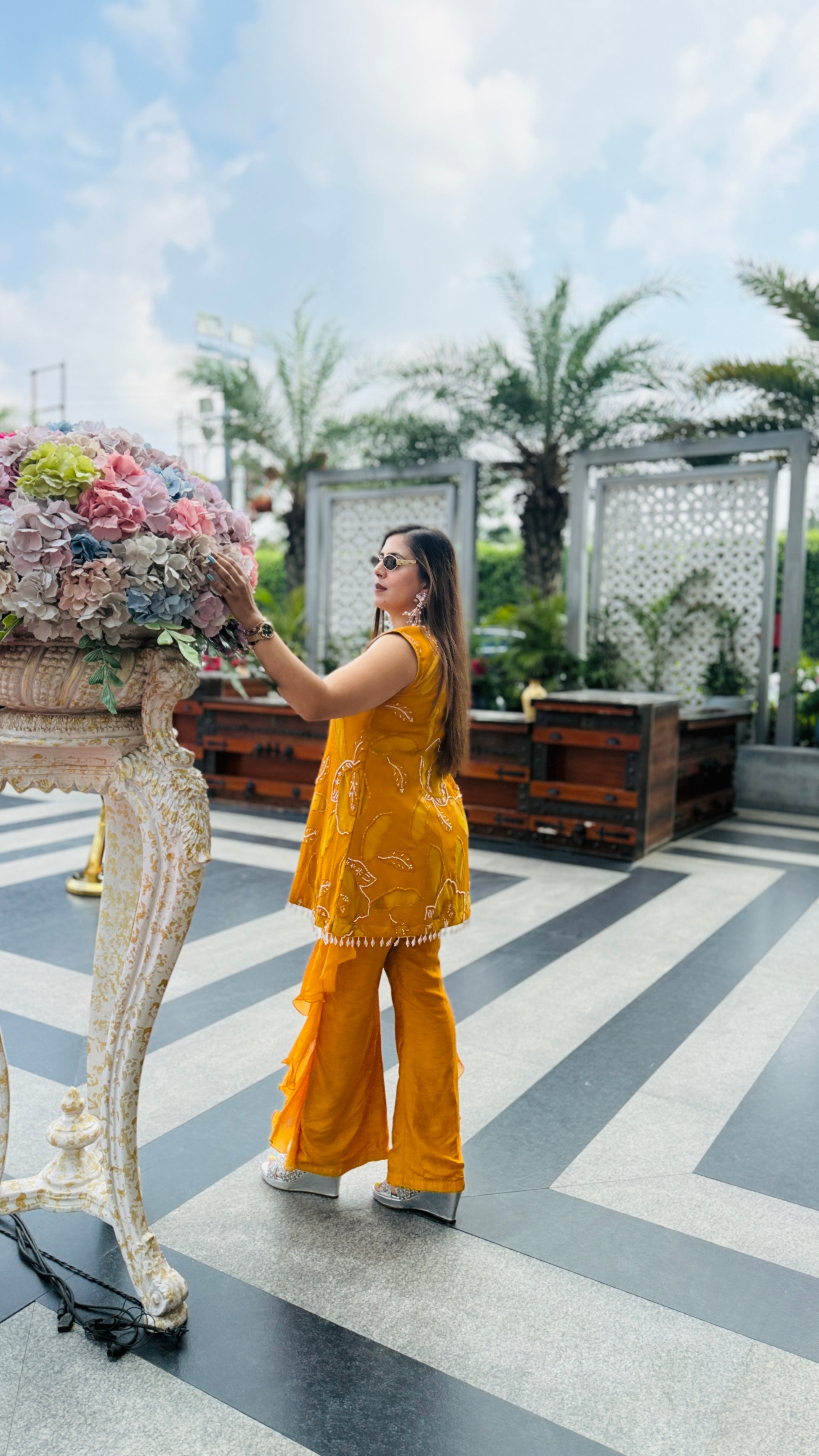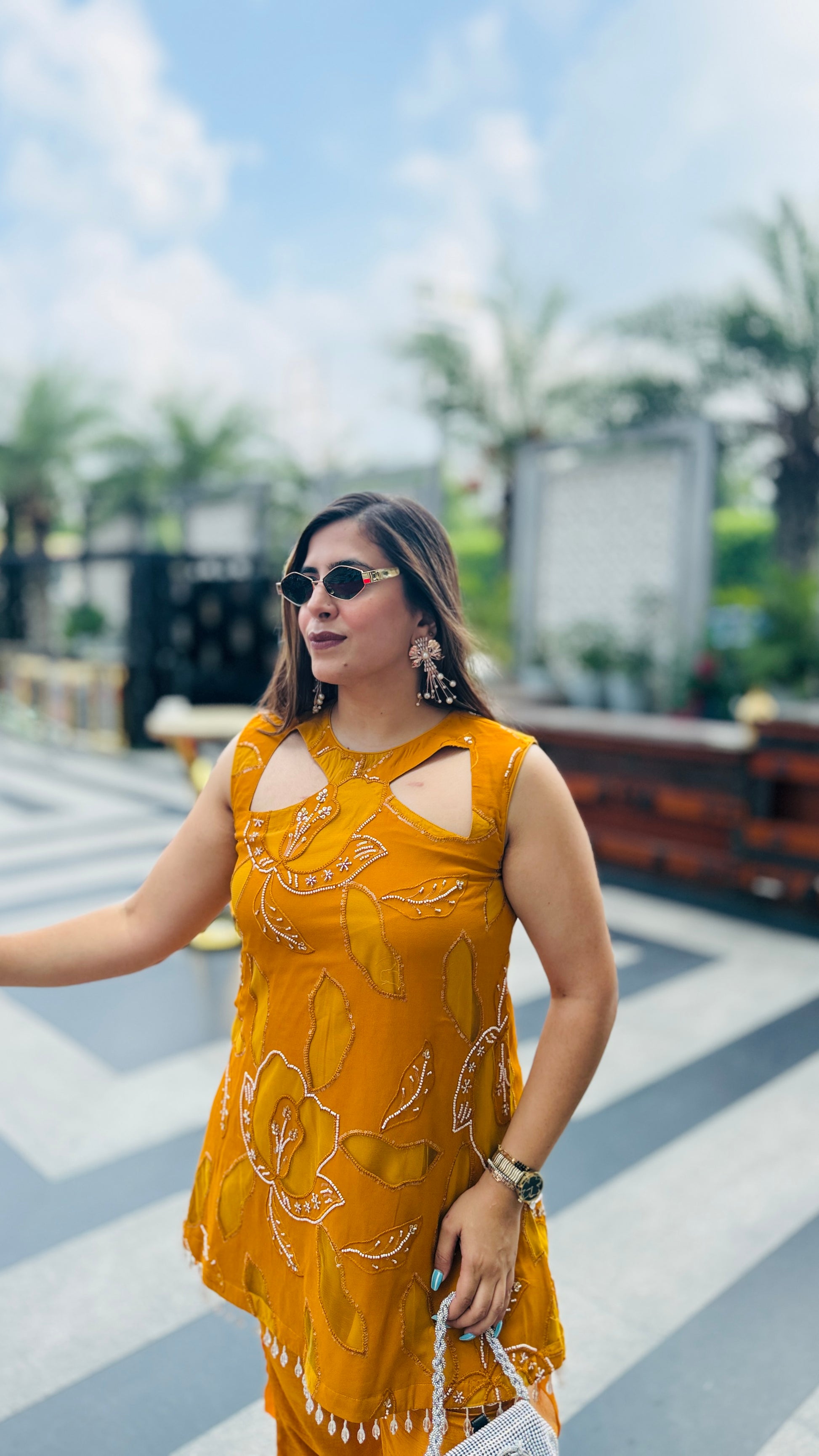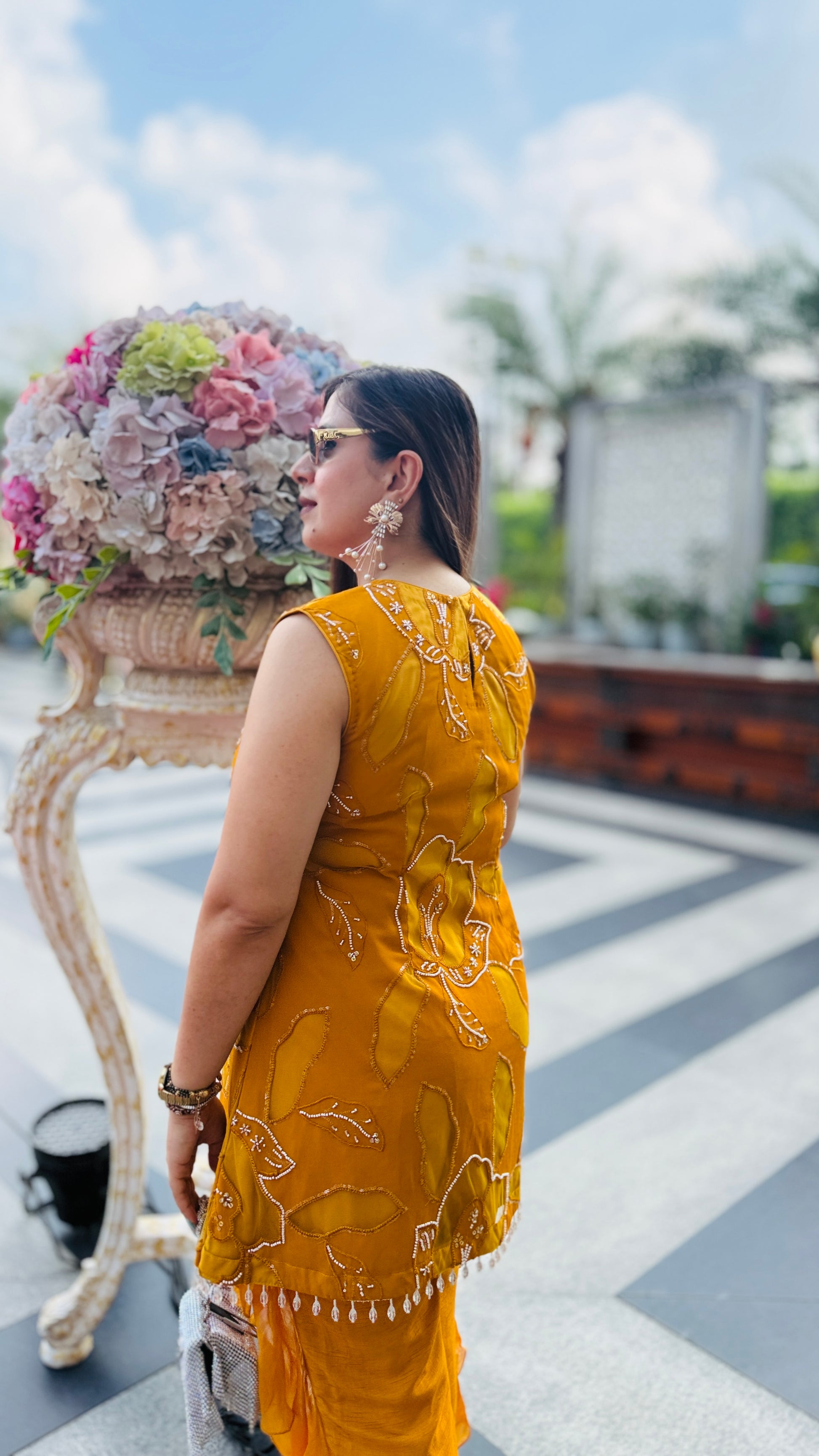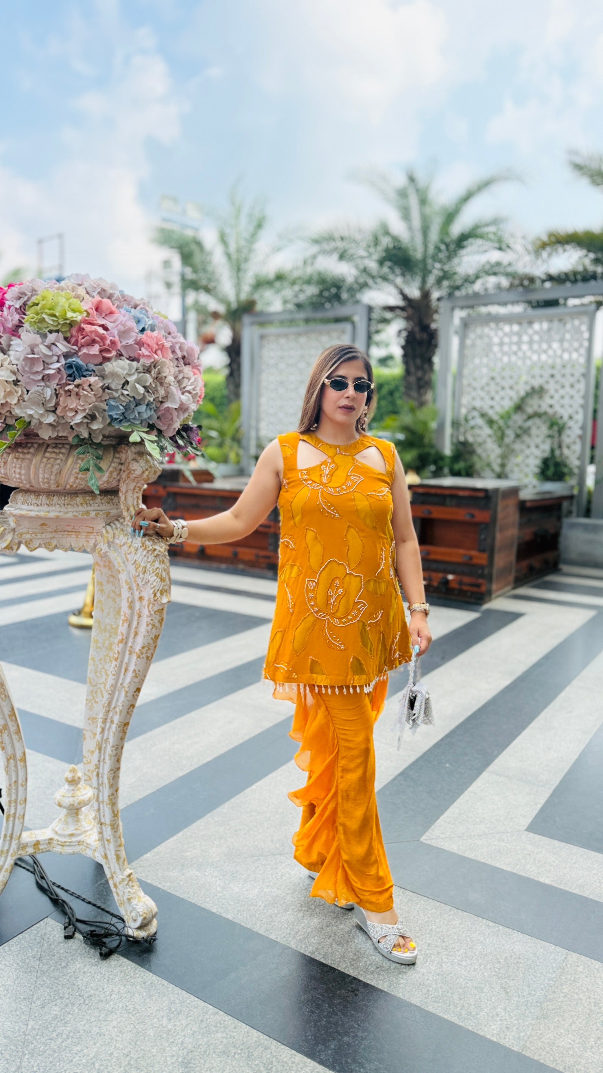Turn heads in this Mustard Hollywood Co-Ord 💖✨ Featuring chic cut-out detailing, bold floral embroidery, and dramatic ruffle pants 🎀👖—perfect for your glam moments under the sun! 😎🌸💃 |