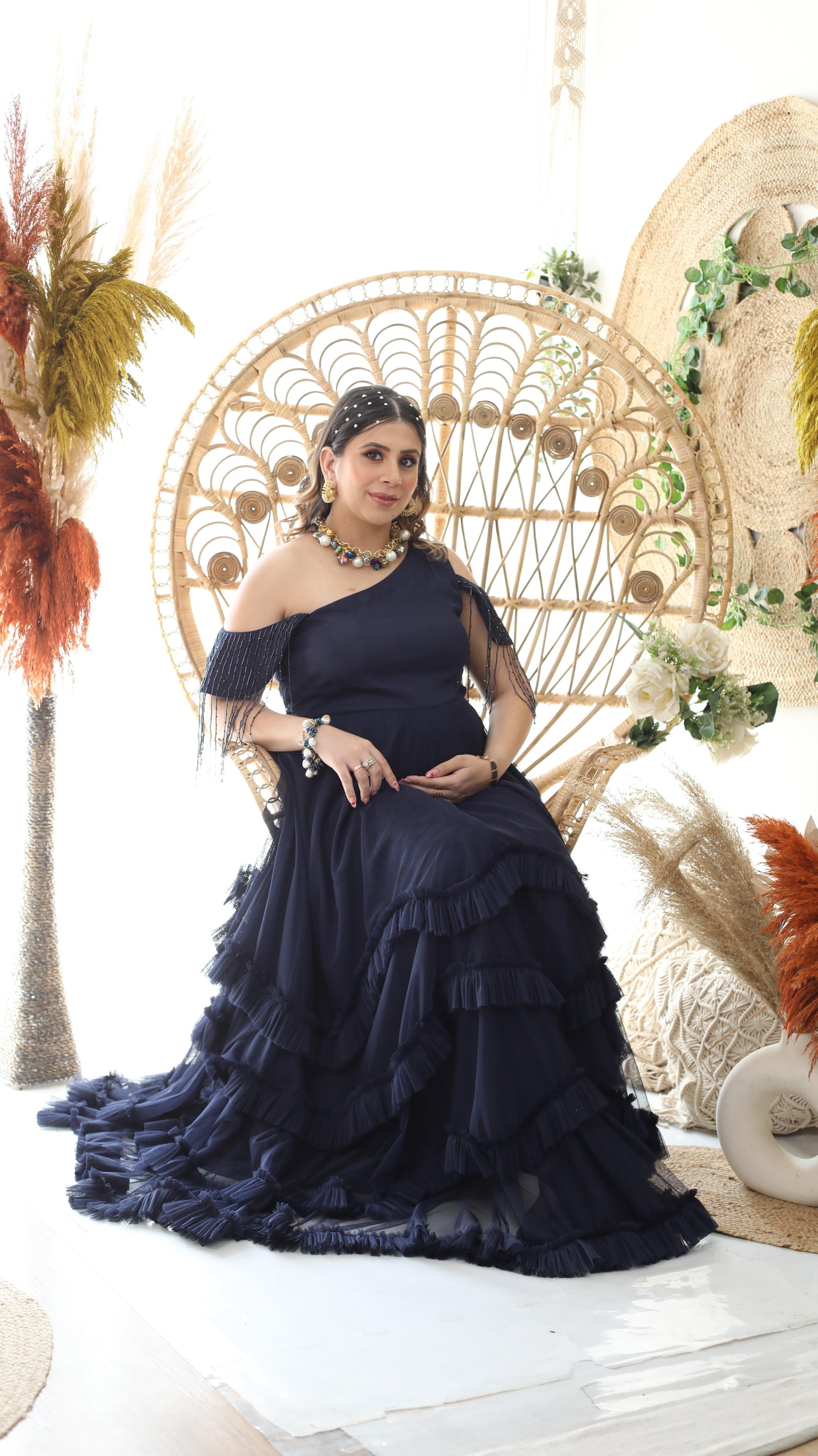 Radiate confidence in this navy blue fringe mama gown, a chic and stylish choice for the modern-day fashionista. 💙🌟 #FashionForward