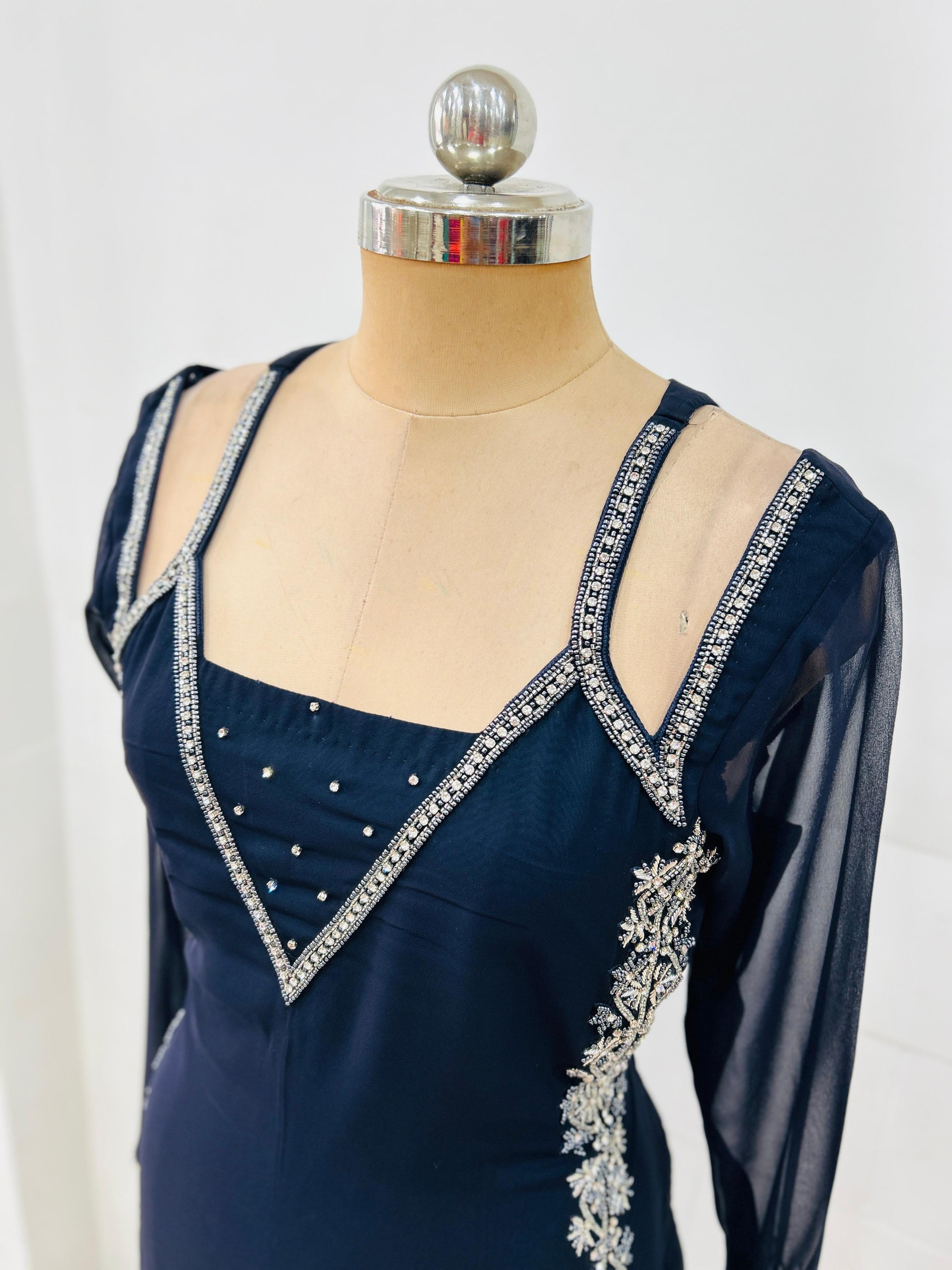 This elegant Navy Blue kurti ✨ features silver embellishments 🌟, sheer cold-shoulder sleeves, and a flattering straight-cut design. Perfect for special occasions, it blends modern style with traditional charm 💫. |