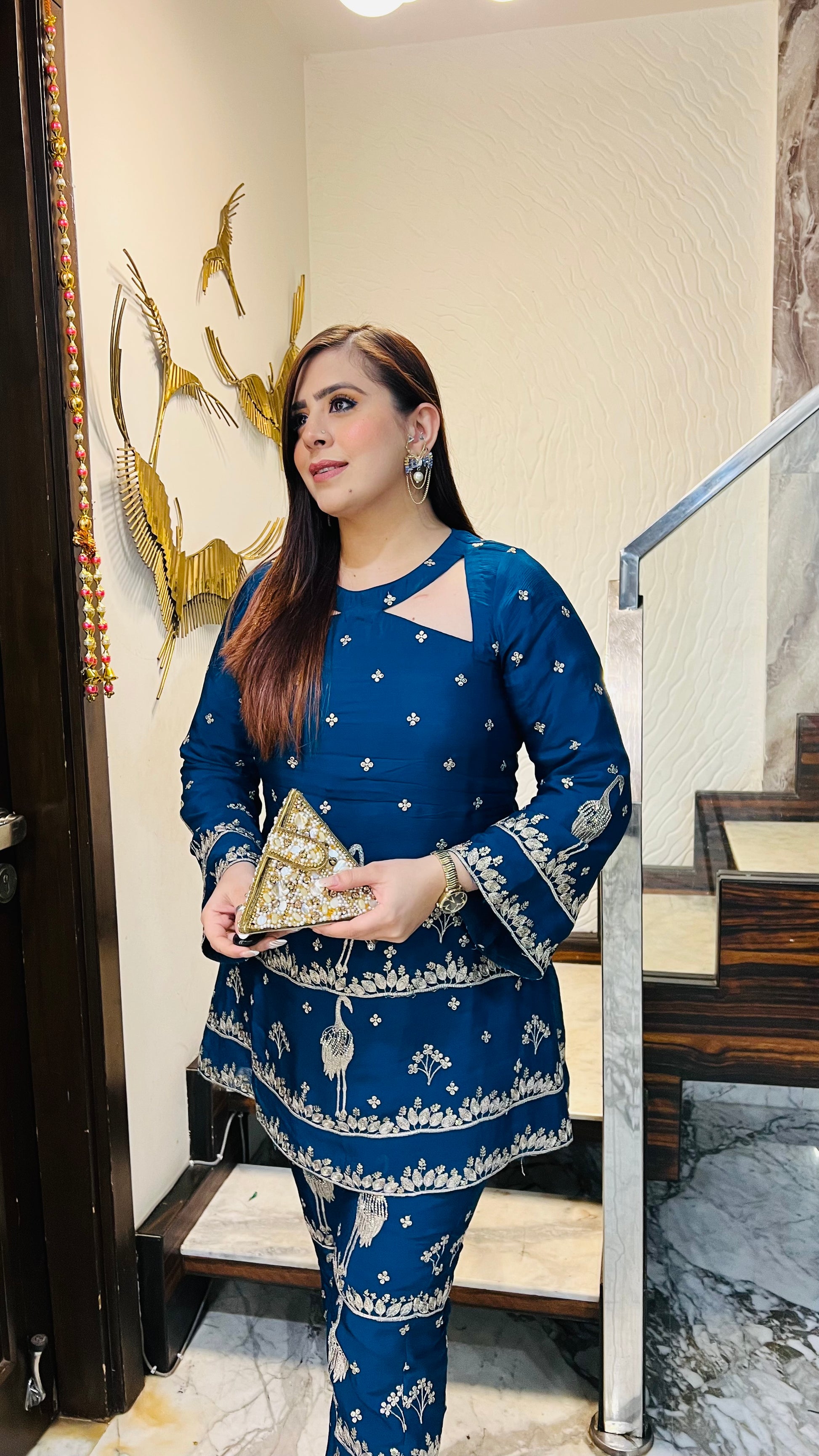 Brighten your celebrations with the Peacock Bird Co-Ord ☀️✨! Featuring a vibrant Peacock hue with delicate silver embroidery 🌼, this breezy, elegant outfit is perfect for any Occasion and festive vibes 🎉. |