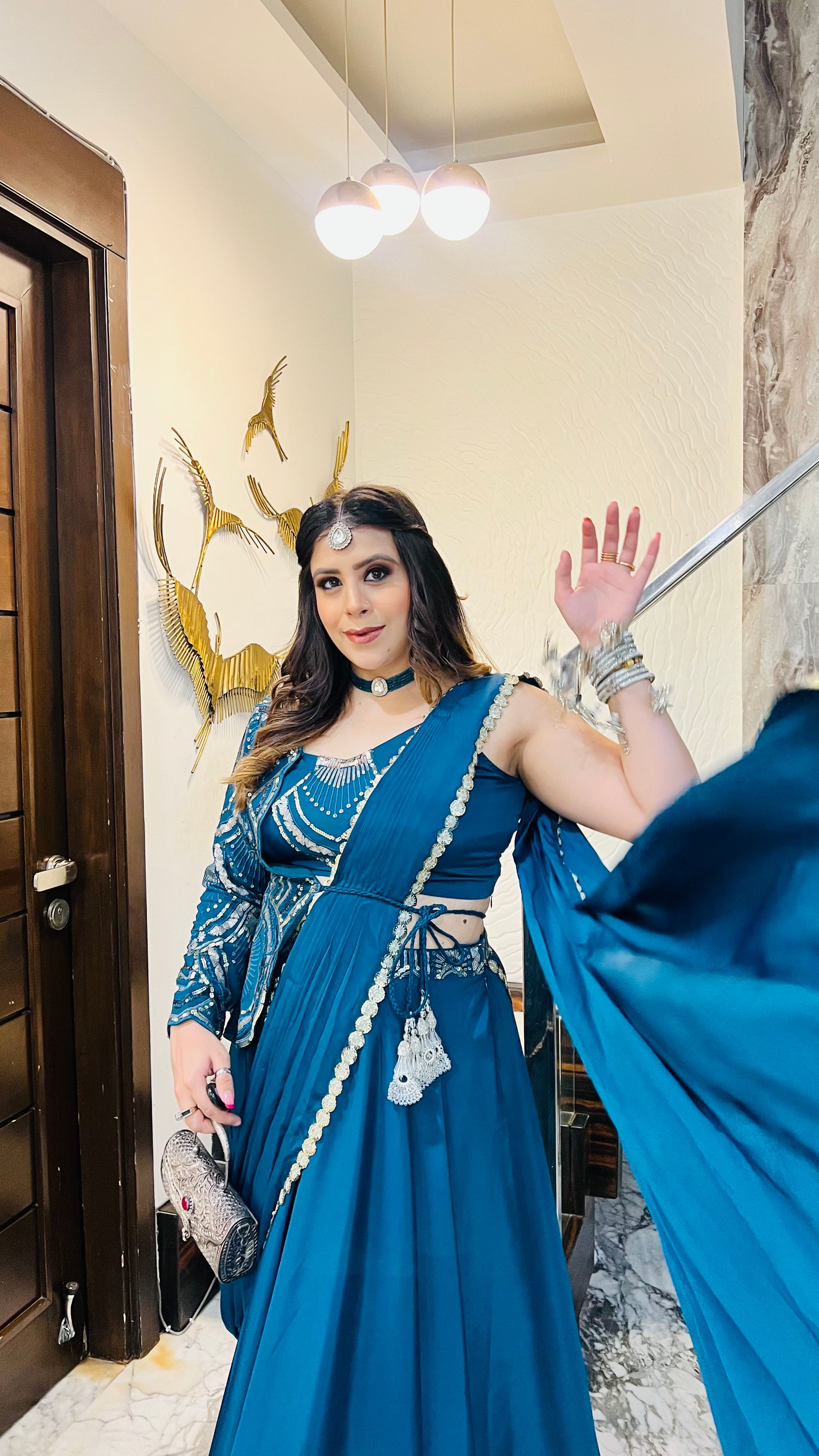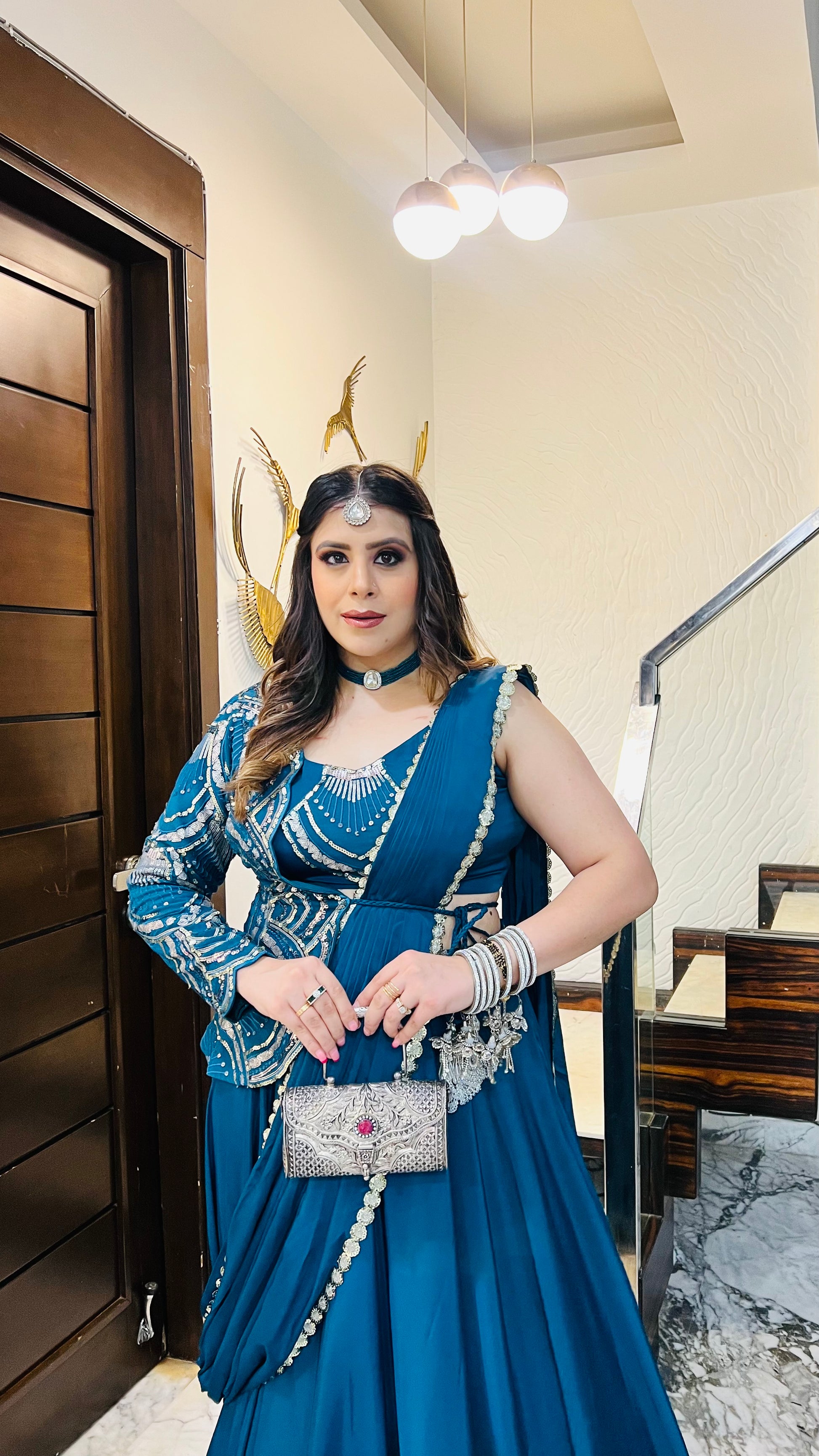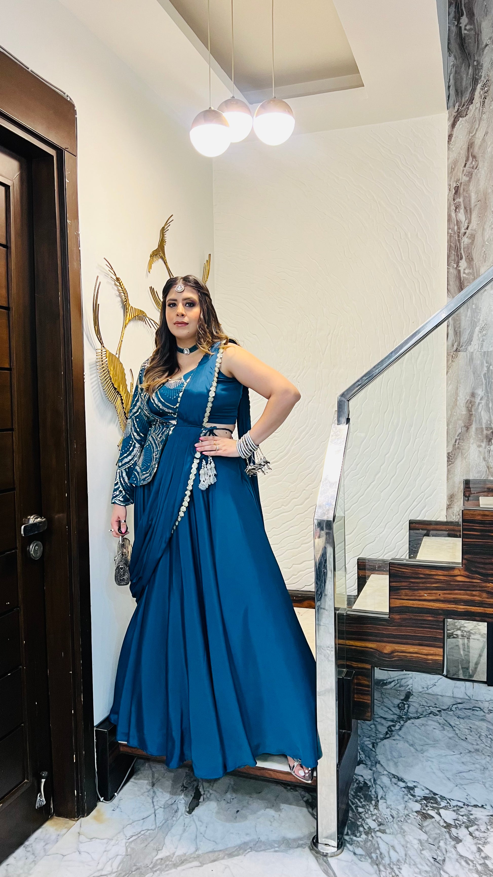 The Peacock Jacket Saree combines traditional elegance with a modern twist. Featuring a vibrant blue hue and an intricately embroidered jacket, it offers a statement look for festive occasions. 💙✨ |