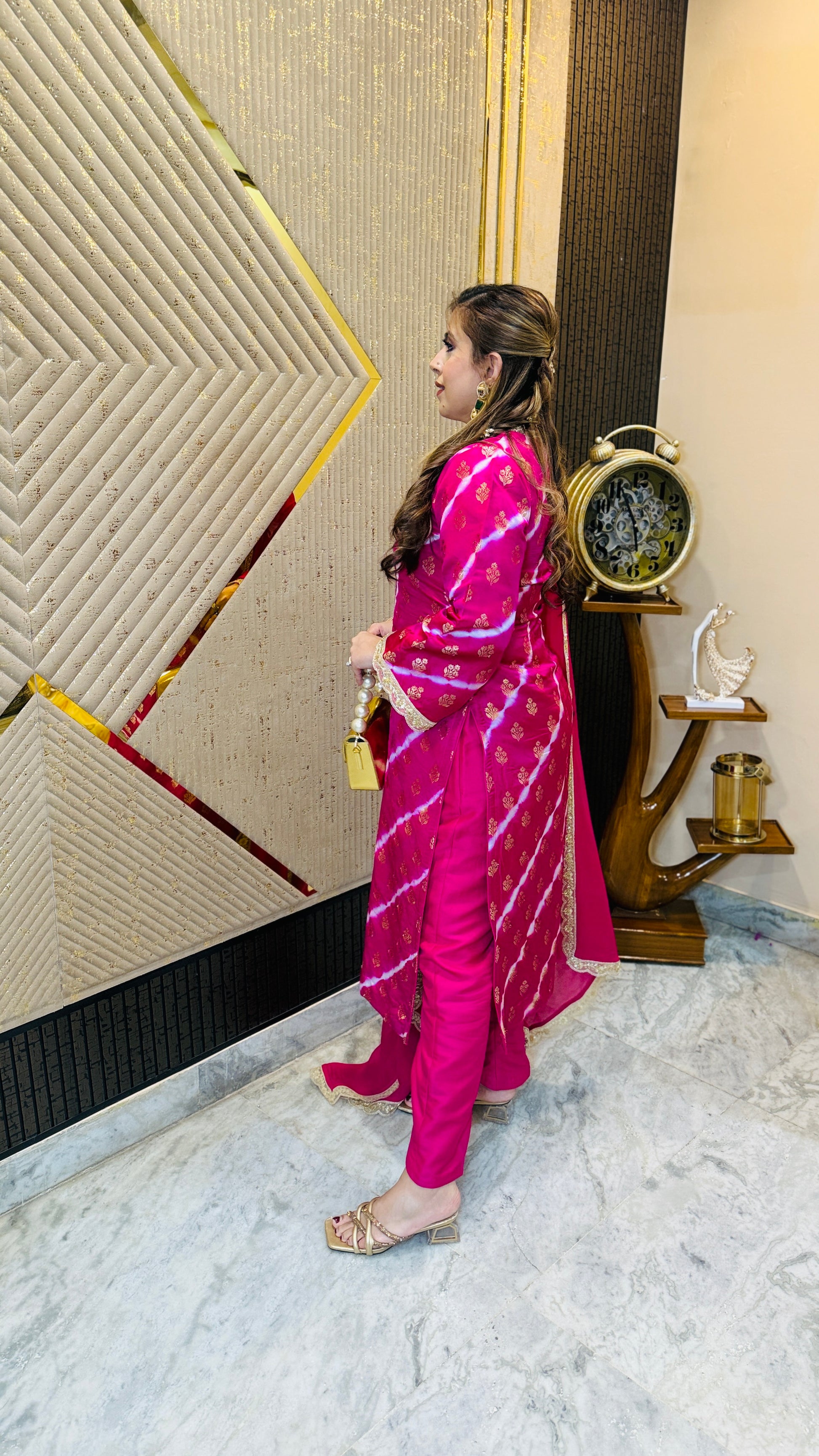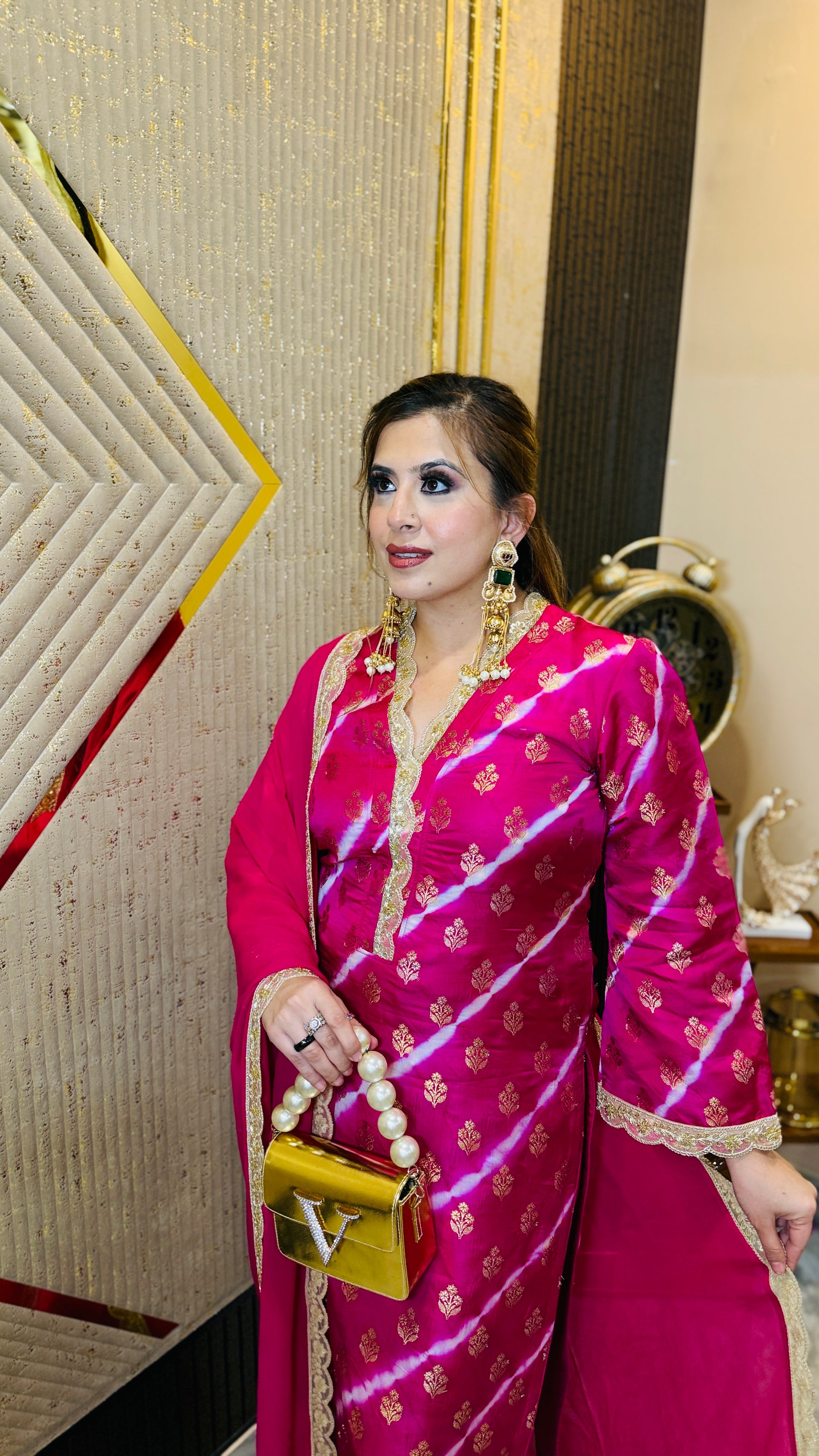 This vibrant hot-pink ethnic set features a gold-motif printed kurta with a lace-detailed neckline and sleeves. Paired with matching tapered pants and a flowy dupatta edged in golden lace, it exudes festive elegance. Perfect for weddings, family functions, and traditional celebrations with a rich, classy appeal.