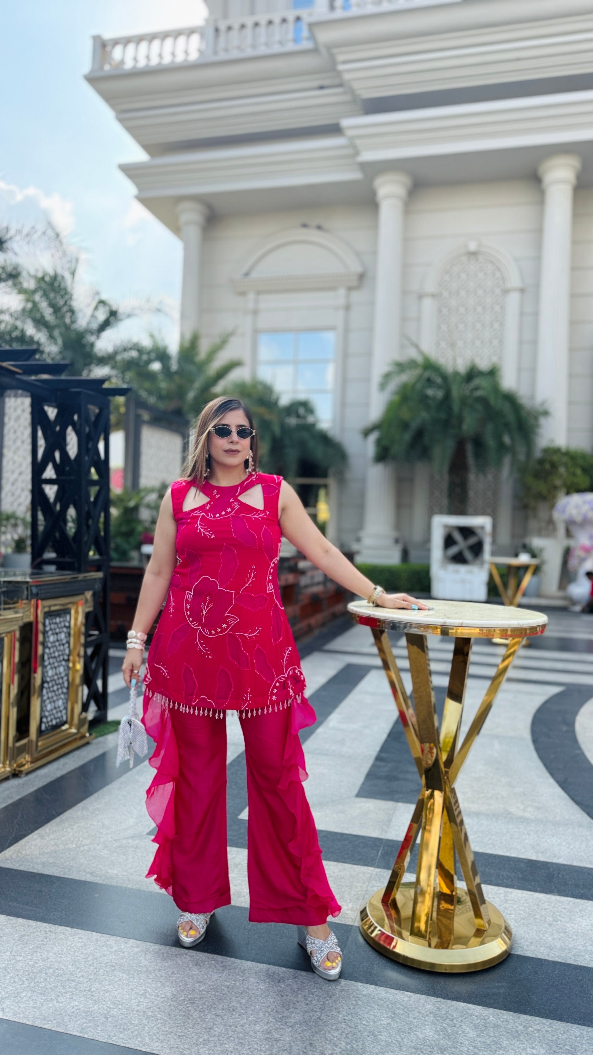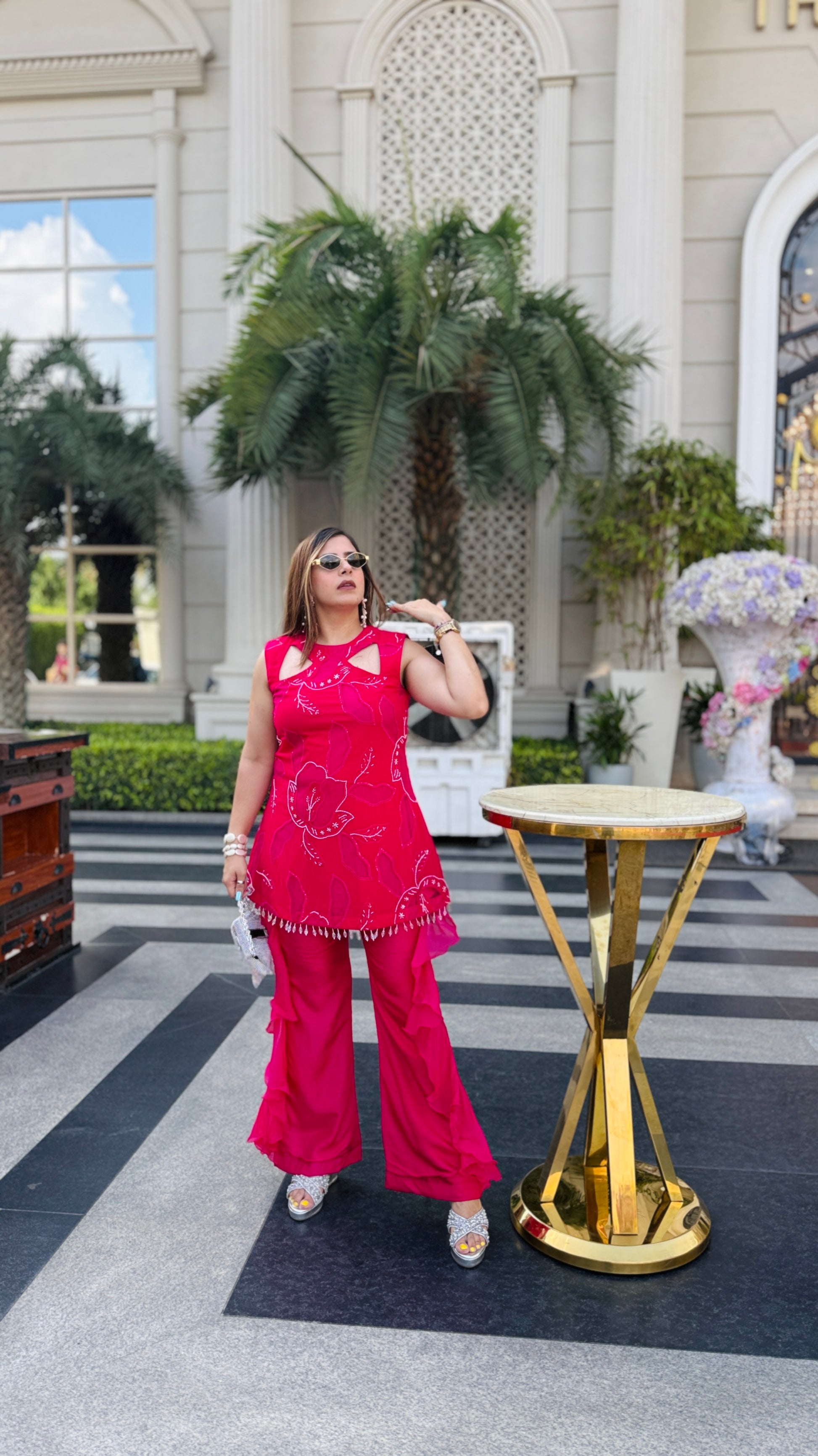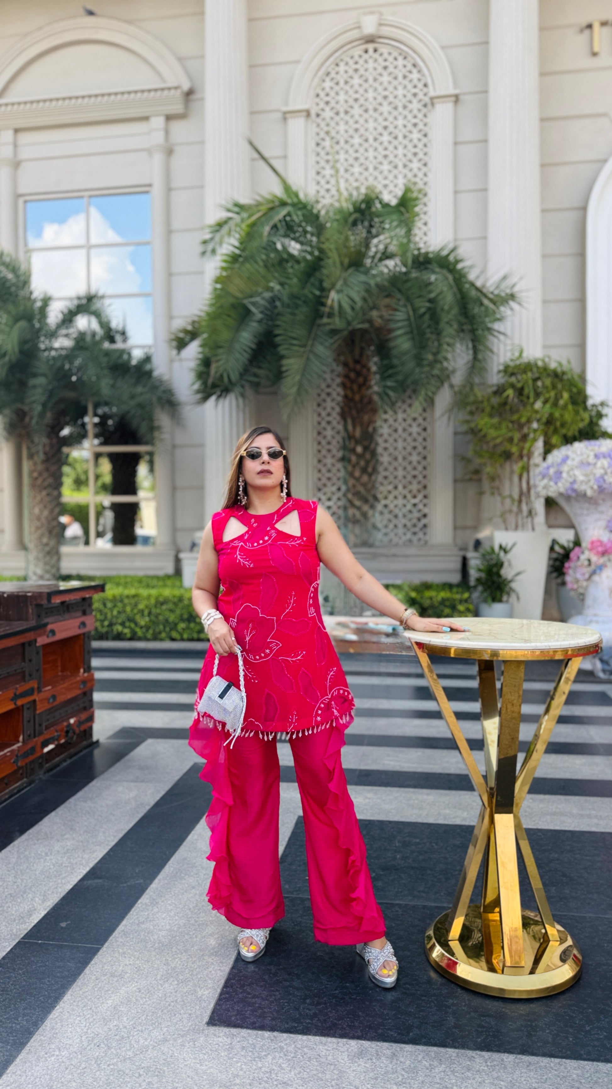 Turn heads in this Pink Hollywood Co-Ord 💖✨ Featuring chic cut-out detailing, bold floral embroidery, and dramatic ruffle pants 🎀👖—perfect for your glam moments under the sun! 😎🌸💃 |