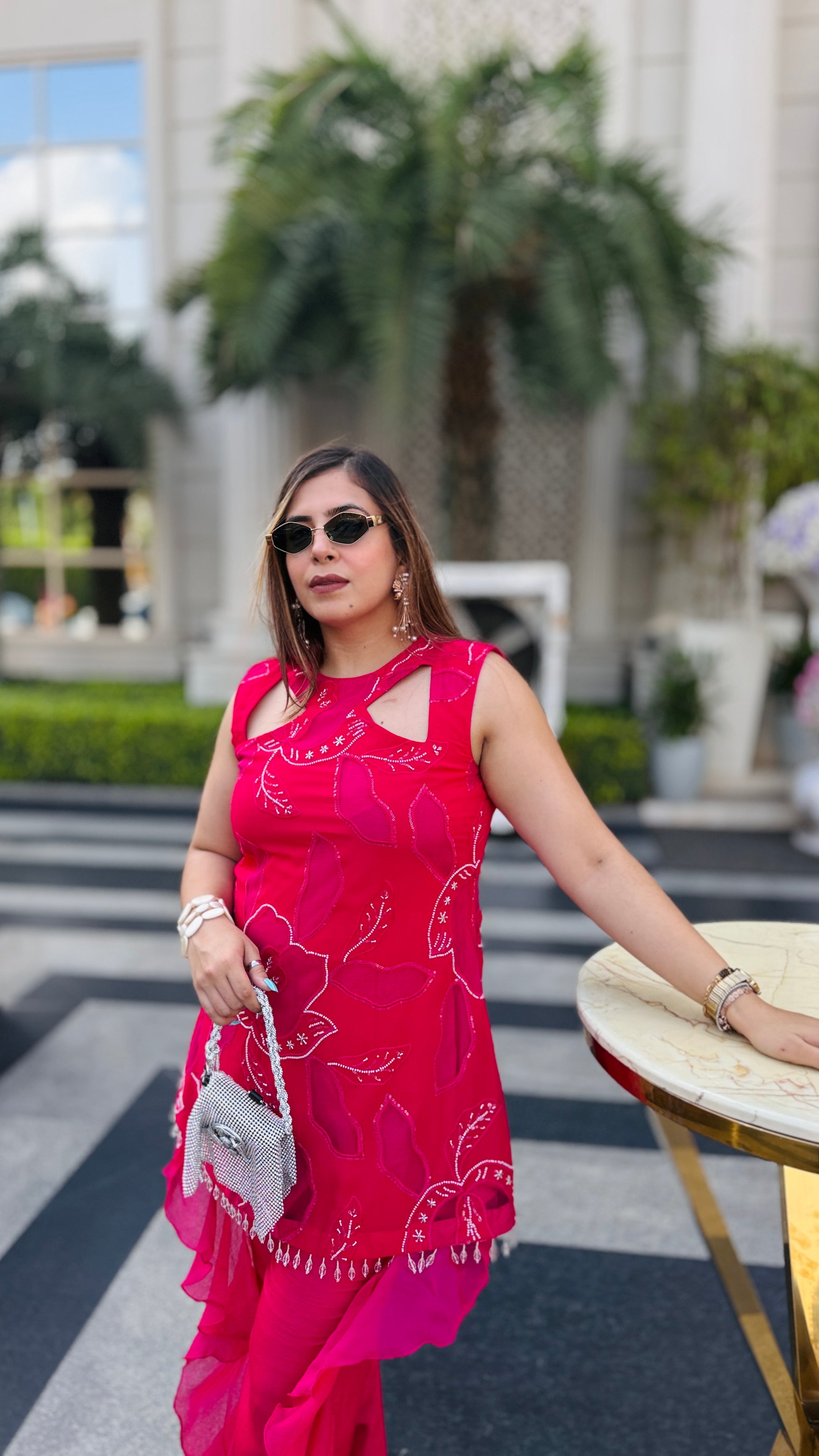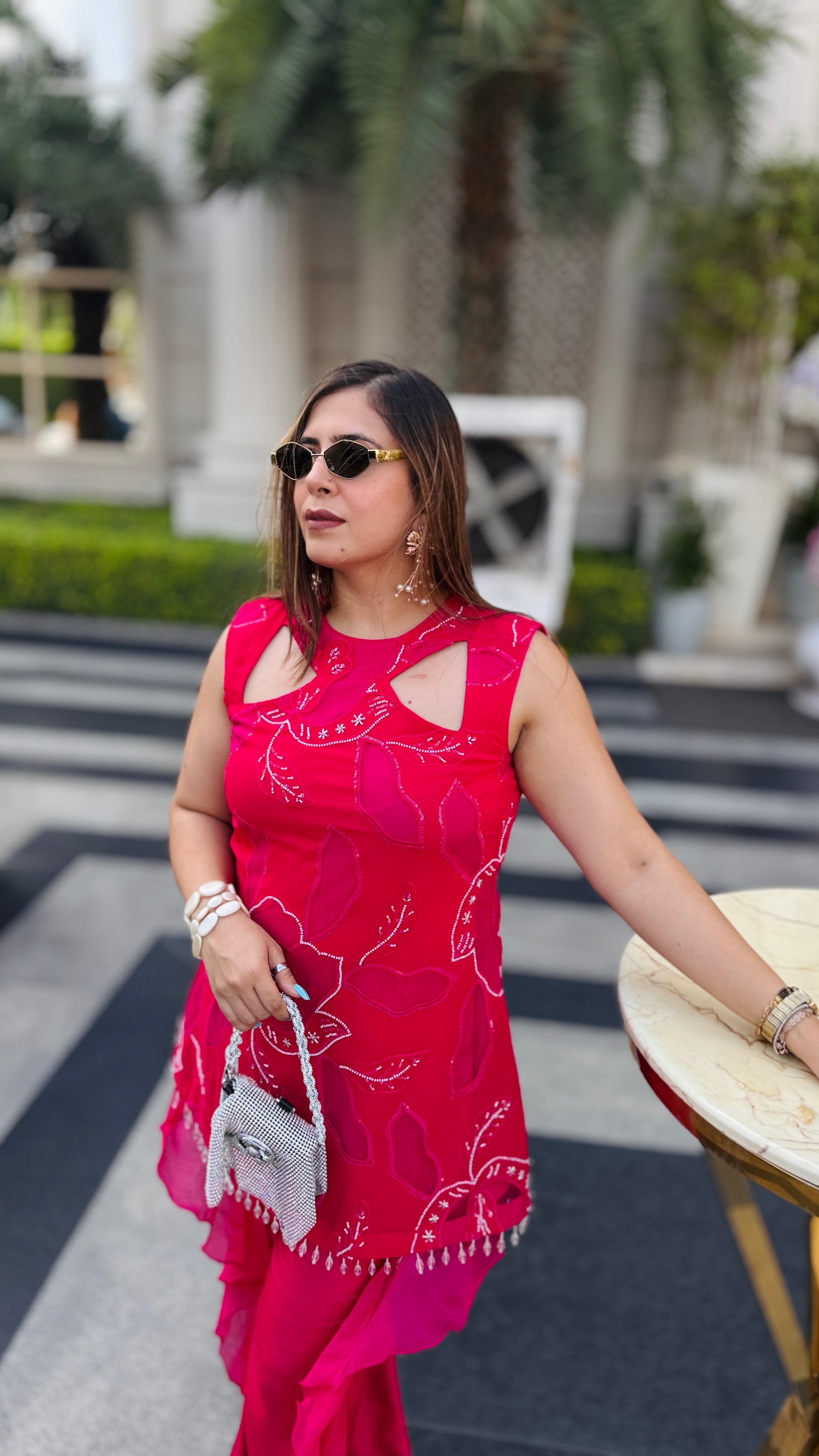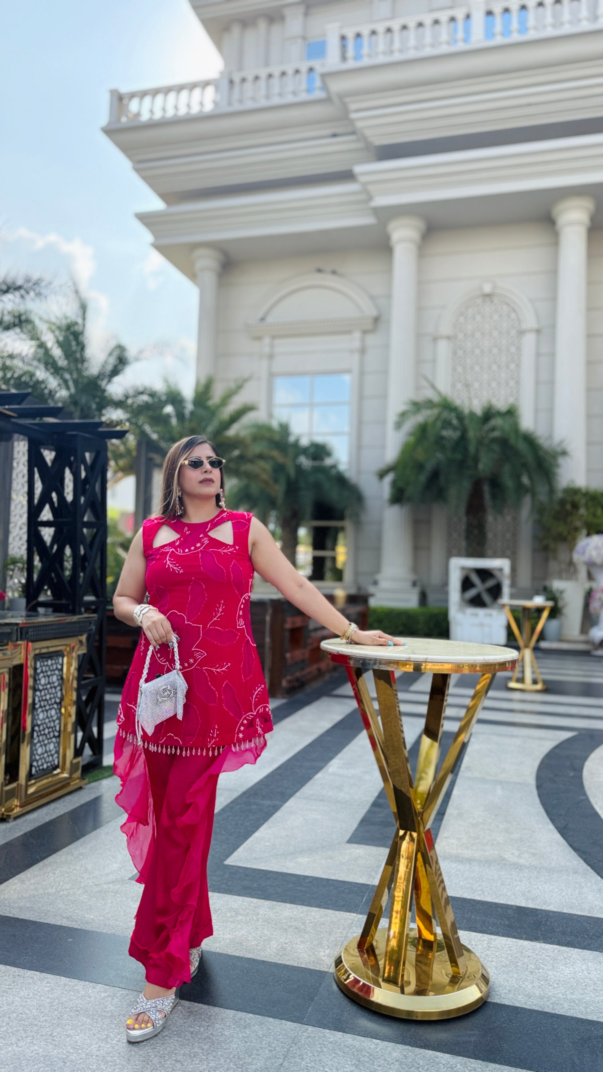 Turn heads in this Pink Hollywood Co-Ord 💖✨ Featuring chic cut-out detailing, bold floral embroidery, and dramatic ruffle pants 🎀👖—perfect for your glam moments under the sun! 😎🌸💃 |